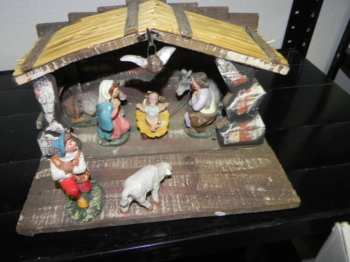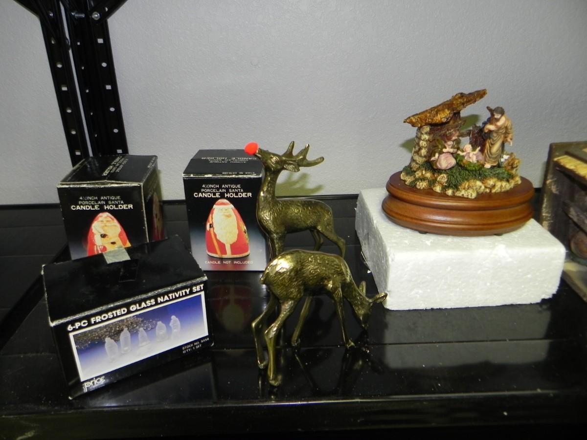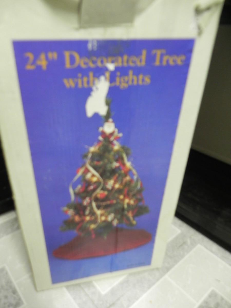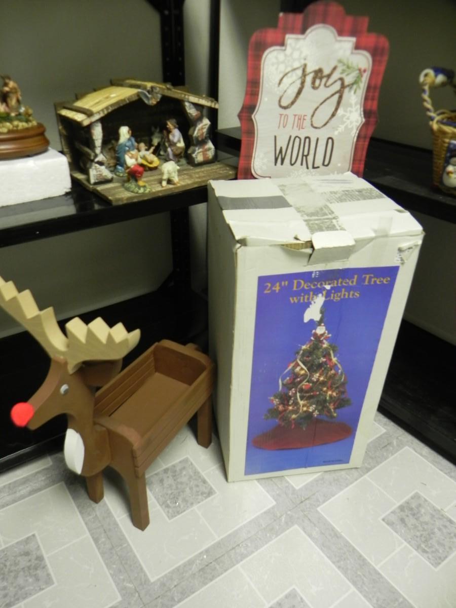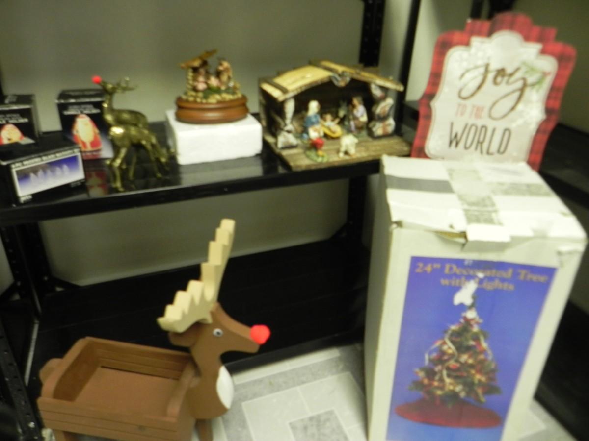 MUSIC BOX, 24" DECORATED TREE, WITH LIGHTS, MANAGER BRASS REINDEER AND MORE