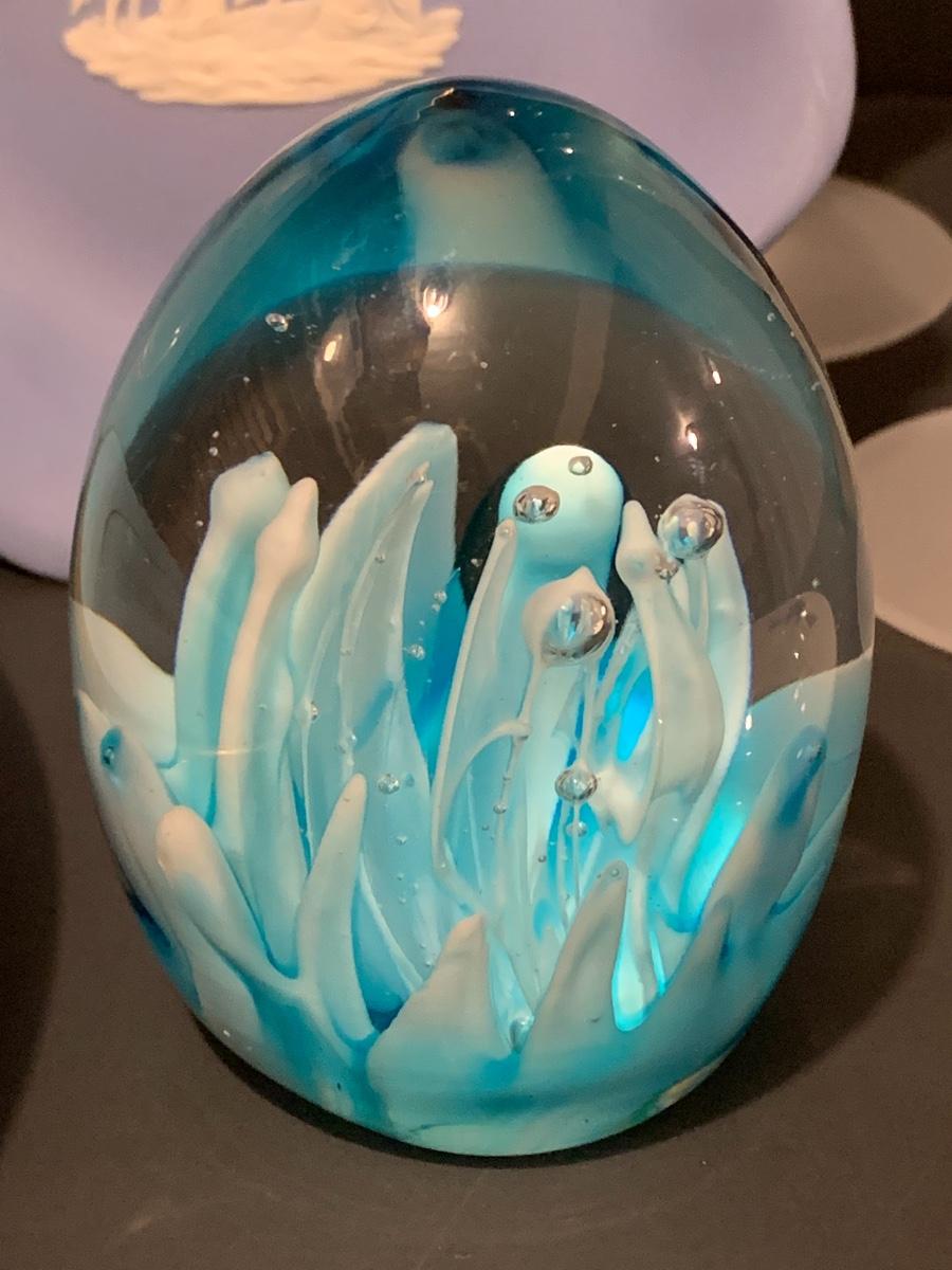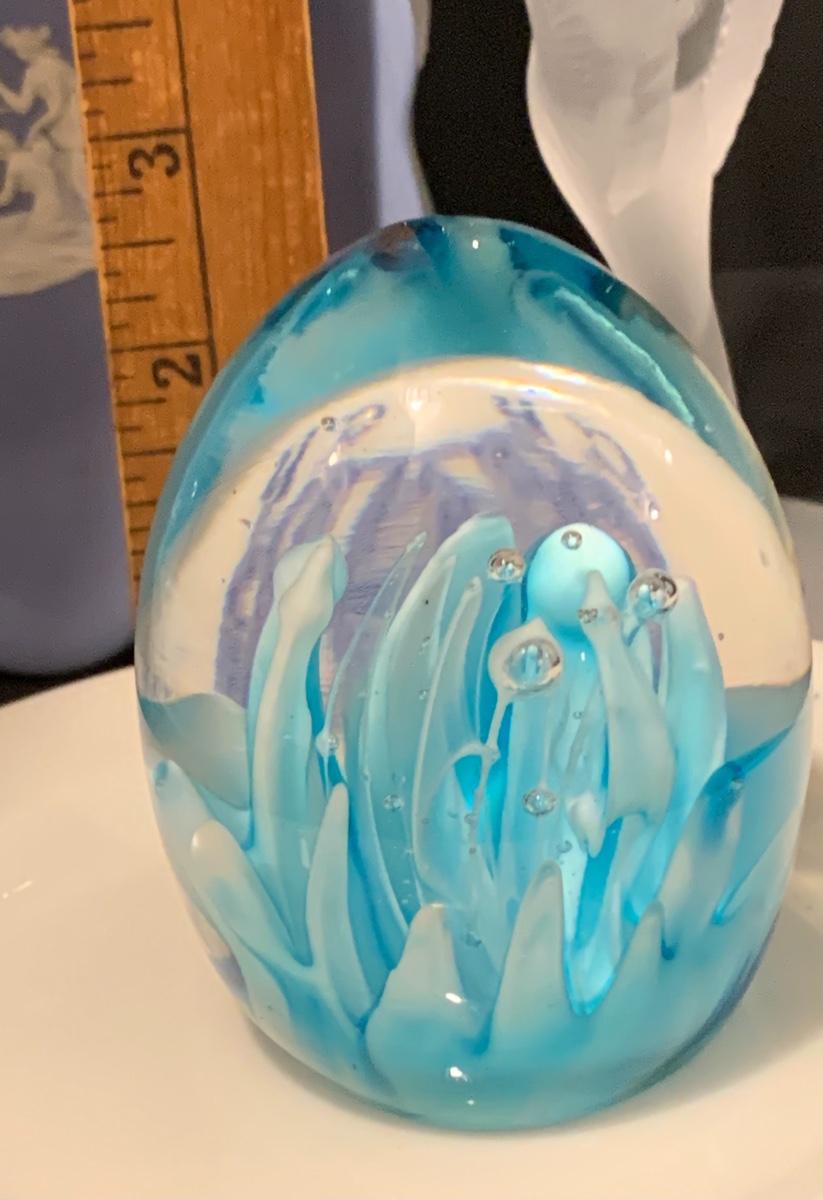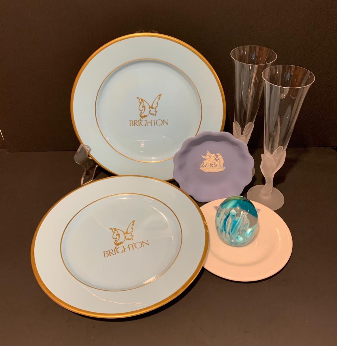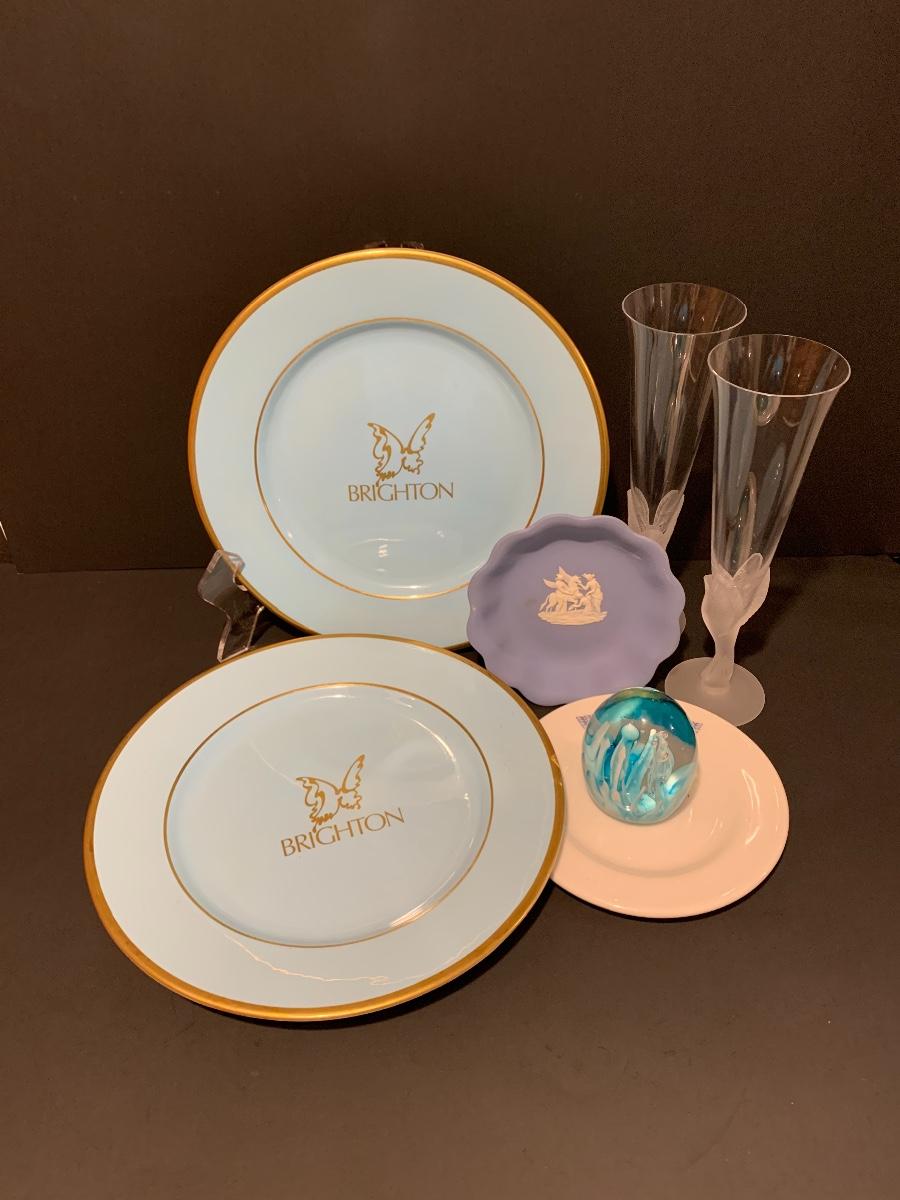 Lovely collection in blue including: Wedgwood trinket plate, Shenango China "Brighton" Plates 10 1/2 Inches, Art Deco frosted bird & crystal flute, Murano Glass Paperweight, and a Royal Doulton plate..