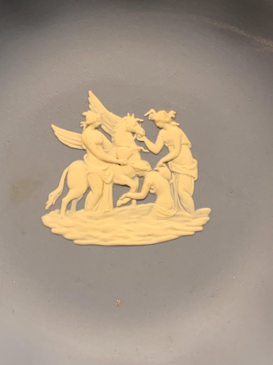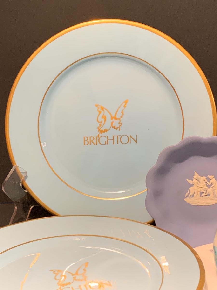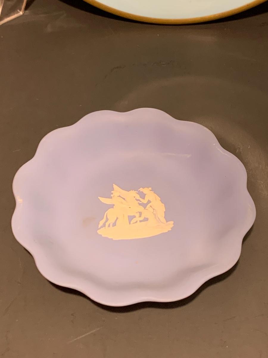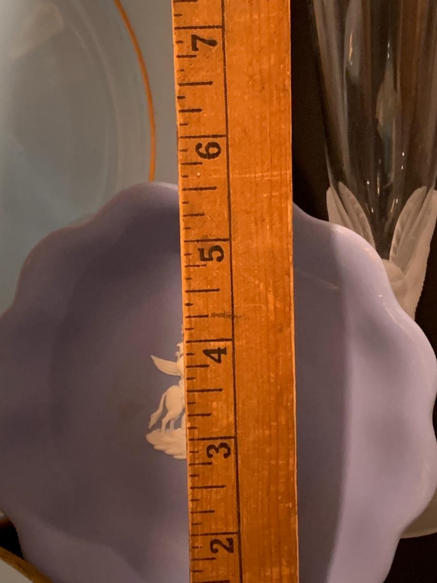 Lovely collection in blue including: Wedgwood trinket plate, Shenango China "Brighton" Plates 10 1/2 Inches, Art Deco frosted bird & crystal flute, Murano Glass Paperweight, and a Royal Doulton plate..