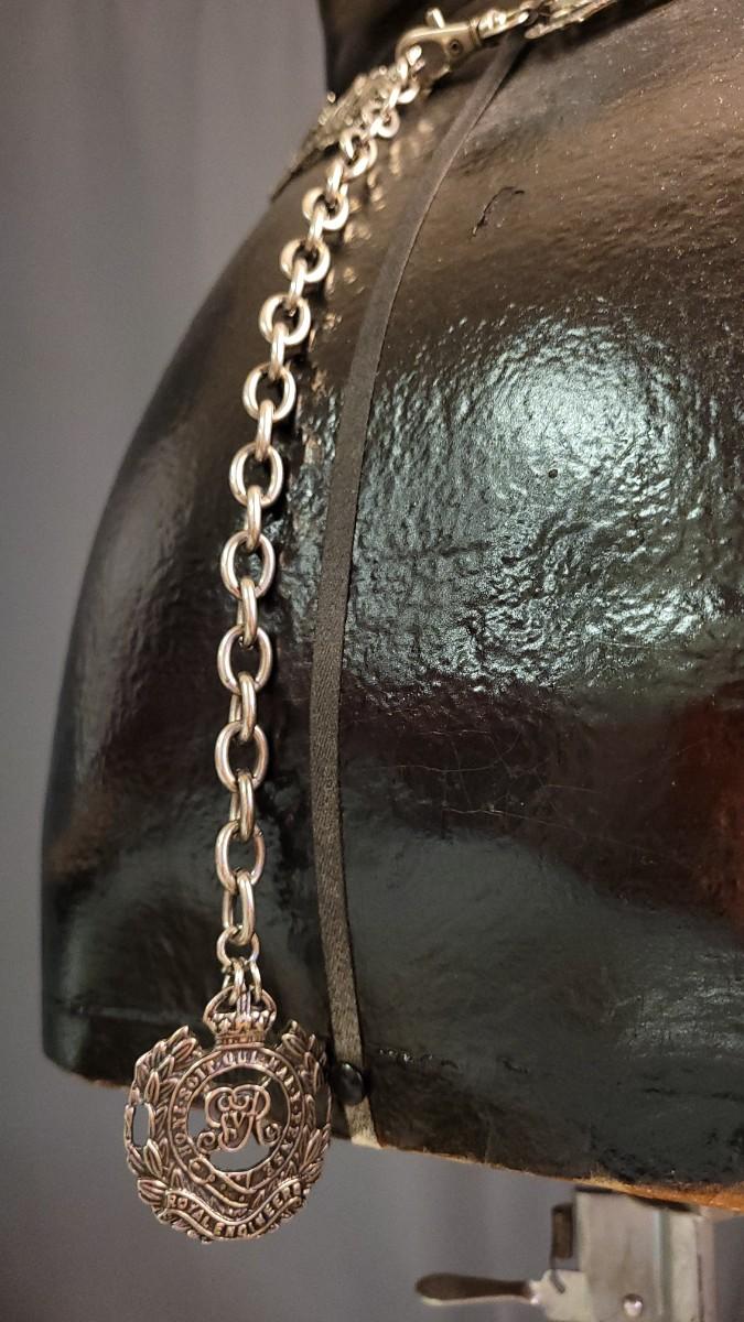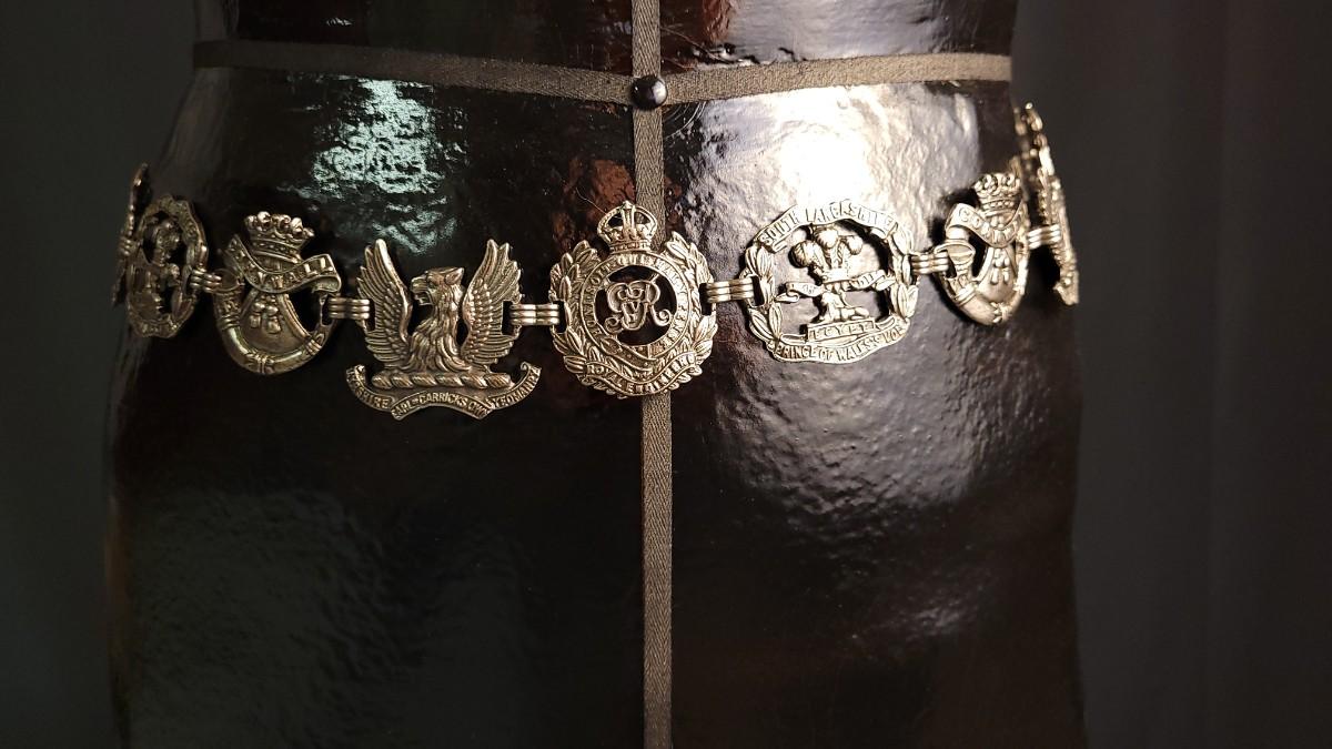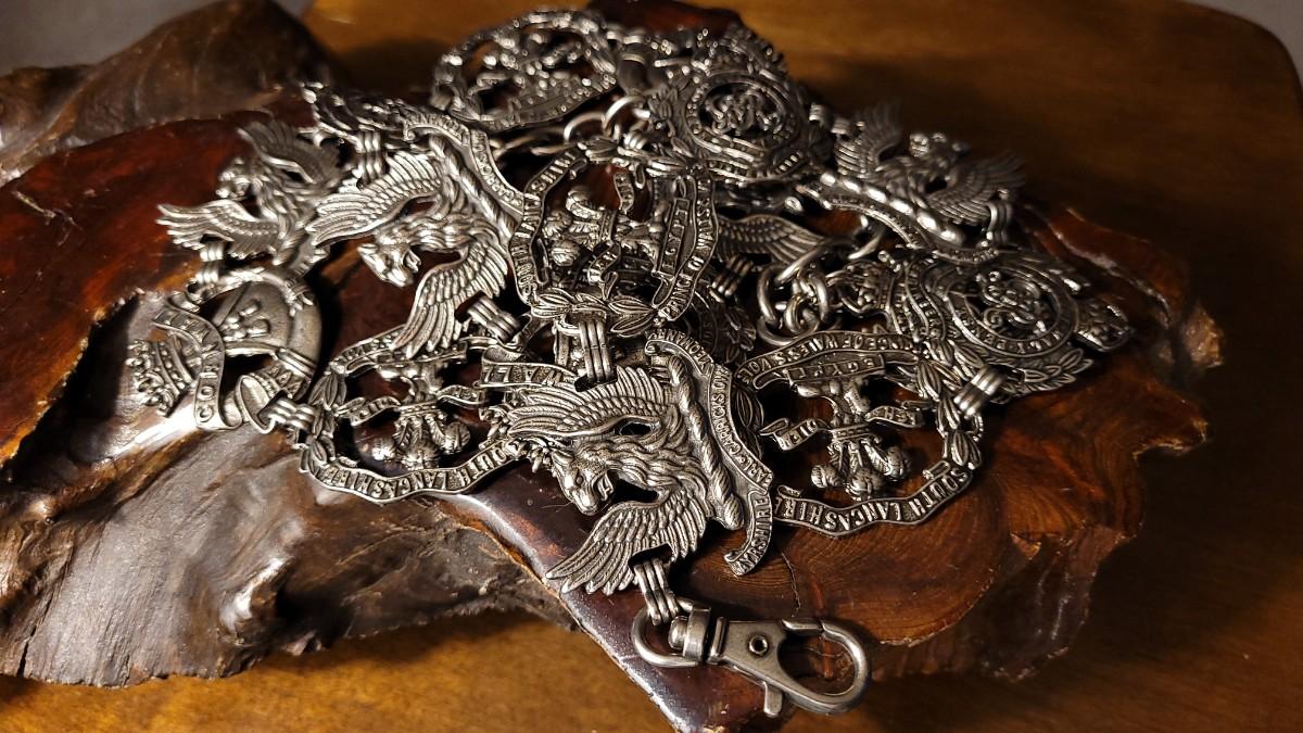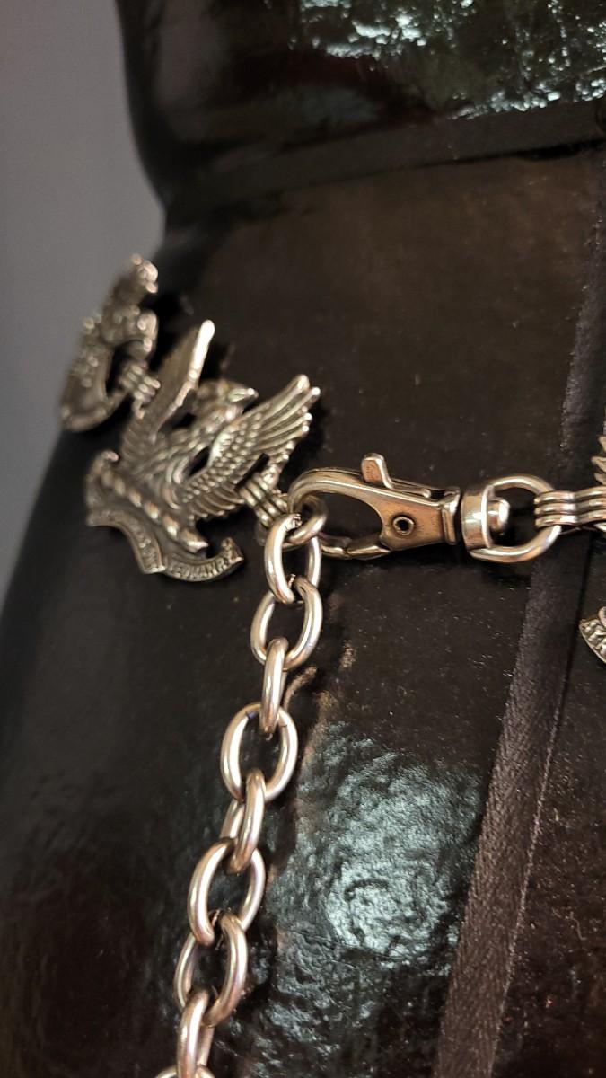This adjustable belt attached by metal Clasp and features (4) repeating crest designs that are each shown in the photos. Belt section is about 29". Link Clasp section adds another 10" to allow for closures from 30" to 40" waist. Each crest is about 2" Wide.