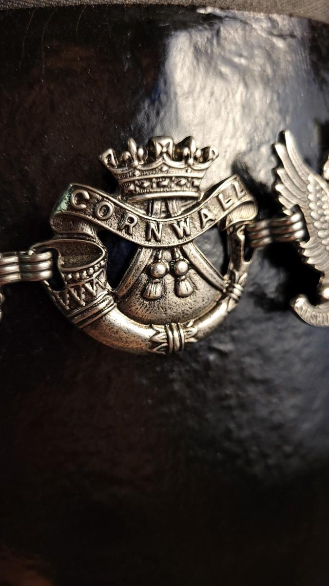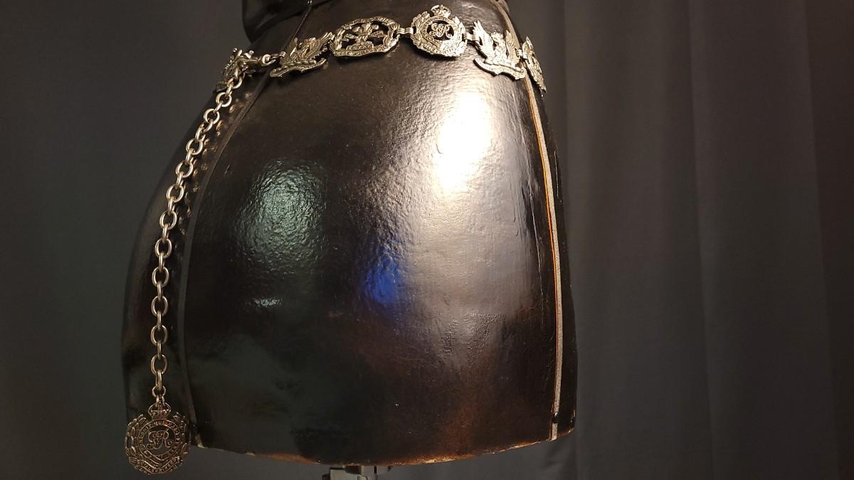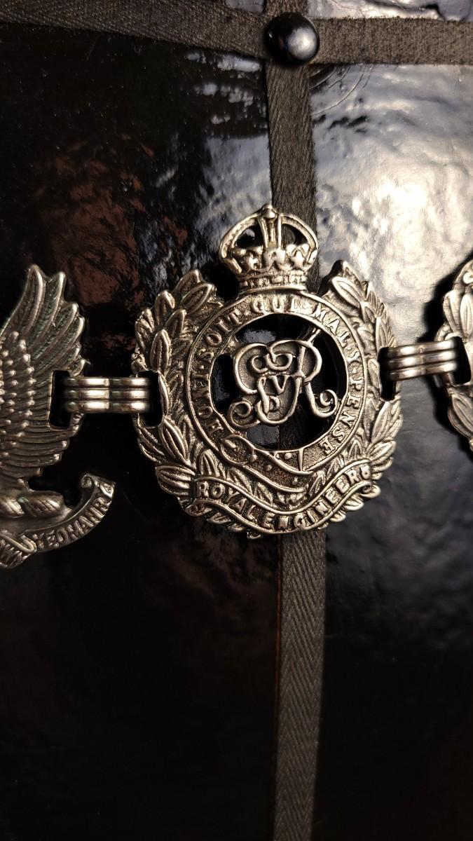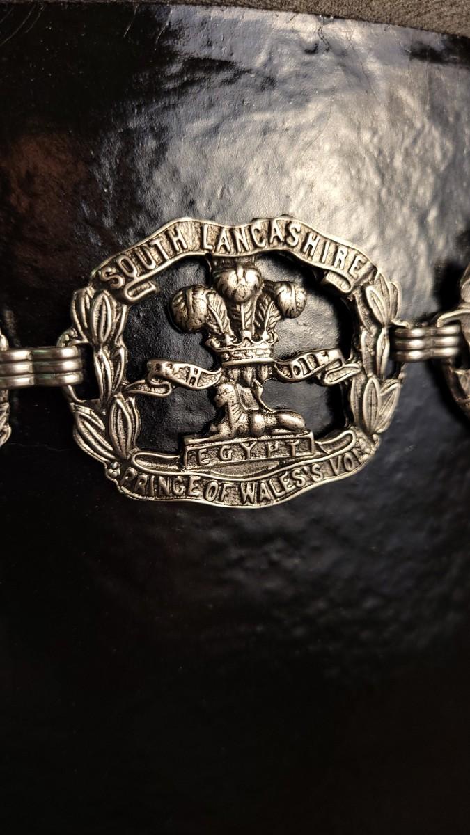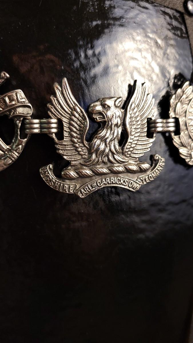 This adjustable belt attached by metal Clasp and features (4) repeating crest designs that are each shown in the photos. Belt section is about 29". Link Clasp section adds another 10" to allow for closures from 30" to 40" waist. Each crest is about 2" Wide.