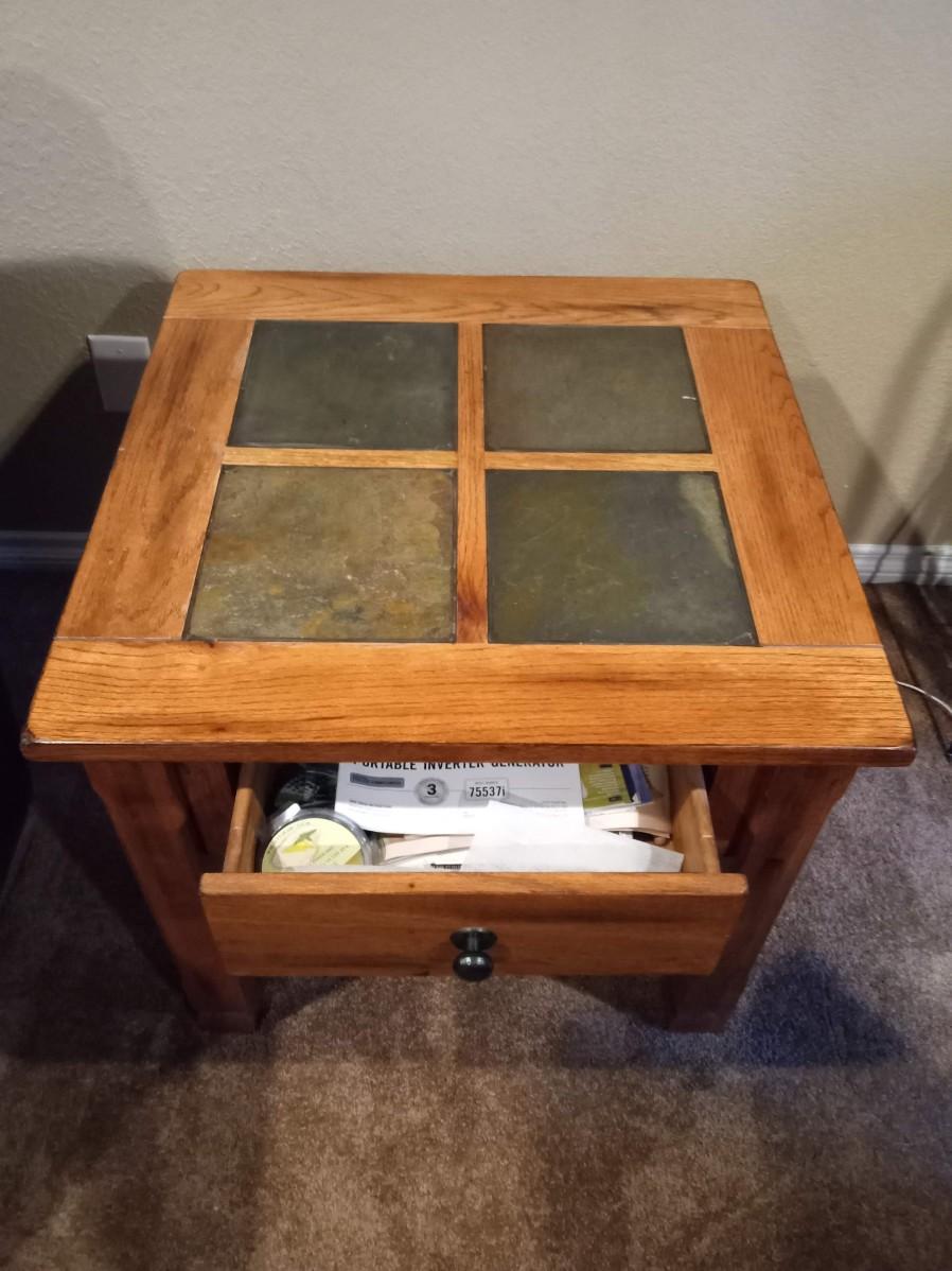 LOT 255  TRAVERTINE TOP END TABLE WITH 1 DRAWER