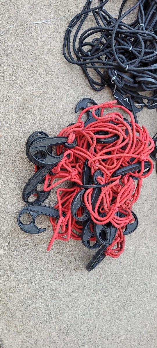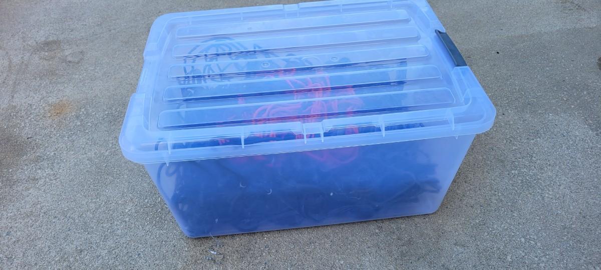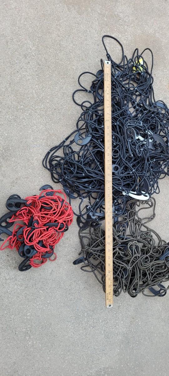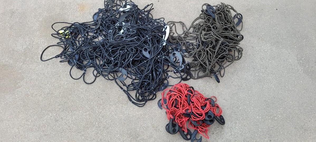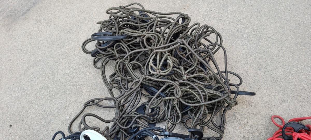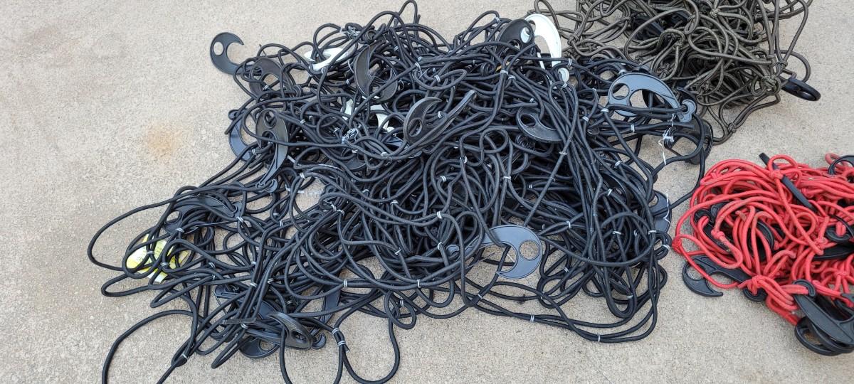 This clear tote contains an assortment of different cargo nets with Hooks.