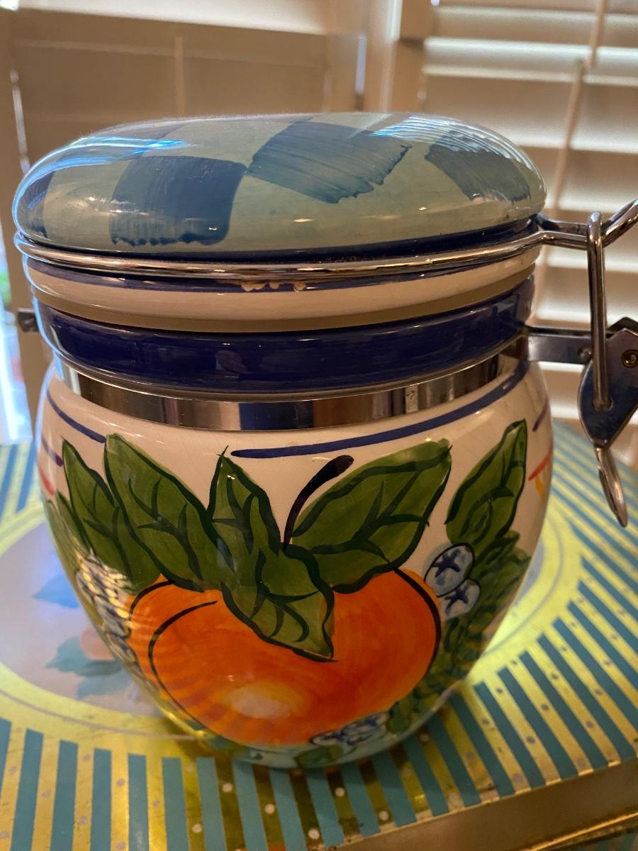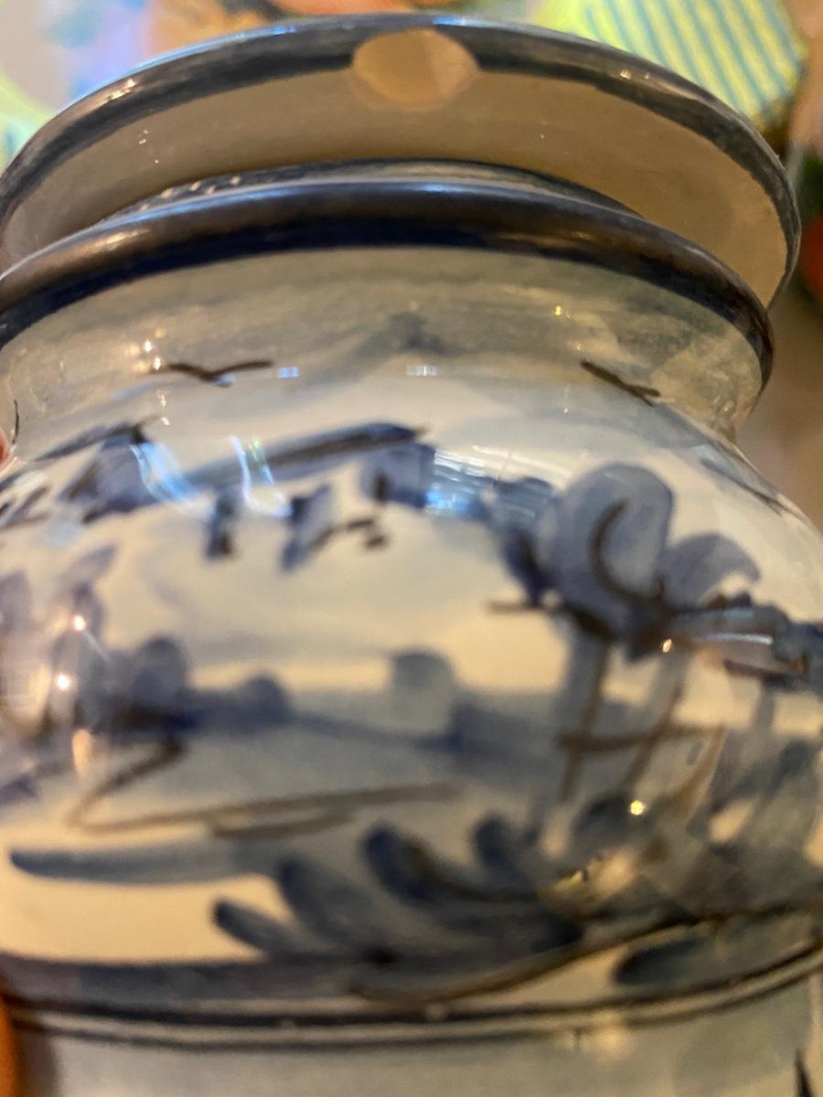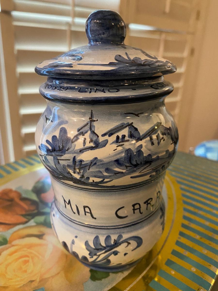 Blue and white Mia Cara with lid (5”h has a chip in lid
