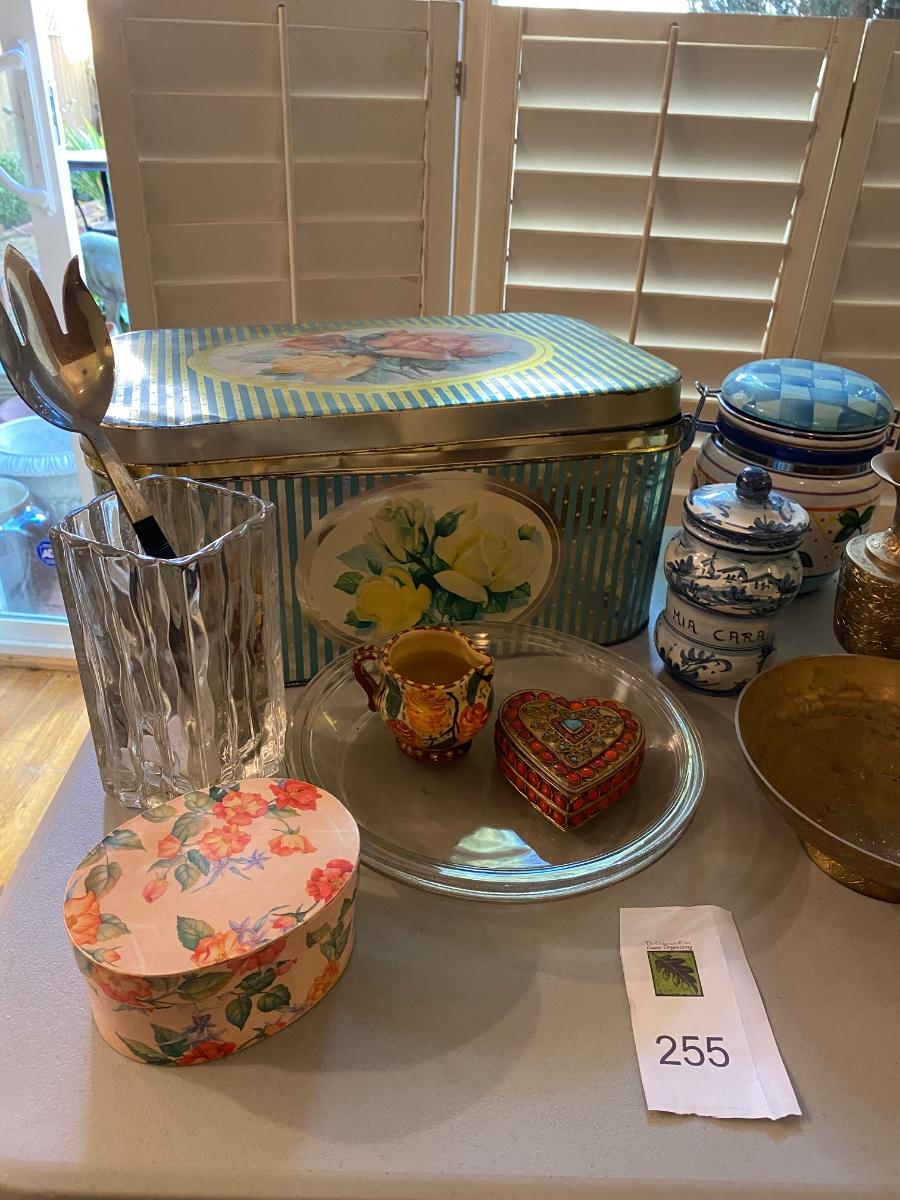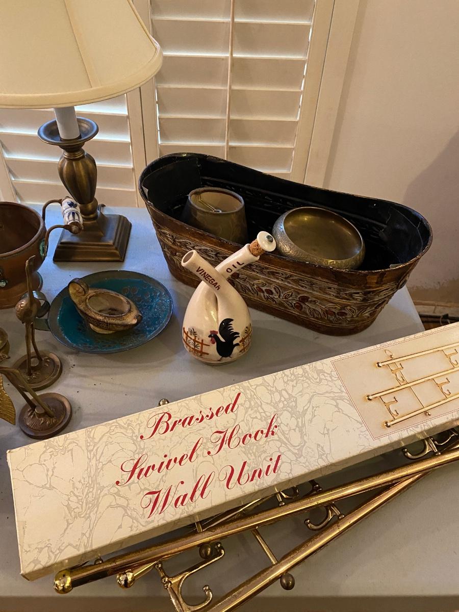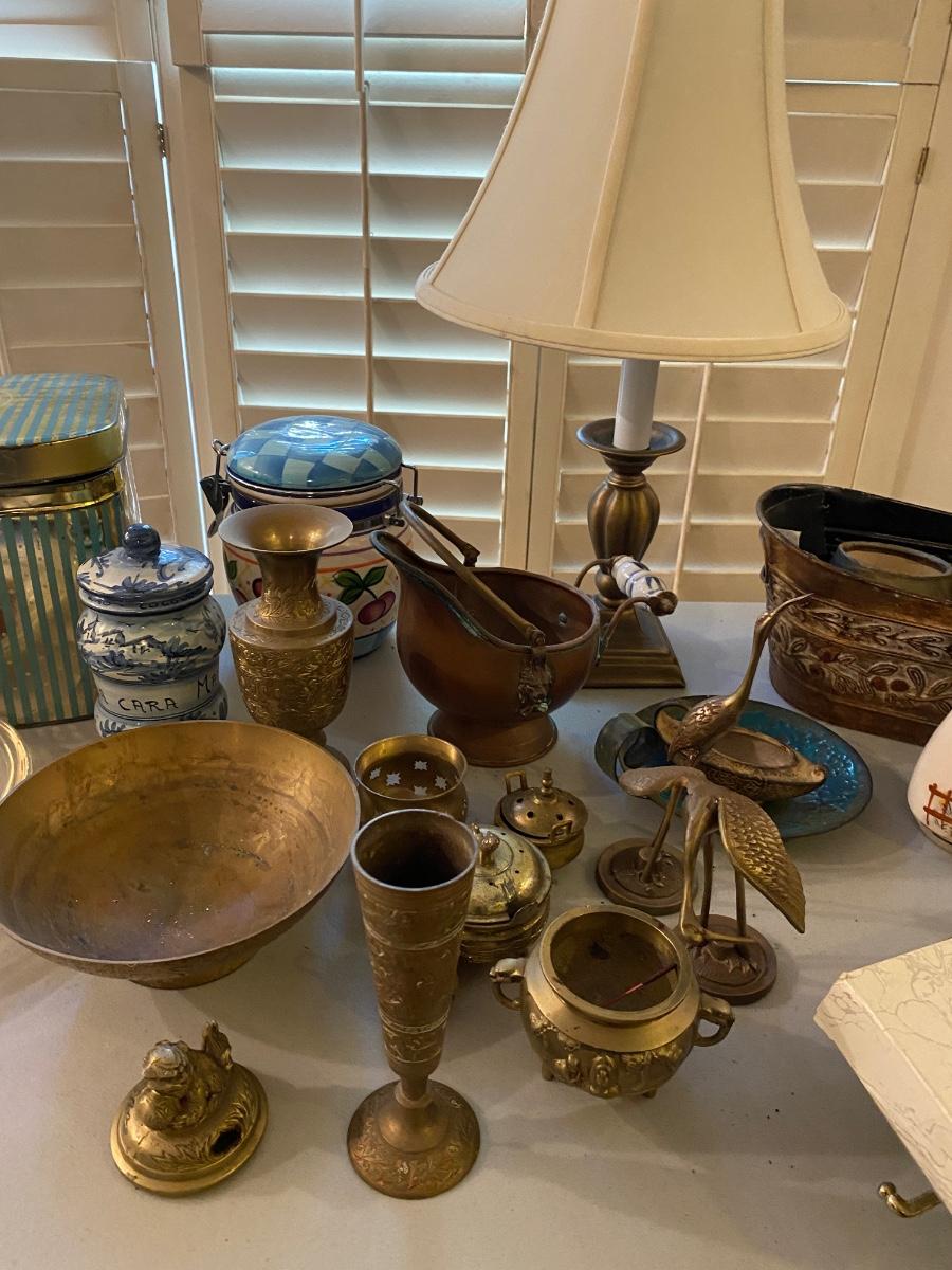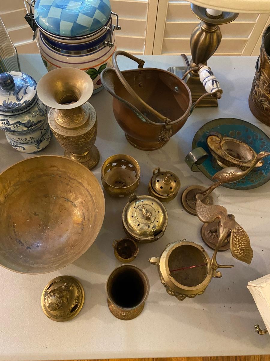 Collection of incense burners, brass bowls, table lamp, tins and more.