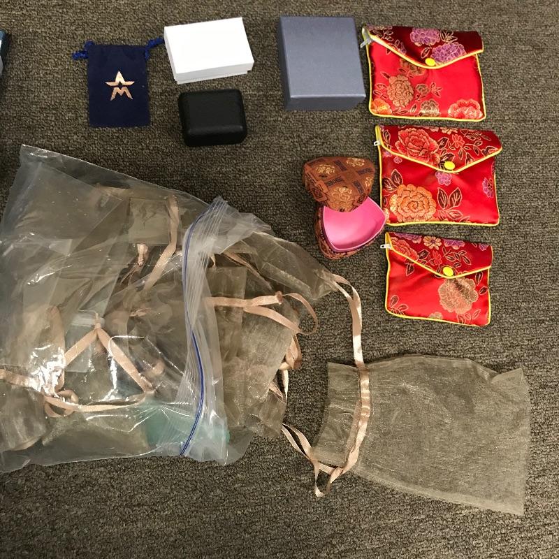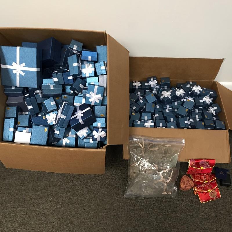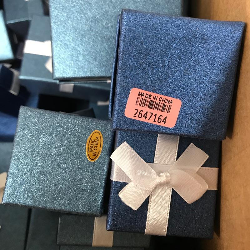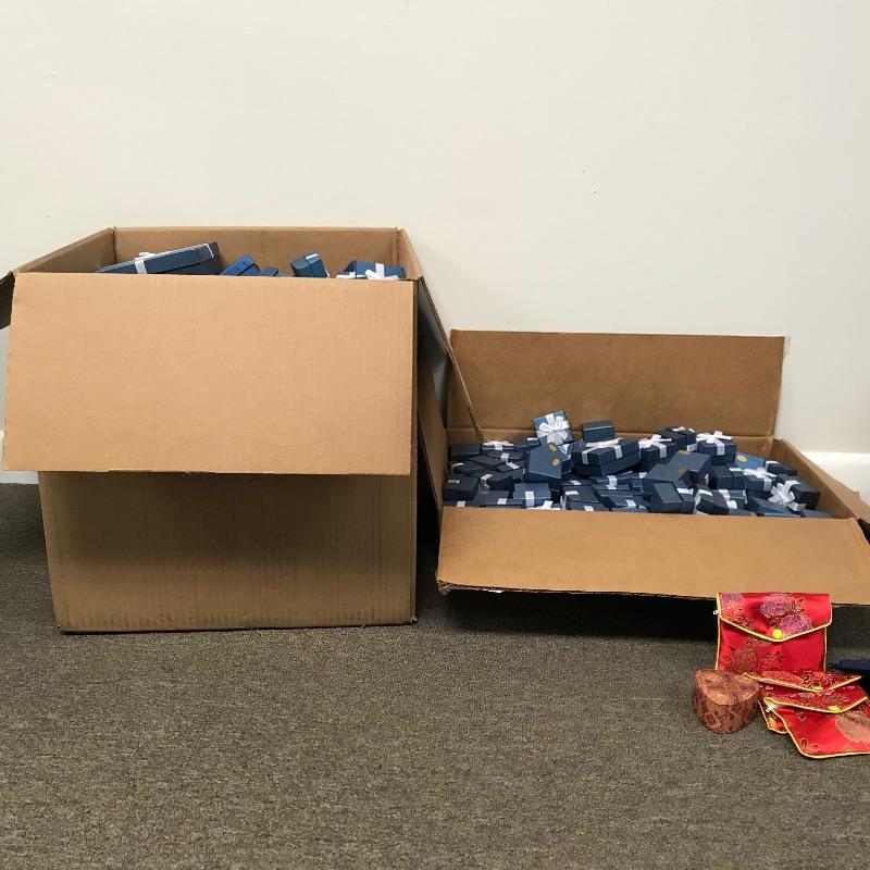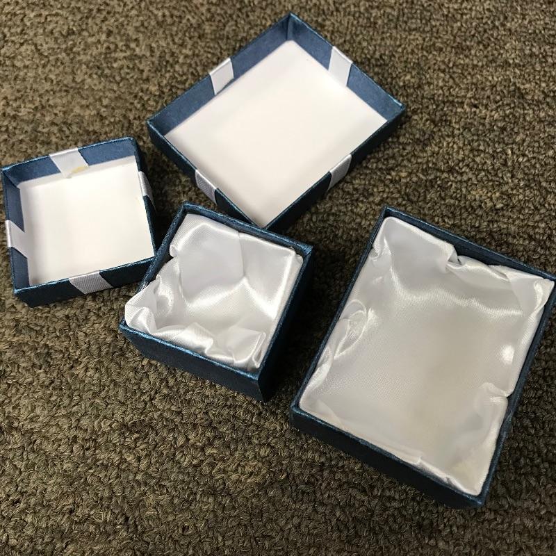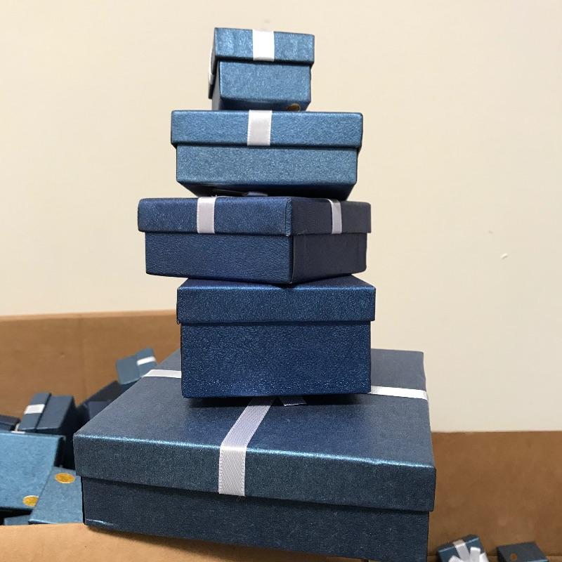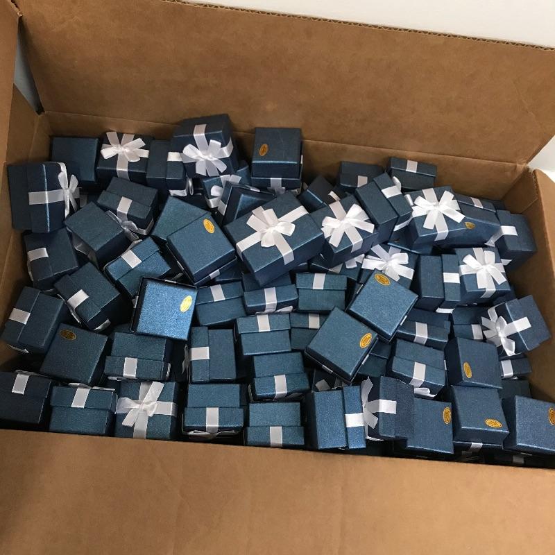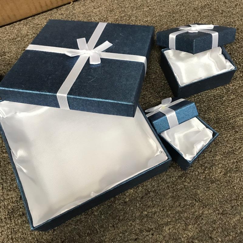 Two large boxes of various sized little blue jewelry boxes. We assume the majority came originally from QVC. Some have bows and satin-like lining and some have foam inserts. Lot also include cloth pouches and few other jewelry boxes. See photos. Largest corrugated cardboard box holding the gift boxes measures 16” x 17” x 17”. Standard UPS rates will apply for shipping. Please call UPS with dimensions at 828-252-6930 for a shipping quote prior to bidding.