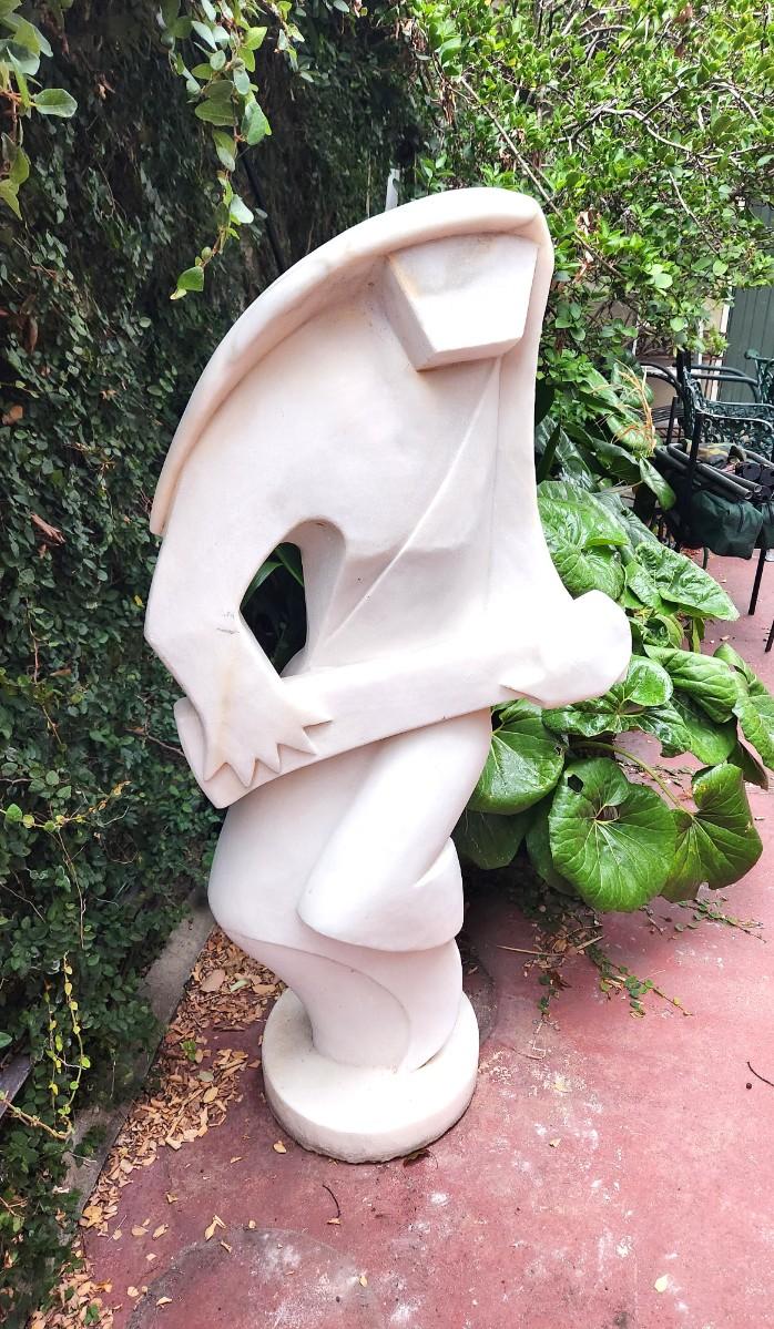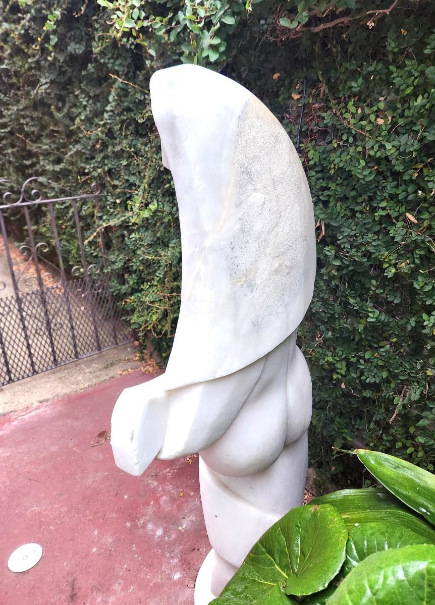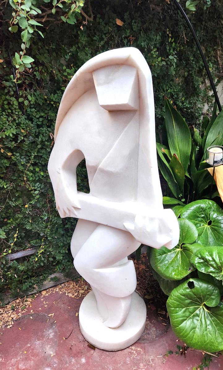 Sexless indoor/outdoor figure with stringed instrument - done in solid marble/alabaster. Has some repaired damage to the base. 55" tall, 25" wide. Lovely piece (unsigned) but to say this is heavy is an understatement. Buyer is completely responsible for moving/loading - we cannot assist.