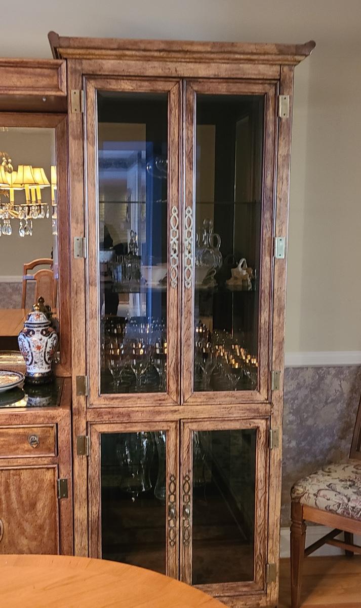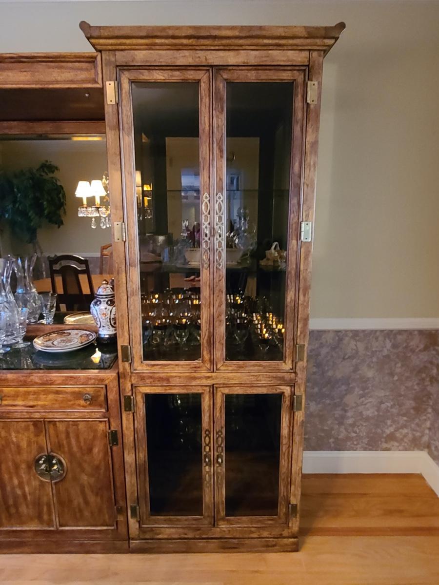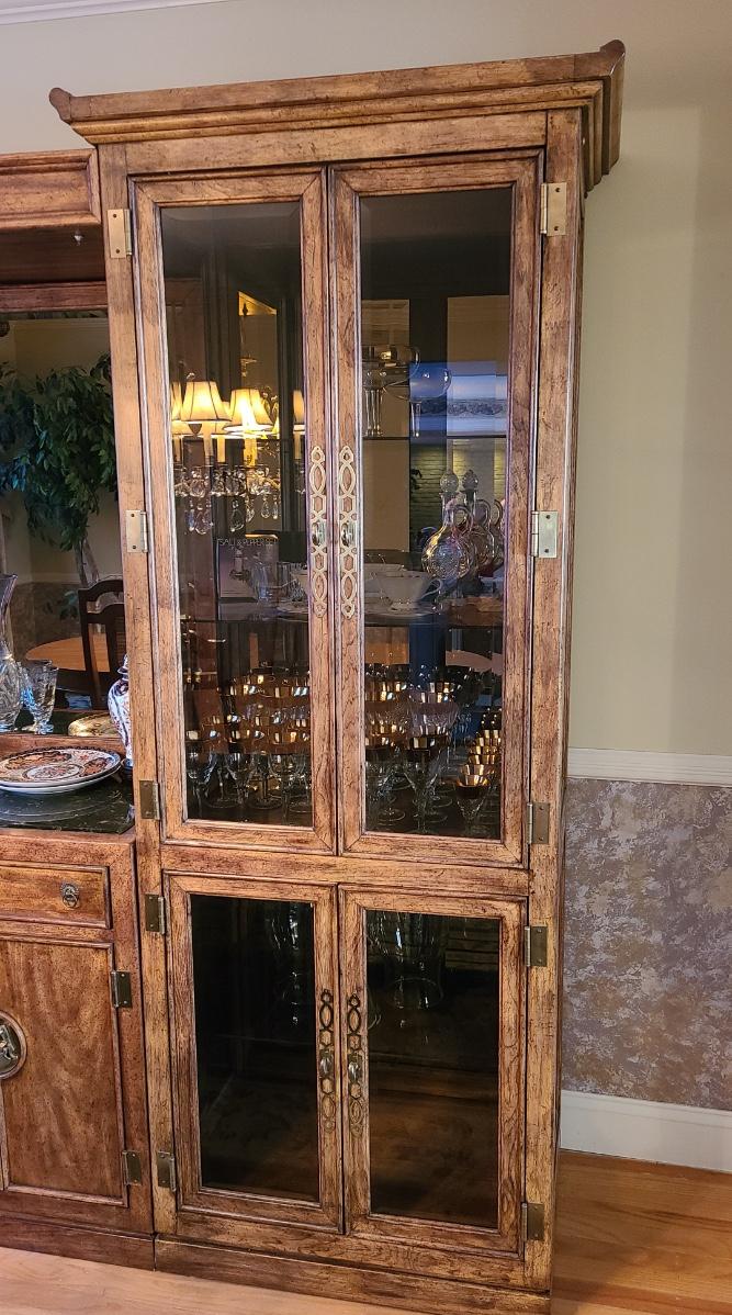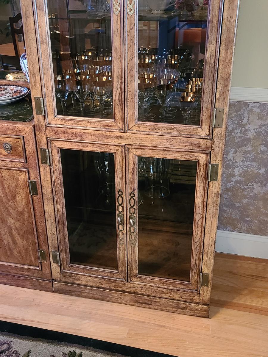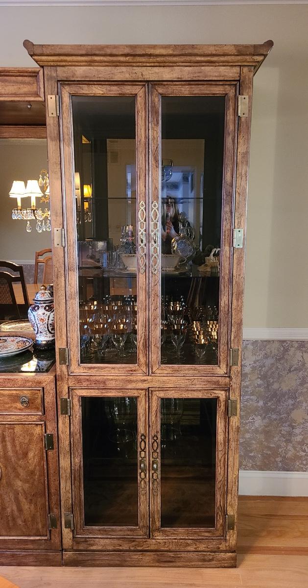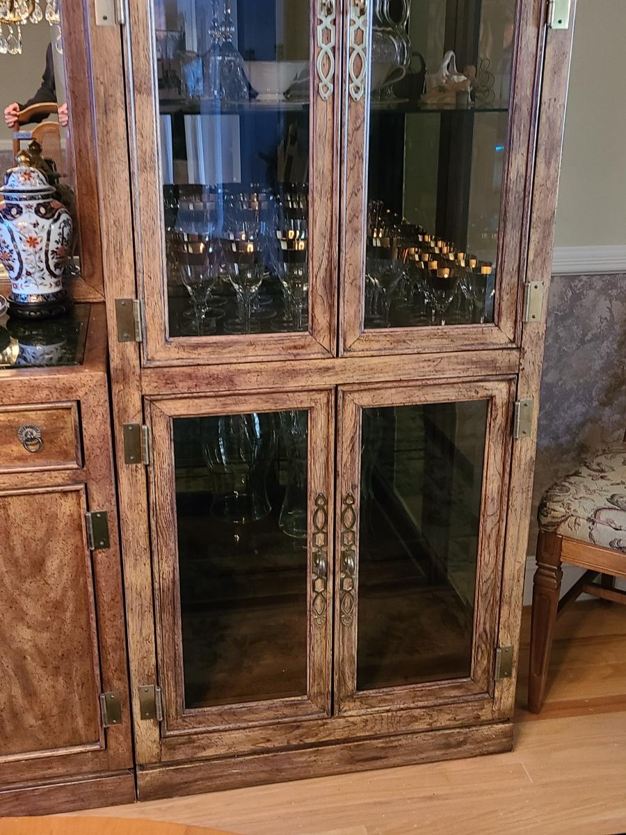 78x28x18 inches, This piece is part of a unit that we are breaking up into three in case people want one part of the unit since they can stand alone. If you want all three, then you will need to bid on all three. This is for the right hand display case. The back is mirrored, there are glass shelves, and brass hardware. This will be sold individually and the only place it will share wear is the two small holes where the top unit is connected, they can be plugged. This makes a gorgeous display cabinet, book cabinet, or art display in any room! This is one long piece so you will need to bring a truck. Glassware not included. Please see all pictures as they are the best representation of the items. The pictures show condition, measurements if taken, and what is included in the lot. Due to the large amount that we photograph and the time frame, we are not always able to take measurements. All items unless noted, are pre-owned and have been used. If you purchased furniture, you must bring help. We do not allow one person to carry large furniture out on their own. Bring help, tools and a truck for the safety of our client’s homes, and your personal safety. Company policy. Thank you.