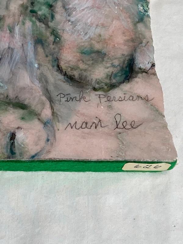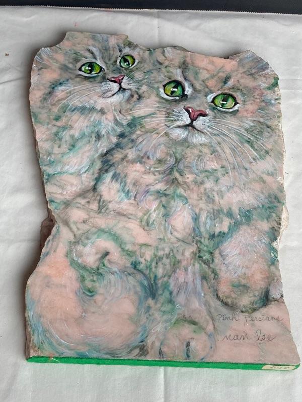 Signed NaN Lee painted stone art “Pink Persians” measures approximately 13” tall 9-1/2” wide and 3/4” thick