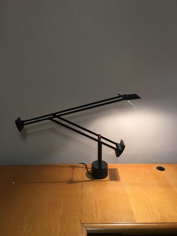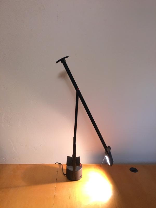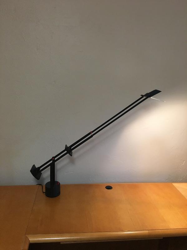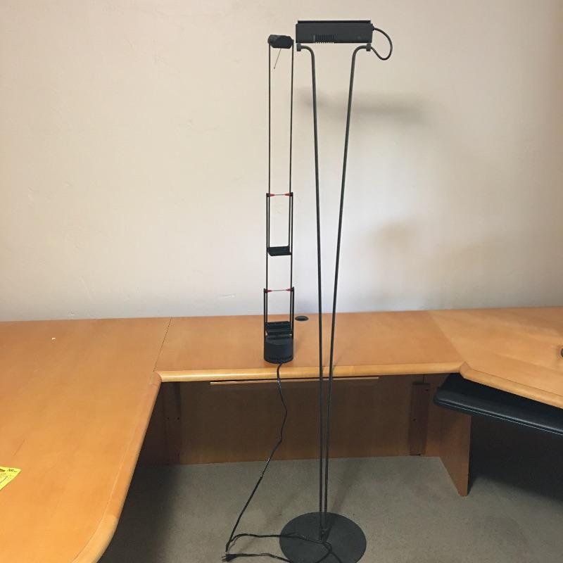 Pair of halogen lamps. Lot includes one desk lamp and one floor lamp. Artemide desk lamp is adjustable and both lamps are black. Light up your office with this dynamic pair of lamps.