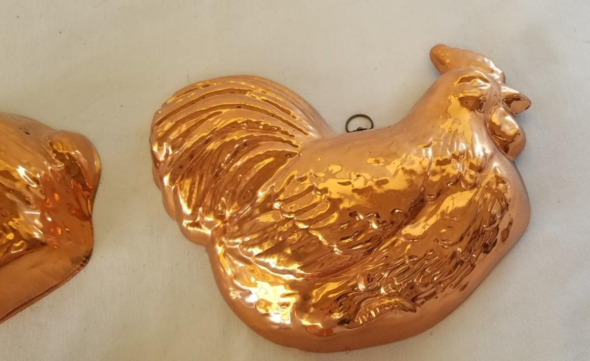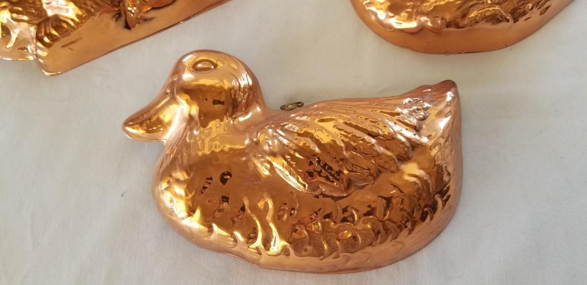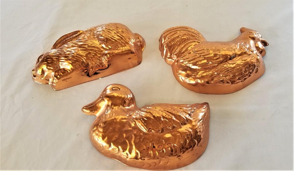 Three contemporary decorative copper kitchen molds in the form of a duck, a chicken, and a rabbit. They each average 10" across - good condition.