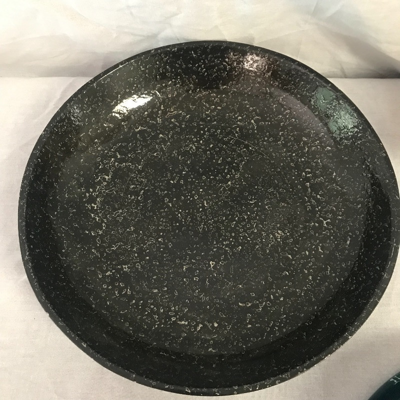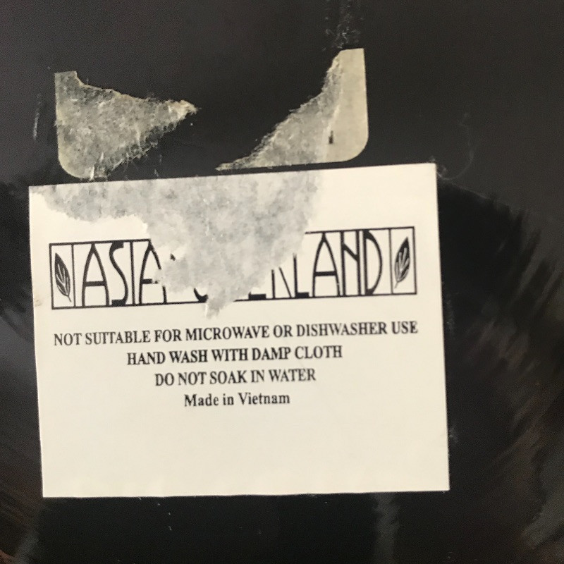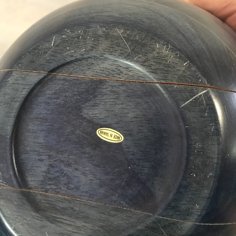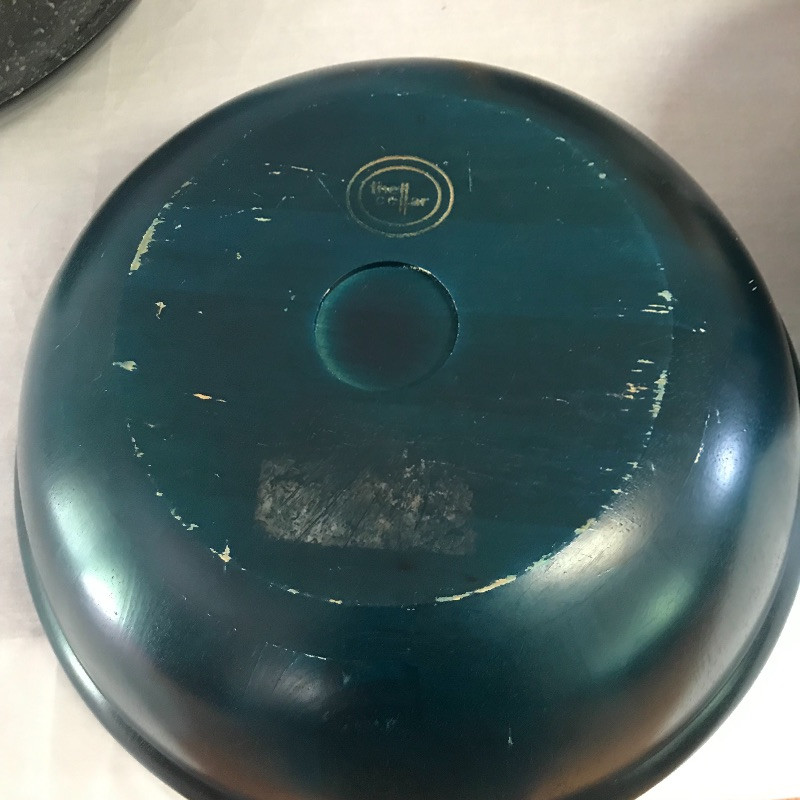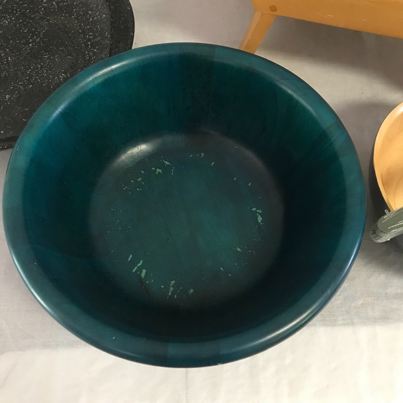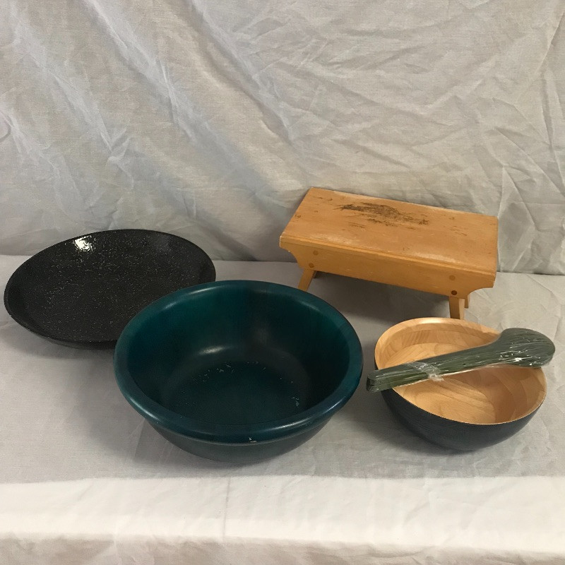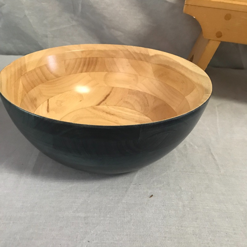 three wood bowls and serving tongs along with a wooden stool for your little helper. Black bowl is lacquer covered and wood bowl has space between the pieces in the bottom. Teal colored bowl measures 14.5” diameter. Local pick up only