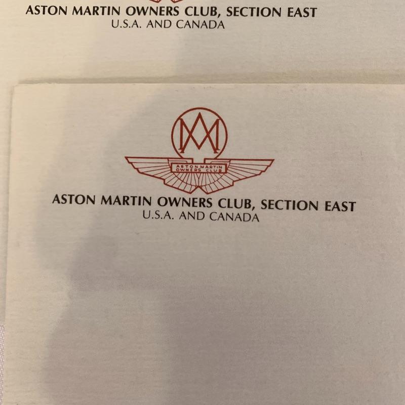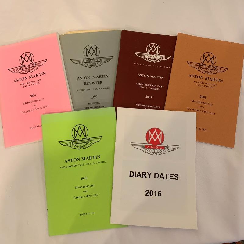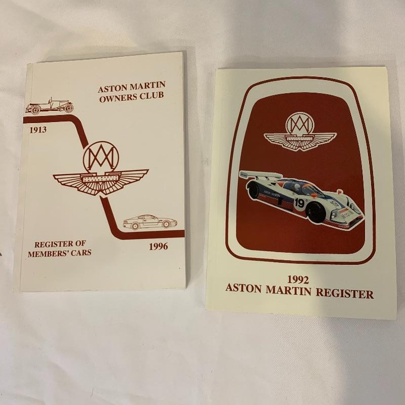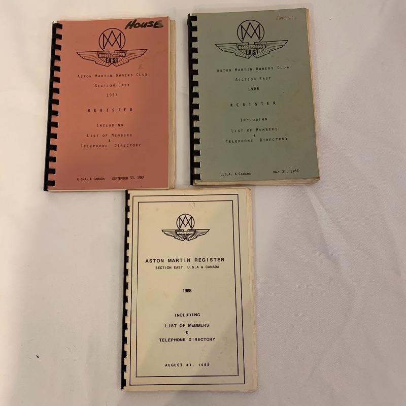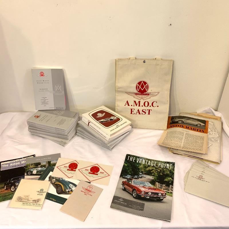 Calling all Aston Martin owners! This lot includes everything an Aston Martin Owners Club member could need! From envelopes to several volumes of registers to a small tote, this lot has it all! It also includes several books that list members and also function as a telephone directory. Along with these, it comes with an umbrella, four large glass mugs, pen with a marble pen stand, and matchbooks. Lastly, it contains two large red binders filled with directions on how to fix up different types of problems on cars. Local pickup only.