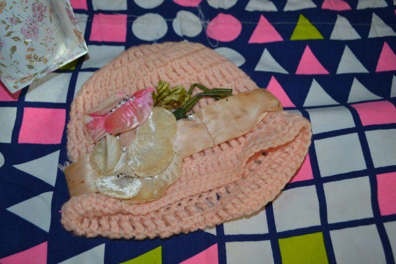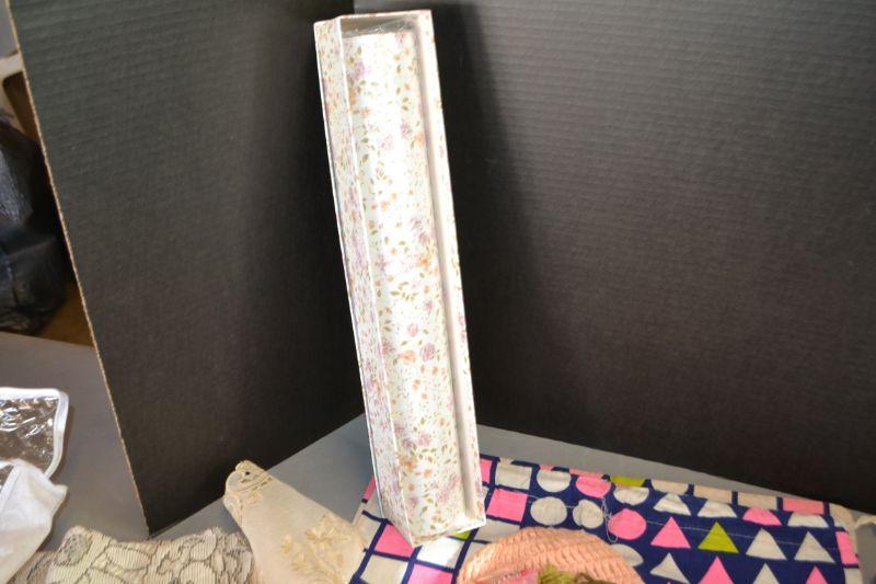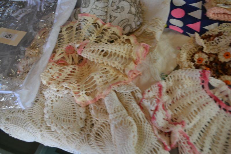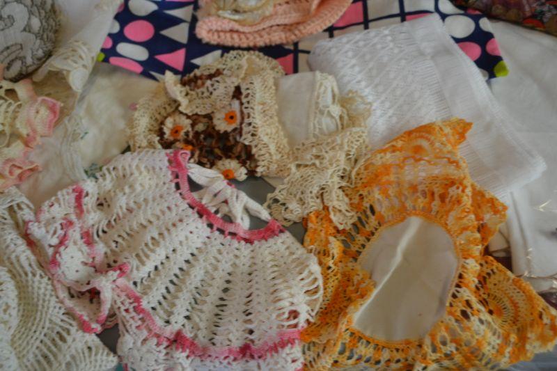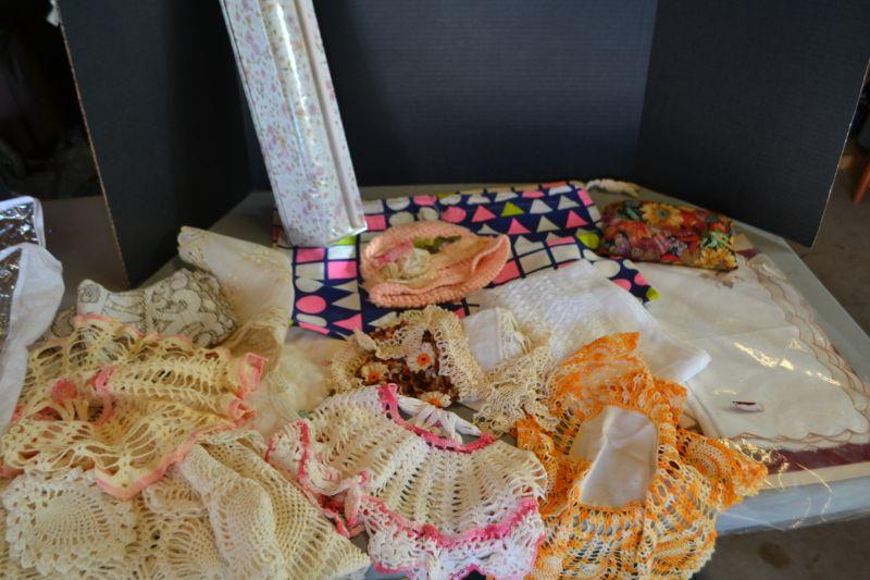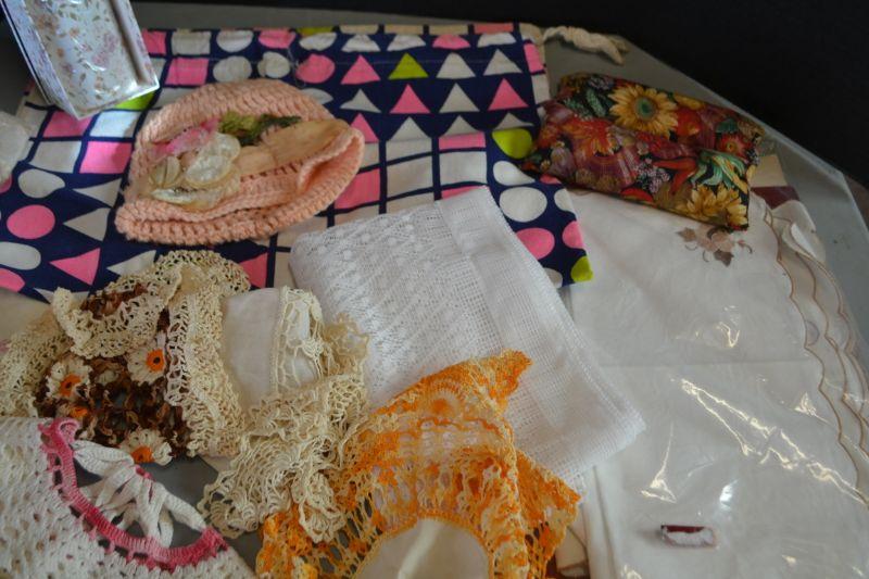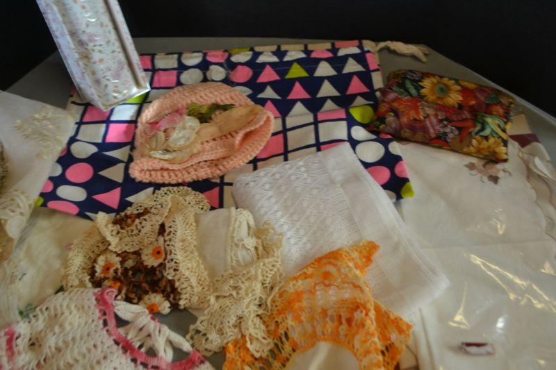 LOT 256 MISC. LINENS, CLOTH BAG, BABY HAT