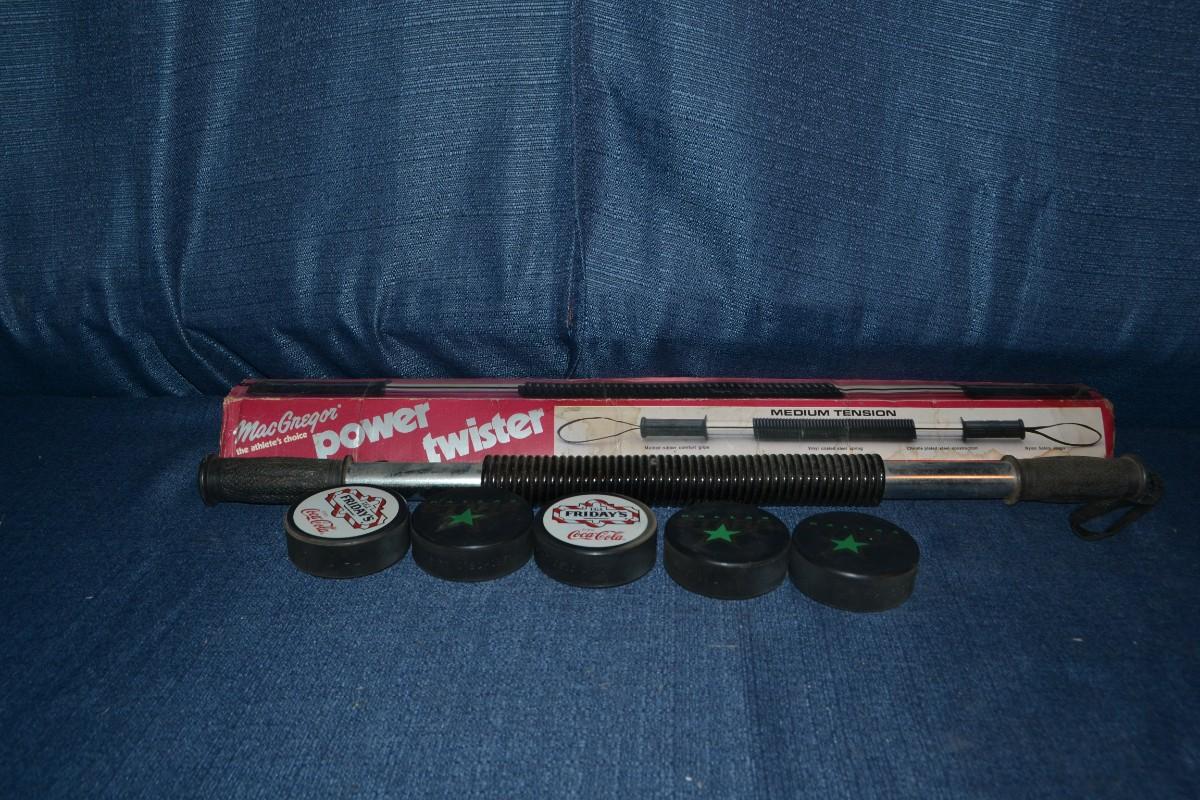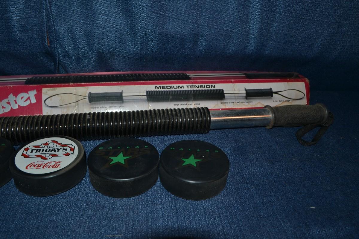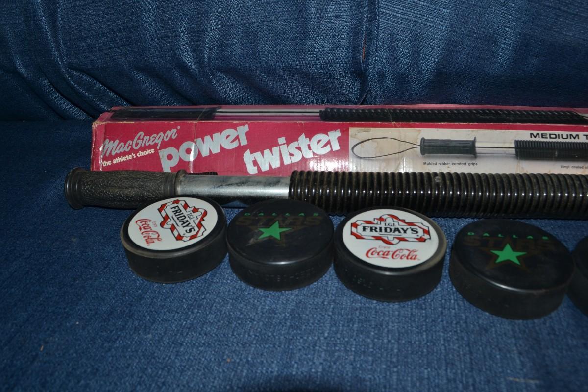 LOT 256      five TGI Fridays/Dallas stars hockey pucks  power twister exercise tools