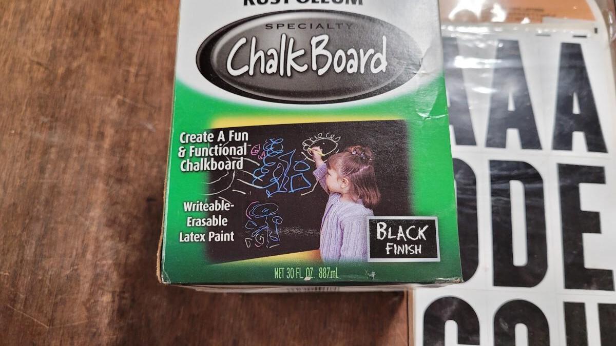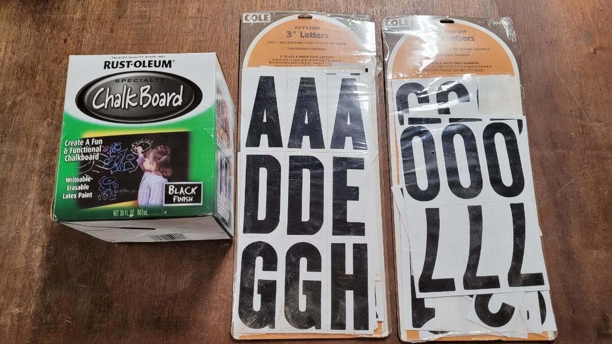 Lot 256: Black Chalkboard Paint and Vinyl Self Stick Numbers and Letters