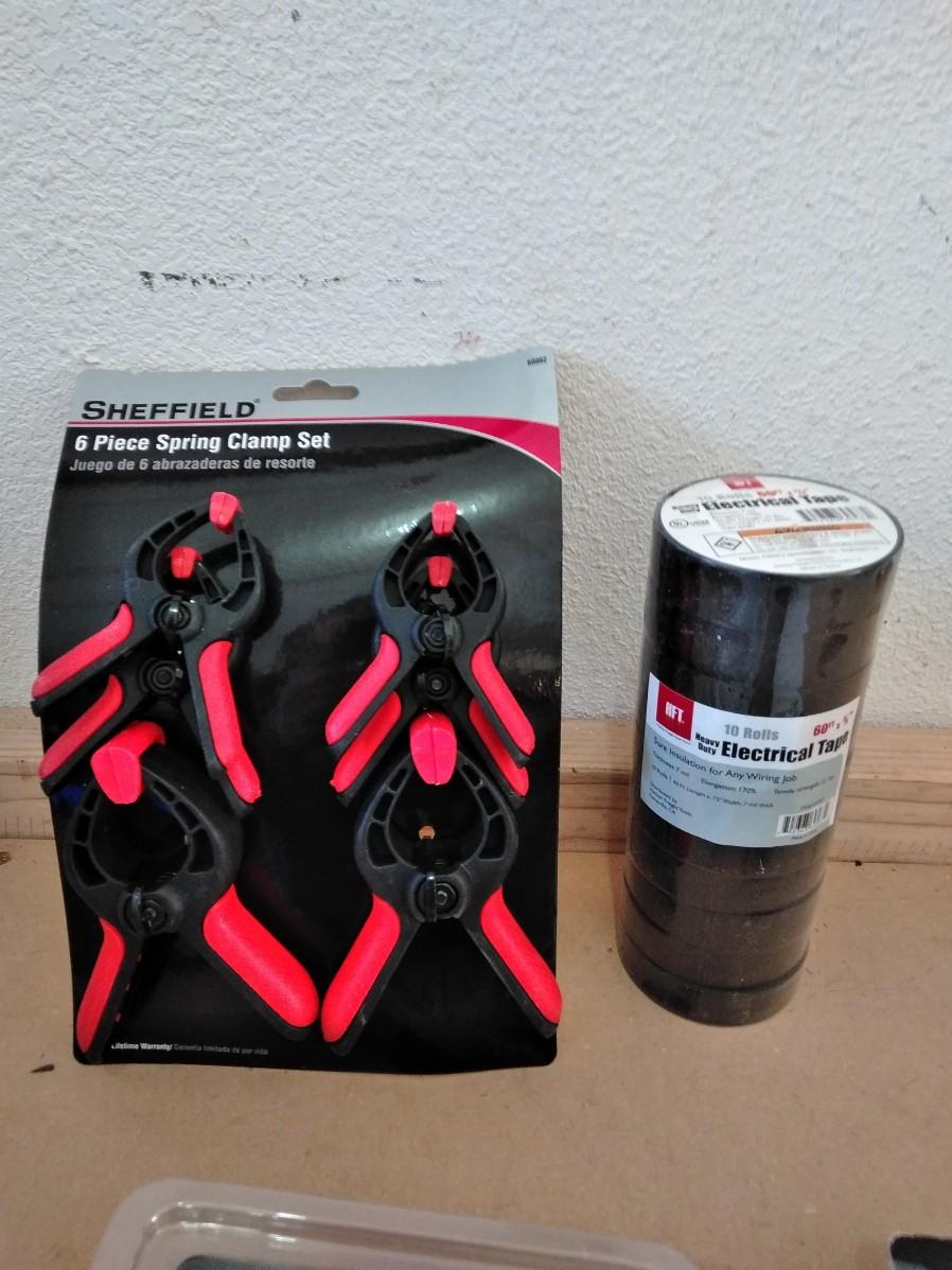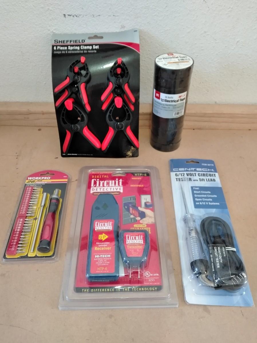 TWO CIRCUIT TESTERS, ROLLS OF ELECTRICAL TAPE, SPRING CLAMPS, AND SMALL SCREWDRIVER SET.