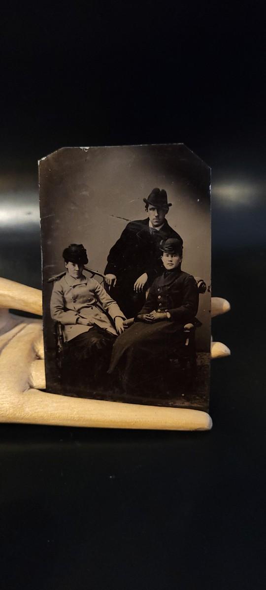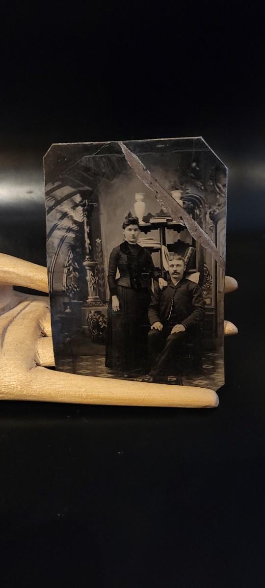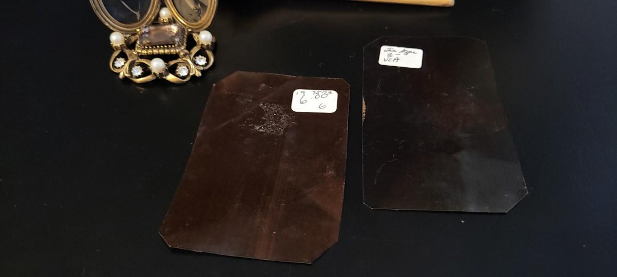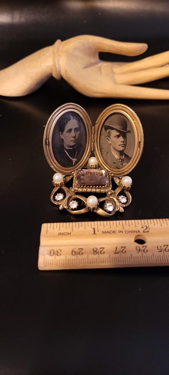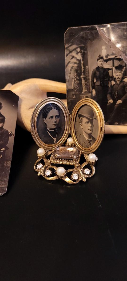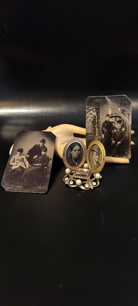 Lot 256: (2) Antique Metal Tin Type Photos + Handmade Lover's Brooch Stand