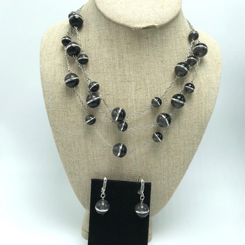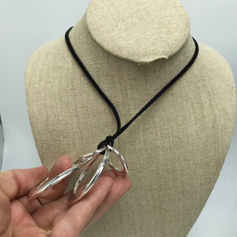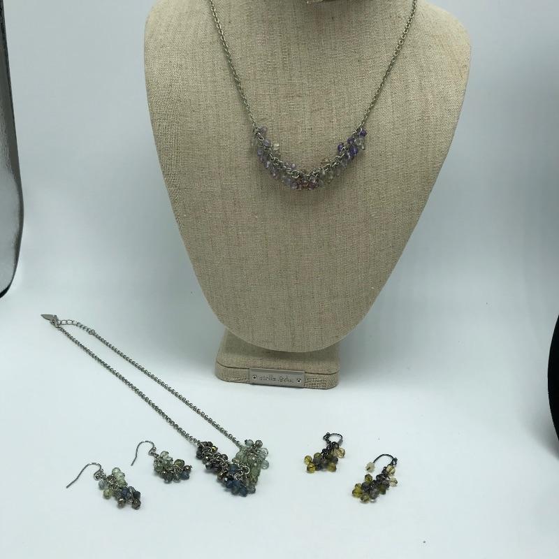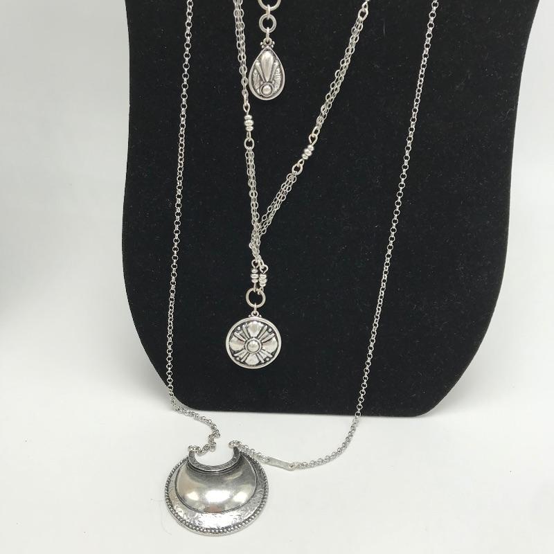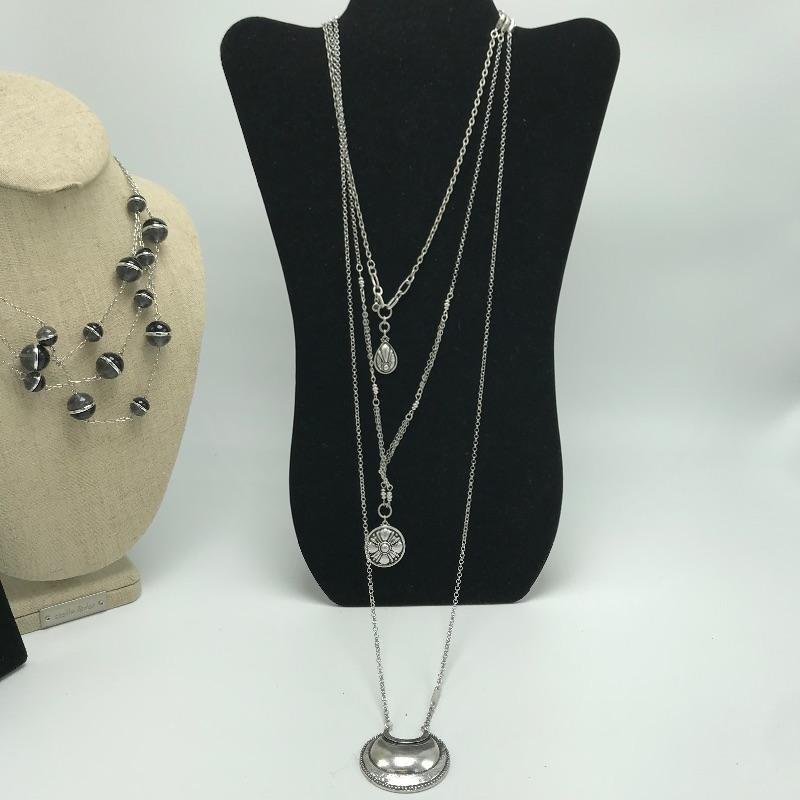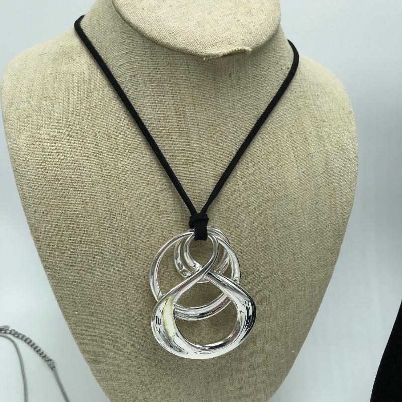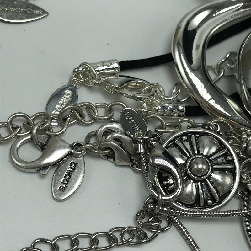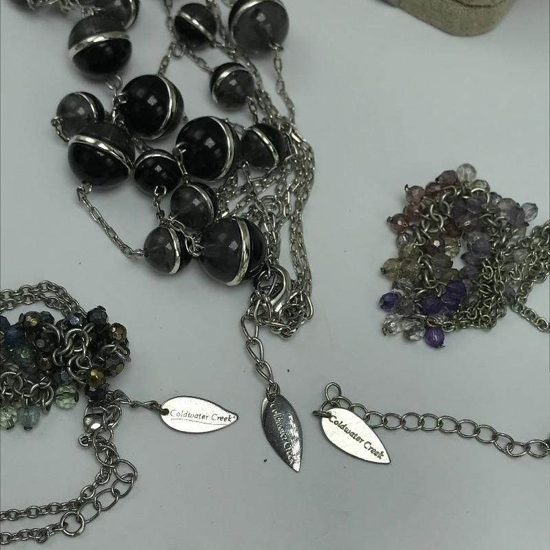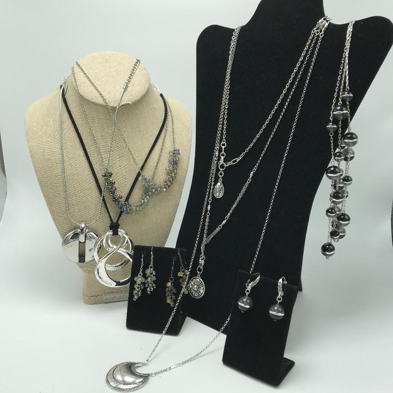 Sophisticated sets and singles from Coldwater Creek and Chico’s. Black cord from the Chico’s necklace appears to be leather. All others are silver colored metal. See photos.