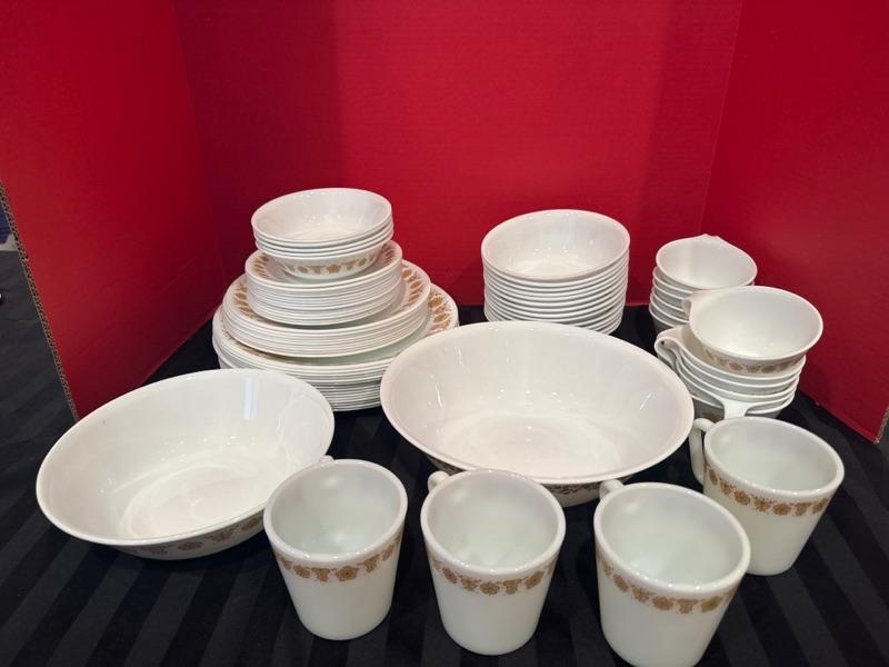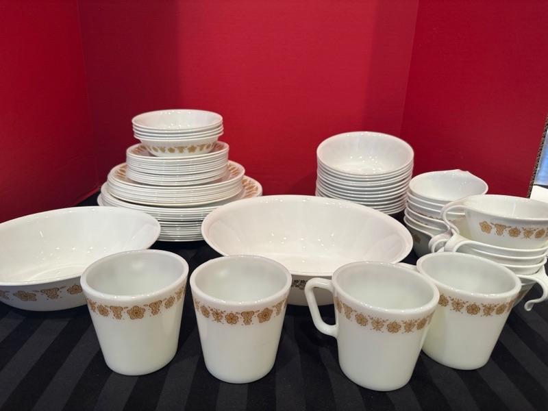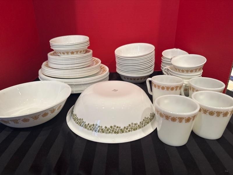 Lot 256 Vintage butterfly gold corelle dishes, 1 corelle spring blossom crazy daisy serving dish