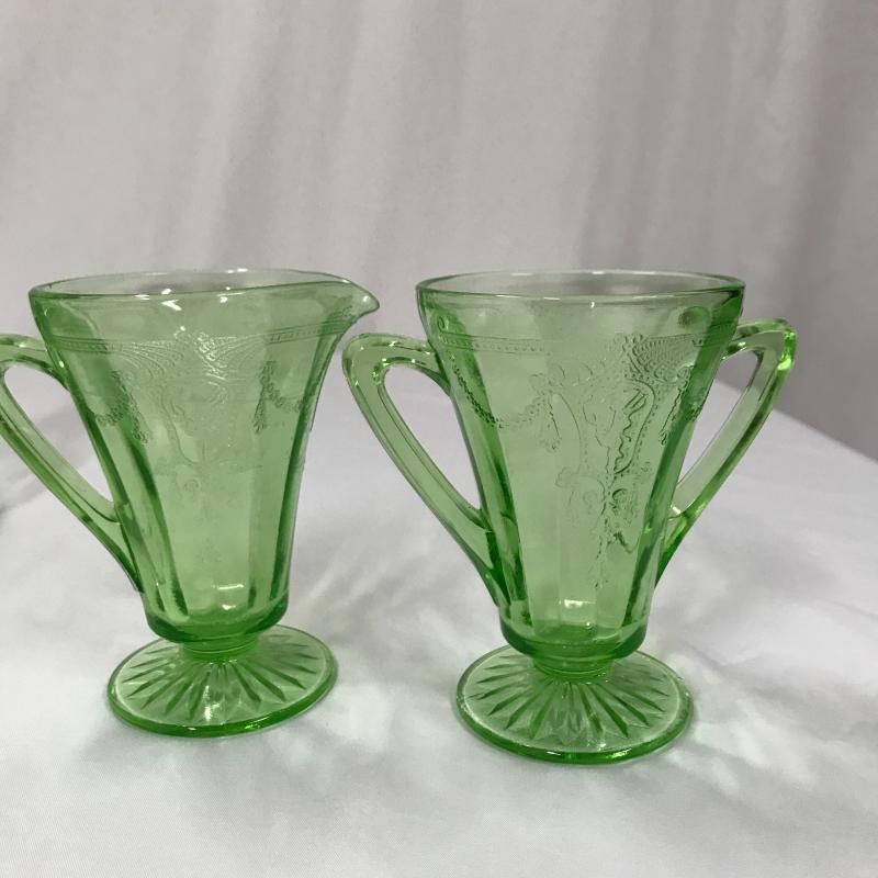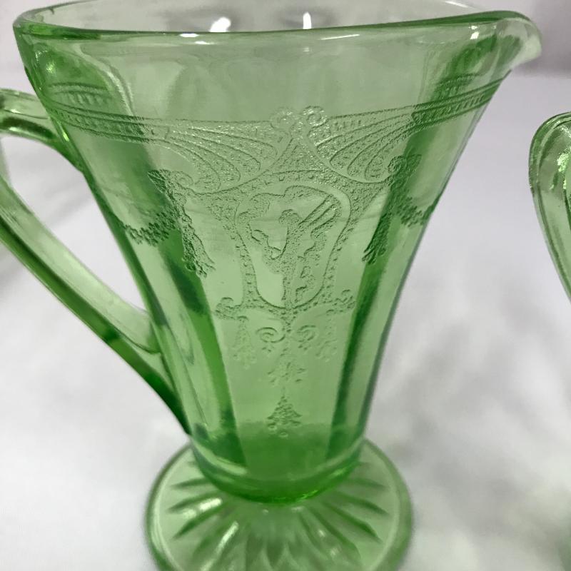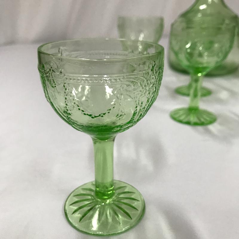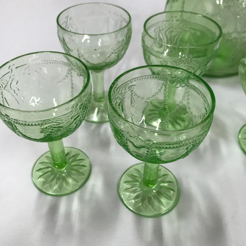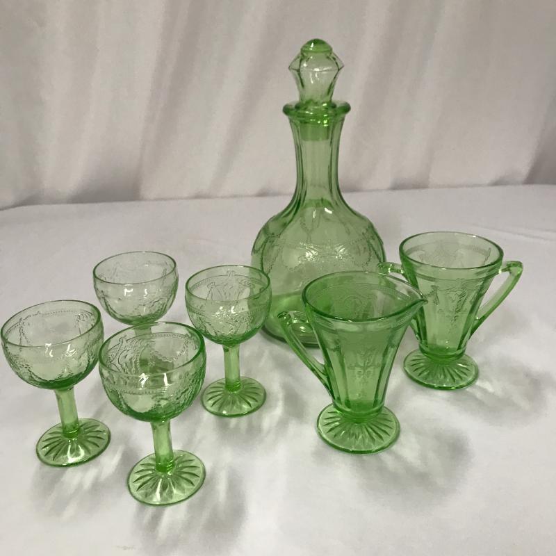 Vaseline Glass Decanter, cordials and creamer set. All same pattern. Decanter Measures 5.5”d x 10”h. Shipping or local pick up in Asheville