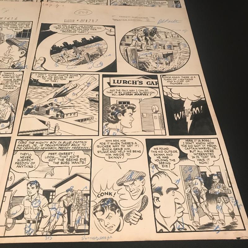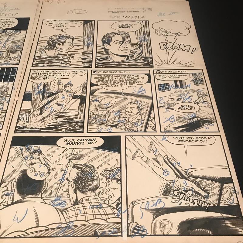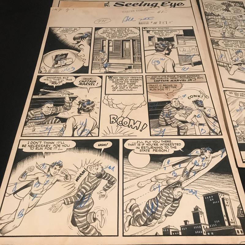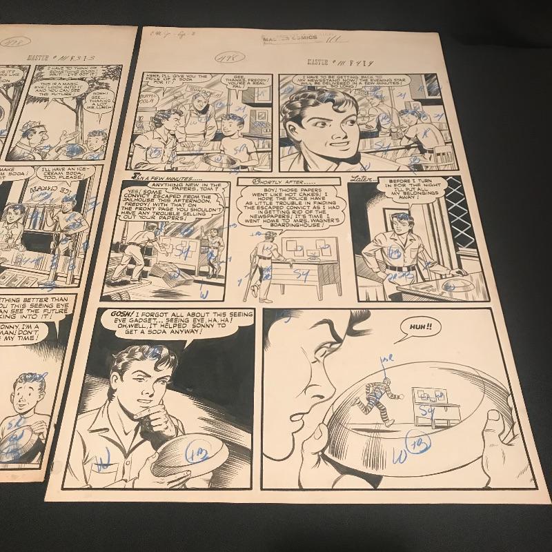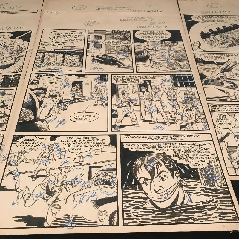 Appears to be Ten boards of Captain Marvel Junior Original Art with blue pencil edits of Fawcett Publication Master Comics issue #111 “Seeing Eye”. No marks on backs and boards measure 14.25” x21.5” average. A few overlays appear to be missing. Shipping available.
