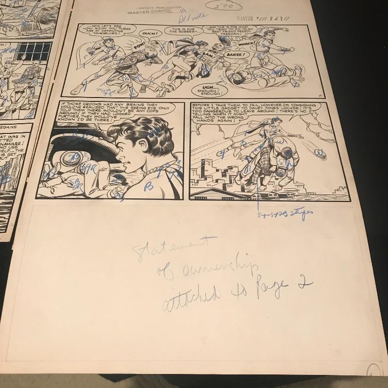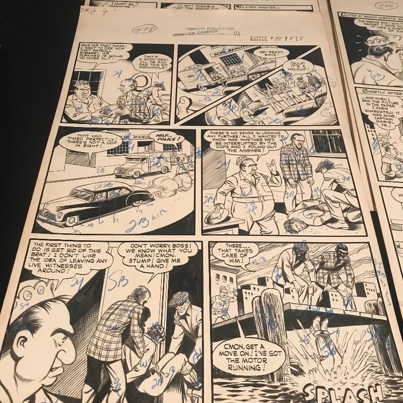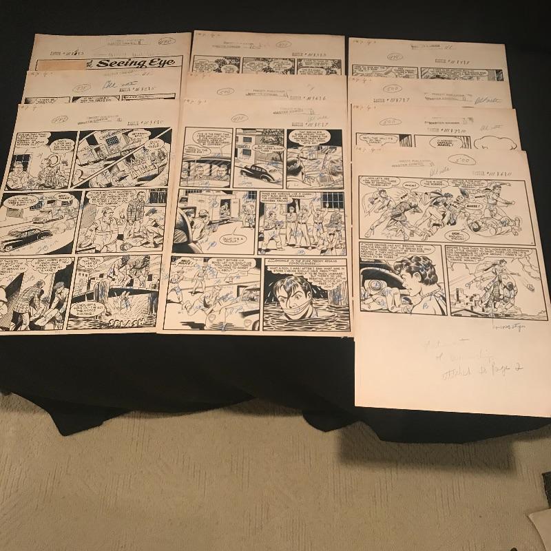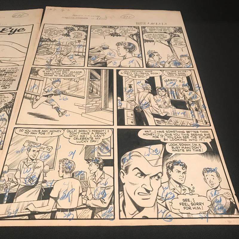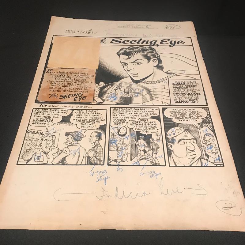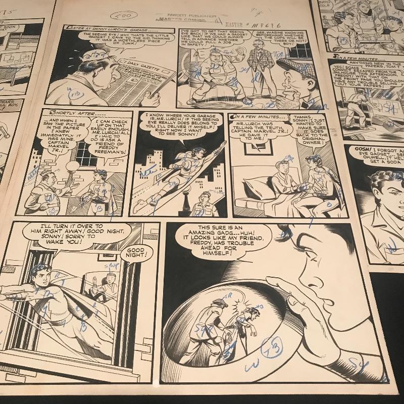 Appears to be Ten boards of Captain Marvel Junior Original Art with blue pencil edits of Fawcett Publication Master Comics issue #111 “Seeing Eye”. No marks on backs and boards measure 14.25” x21.5” average. A few overlays appear to be missing. Shipping available.