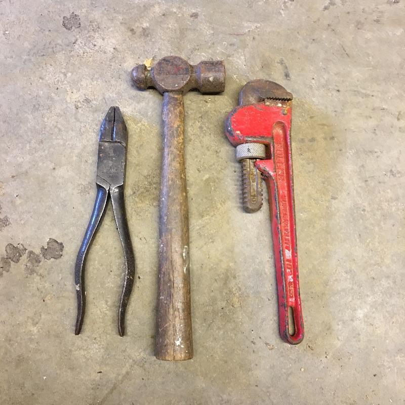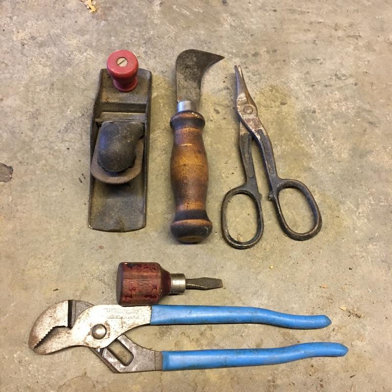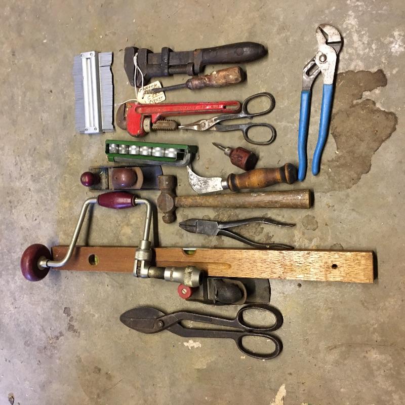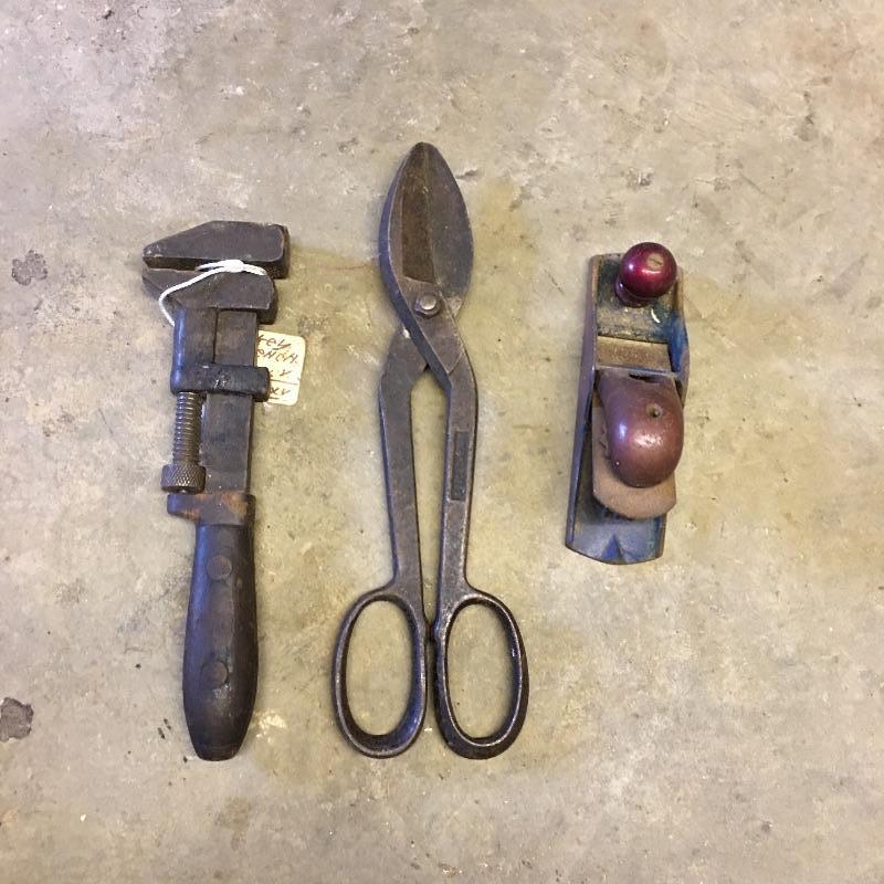 These tools are oldies but goodies! Lot includes a wooden level, monkey wrench, planers, ball peen hammer, newer Channellock and pipe wrench, tin snips, hand drill, screwdriver and more. Level measures 24” long.