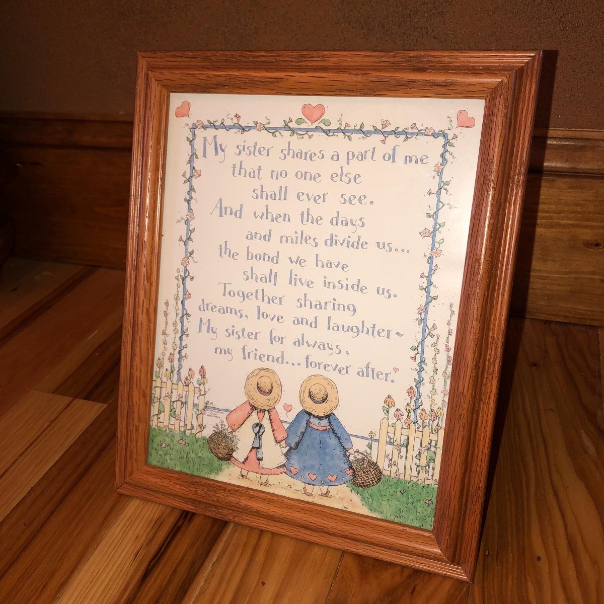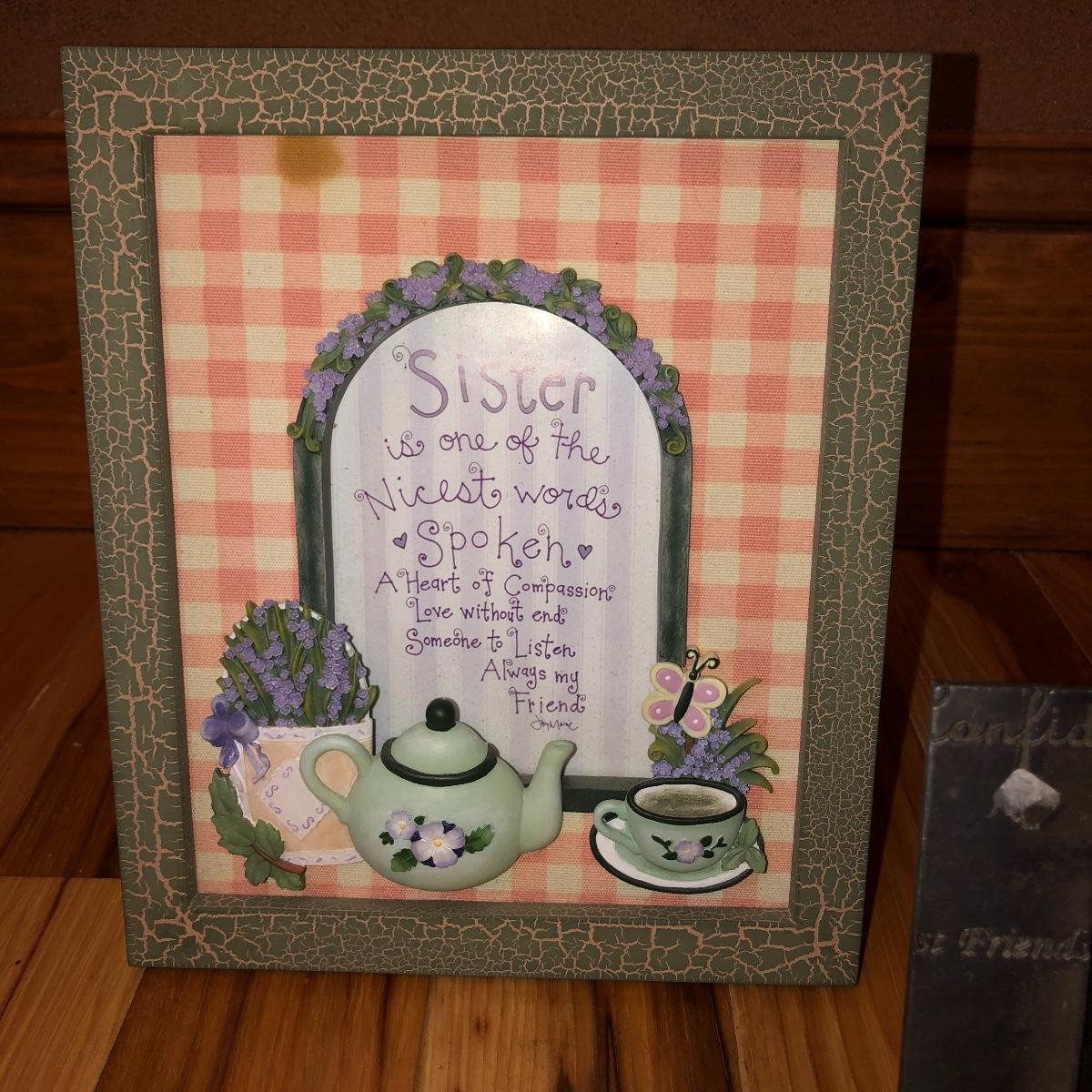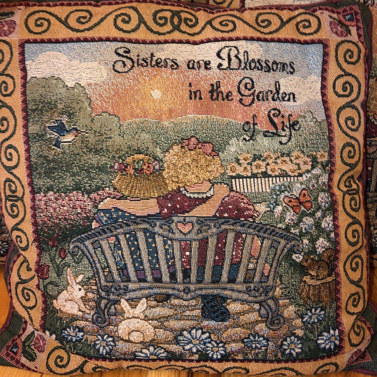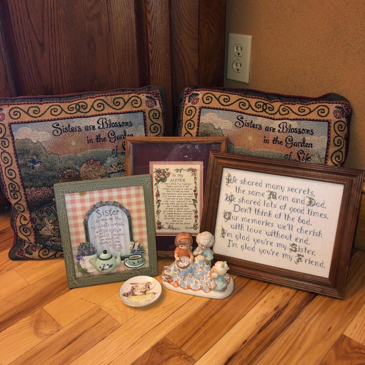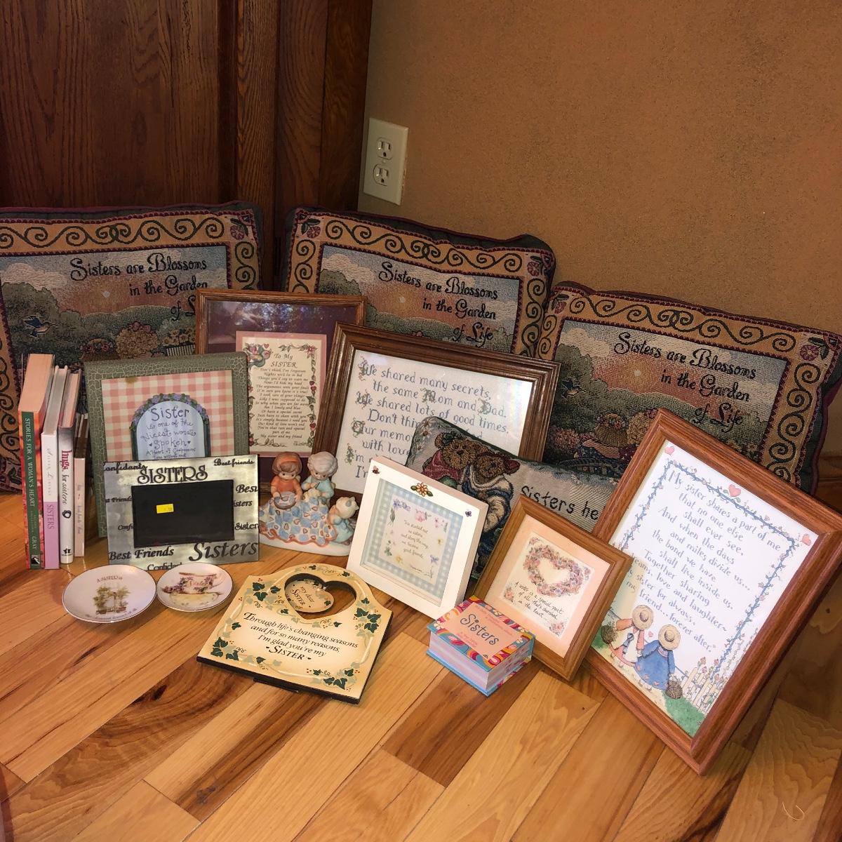 For those of us who have sisters, we know how special they can be. Celebrate sisterhood with these sister themed pillows, wall decor, quotes, and more. There are three tapestry pillows that say “Sisters are blossoms in the garden of life” and are about 15” x 15”, a Boyd’s Bears small rectangular tapestry pillow that says “Sisters help hold each other up”, eight framed quotes and sister themed mantras, small wall hanging saucers, a Sisters & Best Friends ceramic decoration of a Grandmother and two sisters embroidering a quilt, and lastly, five sister themed books. The framed embroidery quote is 10” x 12”. This lovely lot has enough to be shared between sisters; decorative reminders of how important they are!