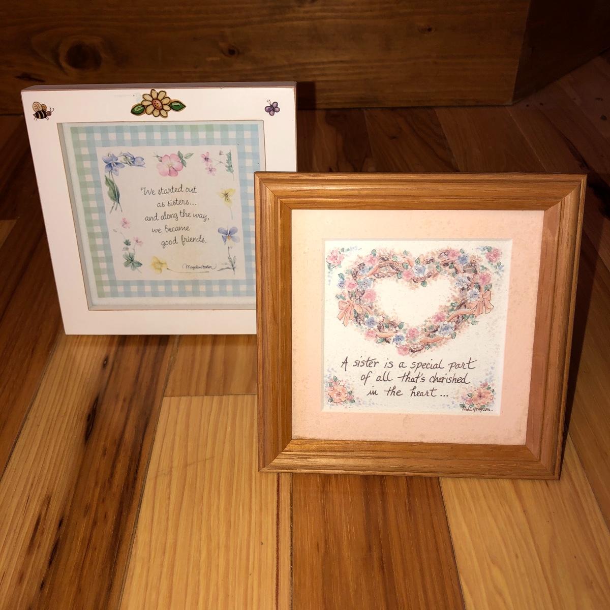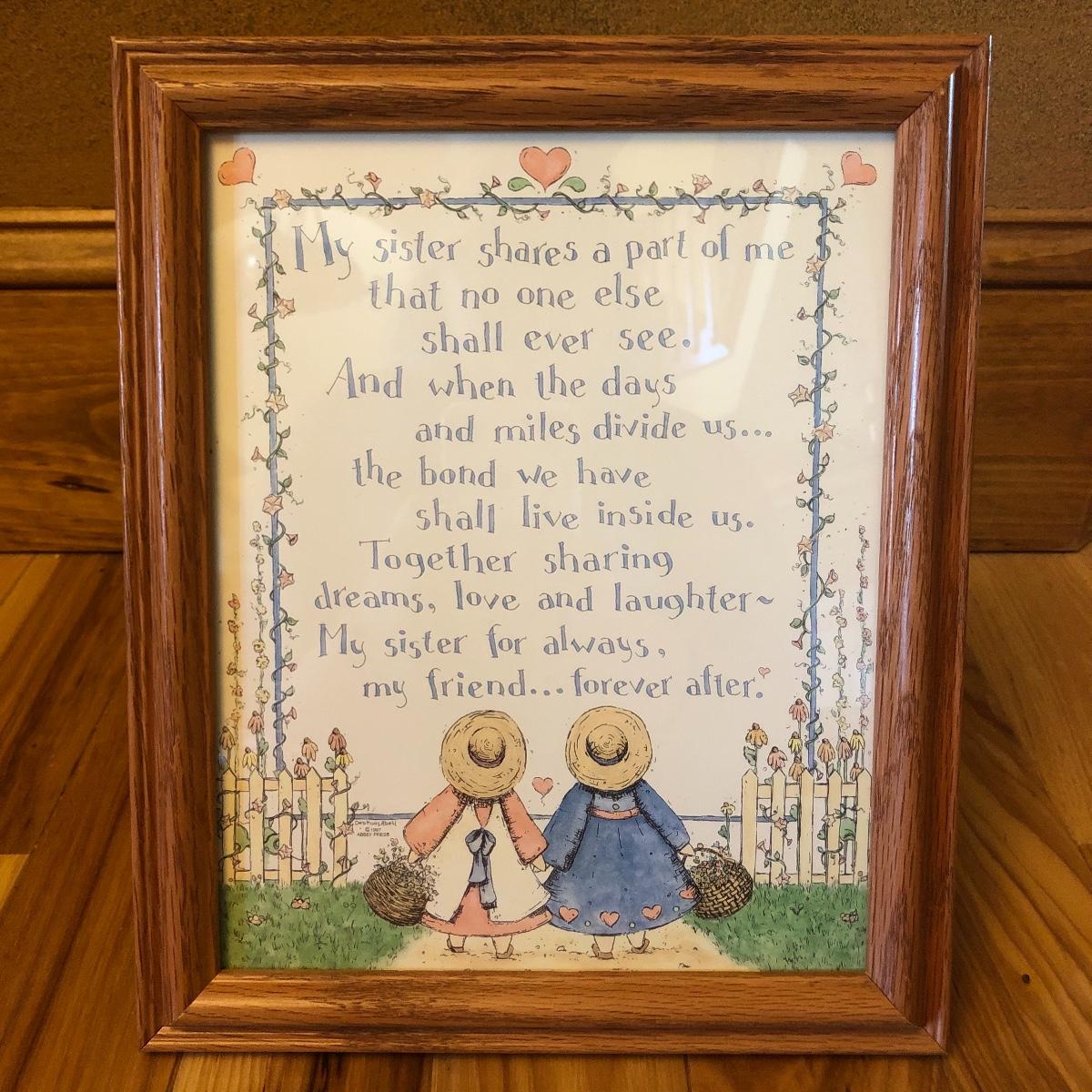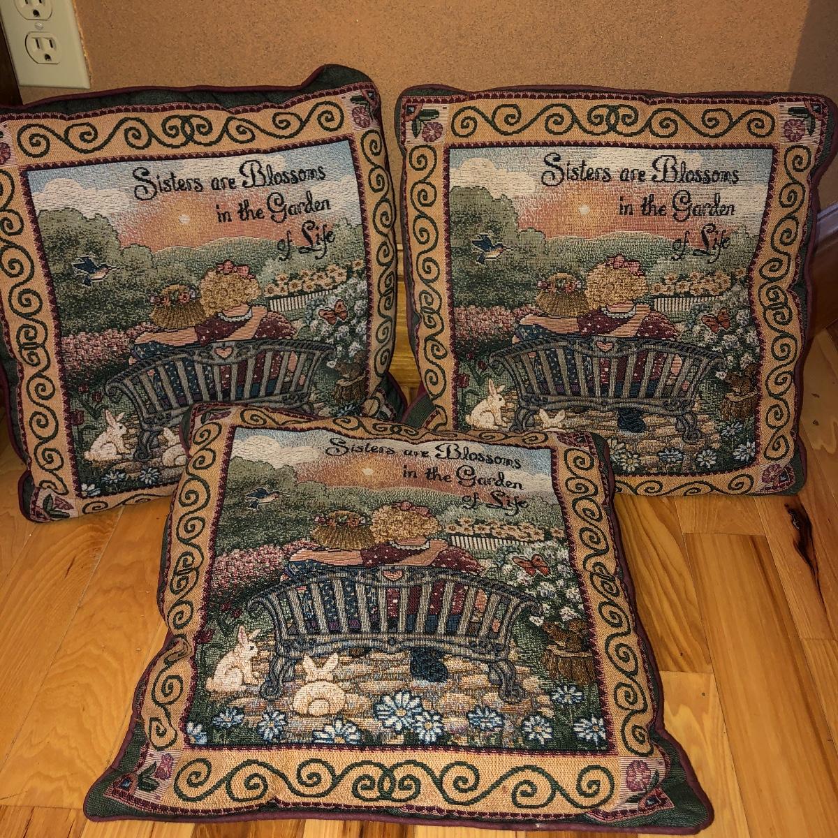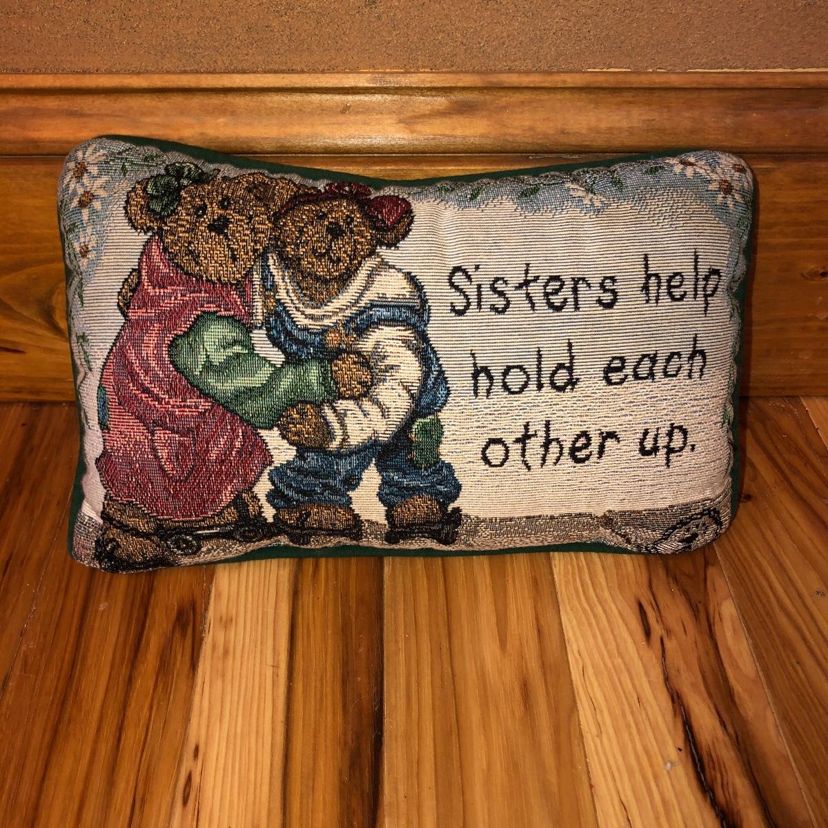 For those of us who have sisters, we know how special they can be. Celebrate sisterhood with these sister themed pillows, wall decor, quotes, and more. There are three tapestry pillows that say “Sisters are blossoms in the garden of life” and are about 15” x 15”, a Boyd’s Bears small rectangular tapestry pillow that says “Sisters help hold each other up”, eight framed quotes and sister themed mantras, small wall hanging saucers, a Sisters & Best Friends ceramic decoration of a Grandmother and two sisters embroidering a quilt, and lastly, five sister themed books. The framed embroidery quote is 10” x 12”. This lovely lot has enough to be shared between sisters; decorative reminders of how important they are!