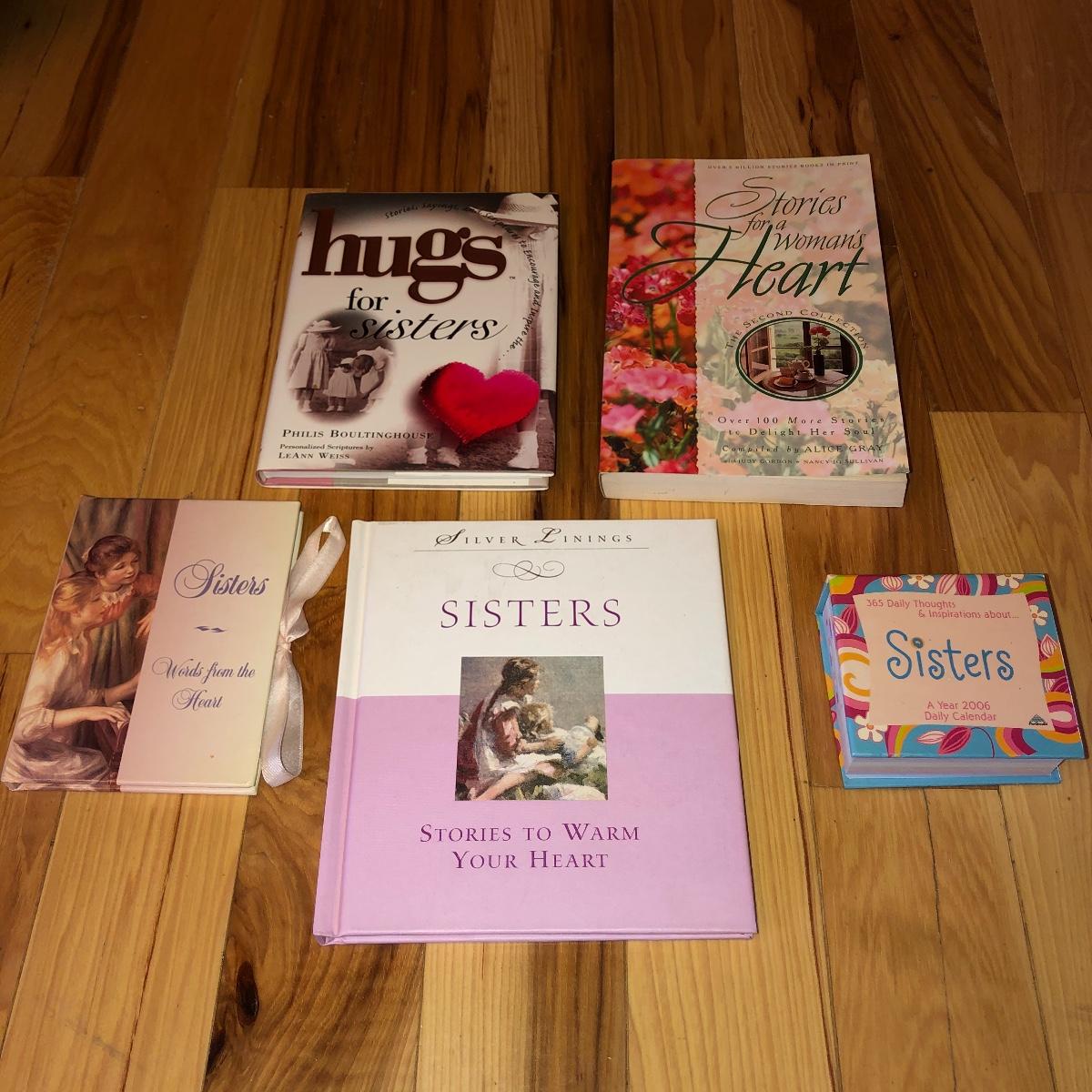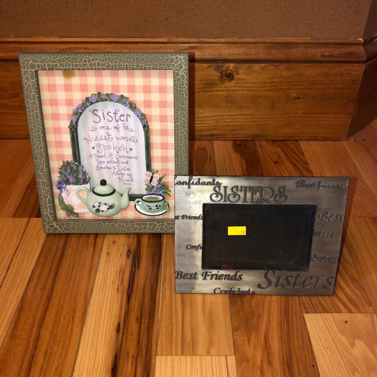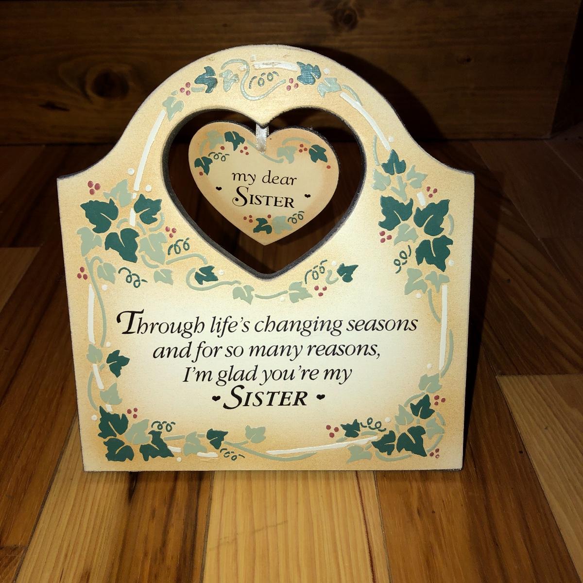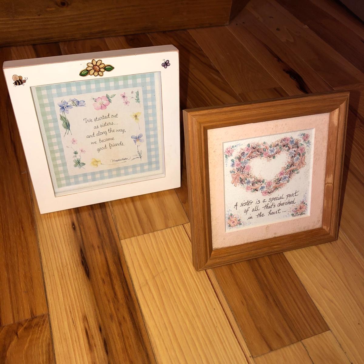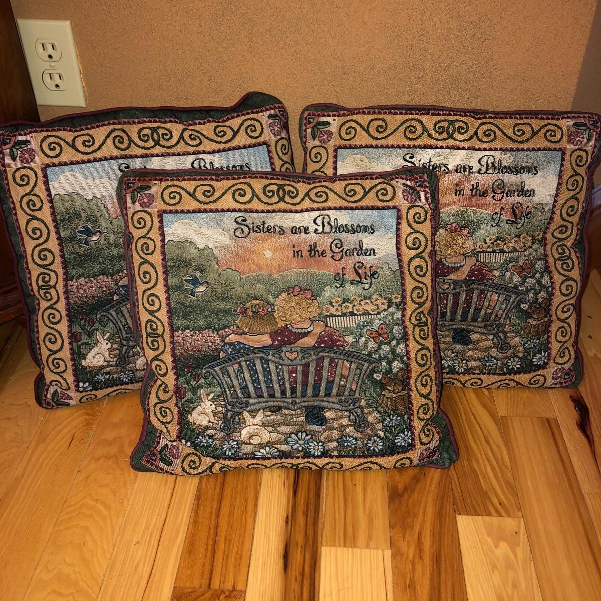 For those of us who have sisters, we know how special they can be. Celebrate sisterhood with these sister themed pillows, wall decor, quotes, and more. There are three tapestry pillows that say “Sisters are blossoms in the garden of life” and are about 15” x 15”, a Boyd’s Bears small rectangular tapestry pillow that says “Sisters help hold each other up”, eight framed quotes and sister themed mantras, small wall hanging saucers, a Sisters & Best Friends ceramic decoration of a Grandmother and two sisters embroidering a quilt, and lastly, five sister themed books. The framed embroidery quote is 10” x 12”. This lovely lot has enough to be shared between sisters; decorative reminders of how important they are!
