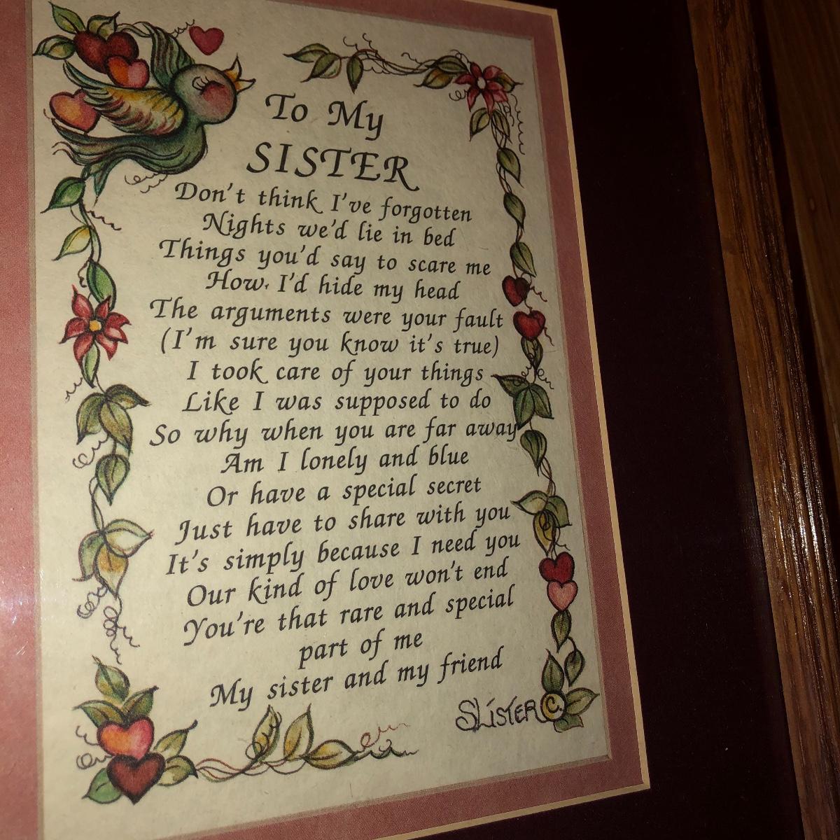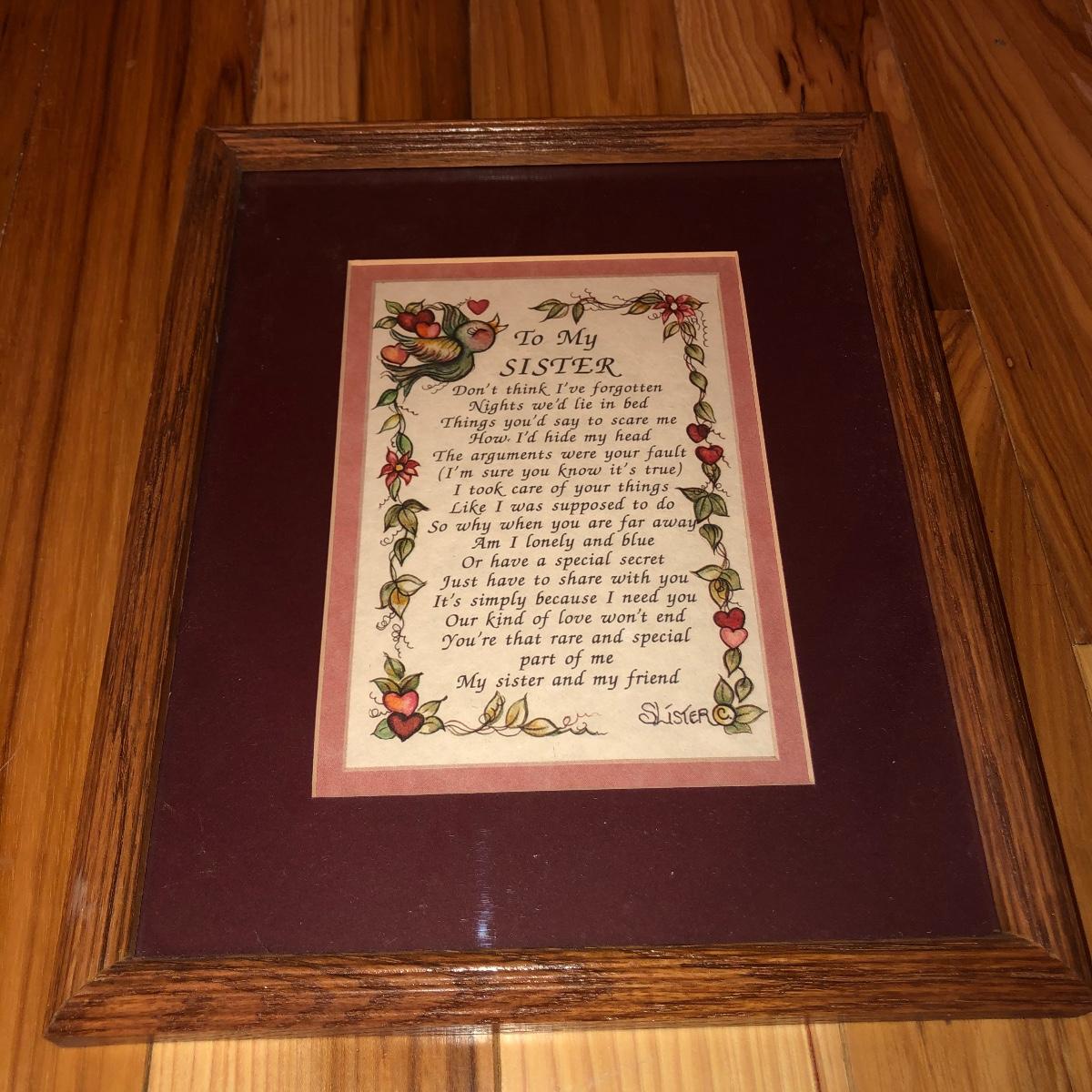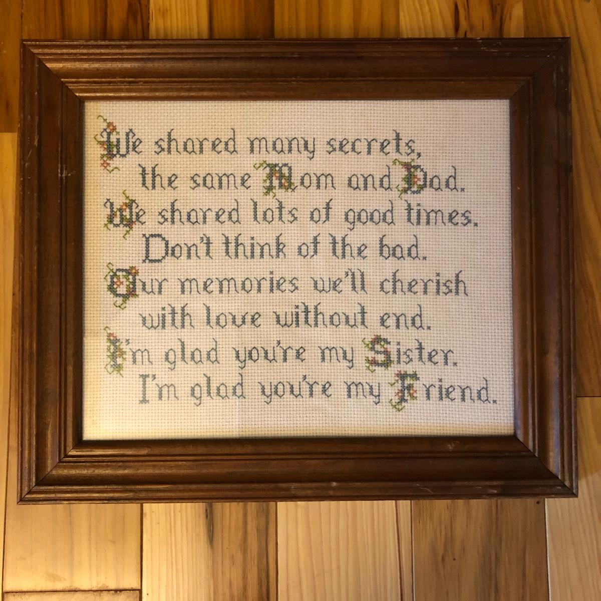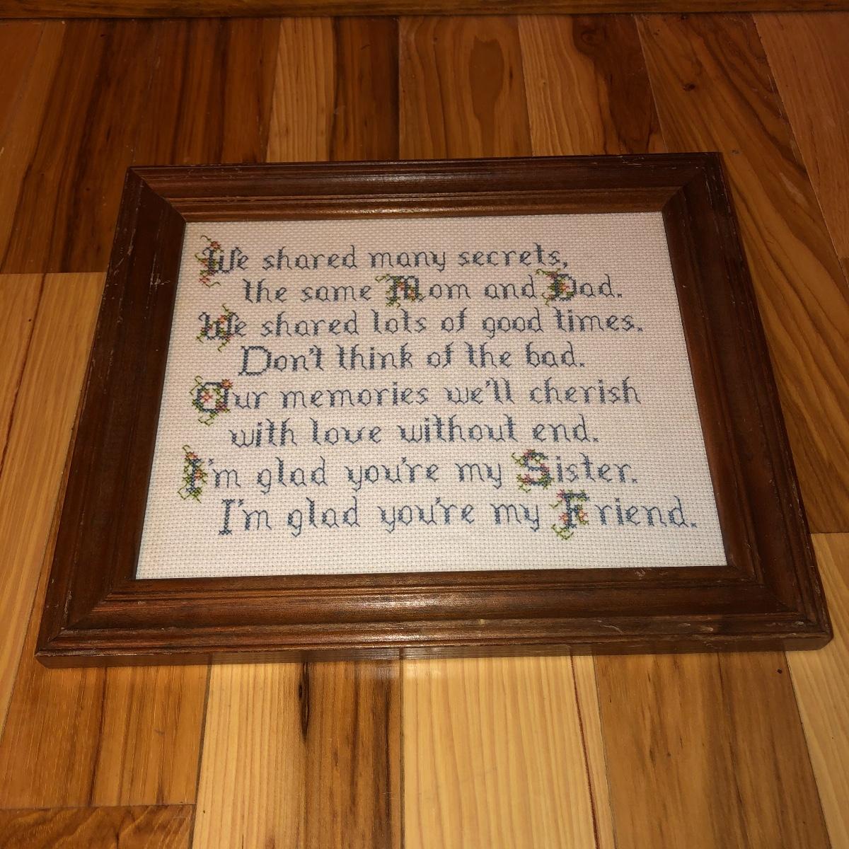 For those of us who have sisters, we know how special they can be. Celebrate sisterhood with these sister themed pillows, wall decor, quotes, and more. There are three tapestry pillows that say “Sisters are blossoms in the garden of life” and are about 15” x 15”, a Boyd’s Bears small rectangular tapestry pillow that says “Sisters help hold each other up”, eight framed quotes and sister themed mantras, small wall hanging saucers, a Sisters & Best Friends ceramic decoration of a Grandmother and two sisters embroidering a quilt, and lastly, five sister themed books. The framed embroidery quote is 10” x 12”. This lovely lot has enough to be shared between sisters; decorative reminders of how important they are!