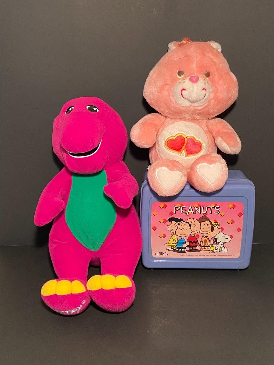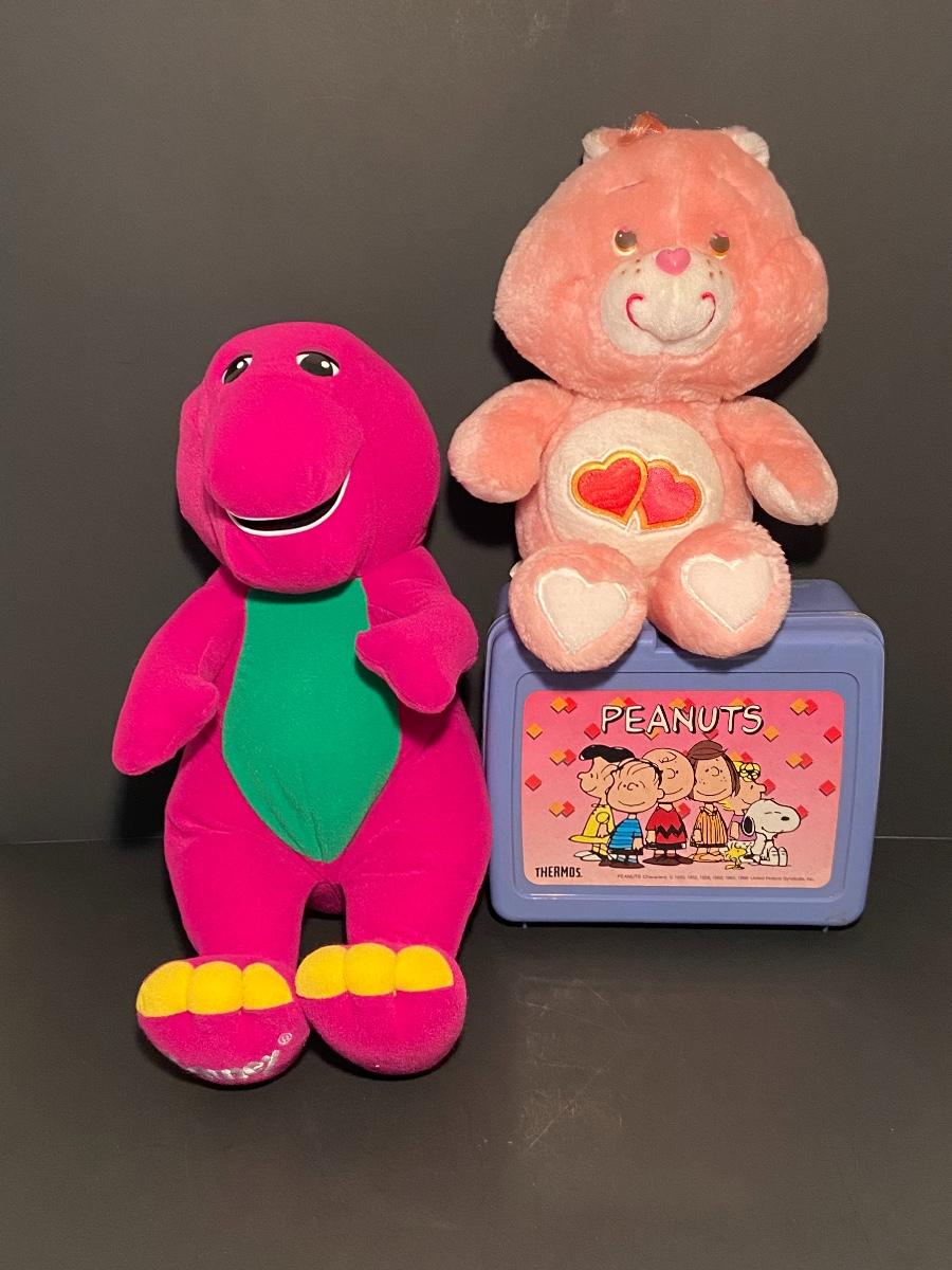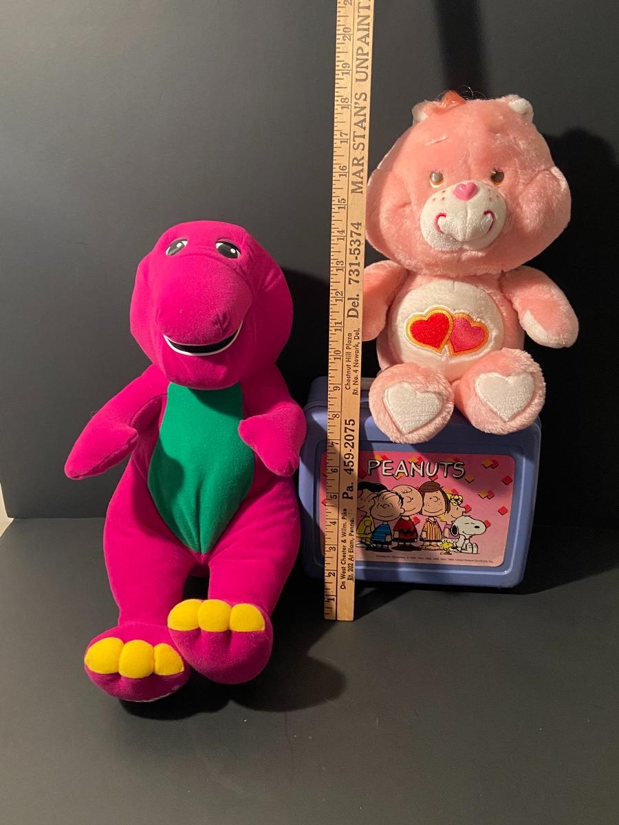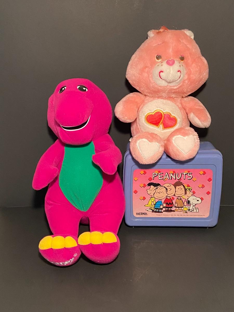 Lot 257: Vintage Toy Lot: Talking Barnie, Care Bear, and Peanuts Lunchbox