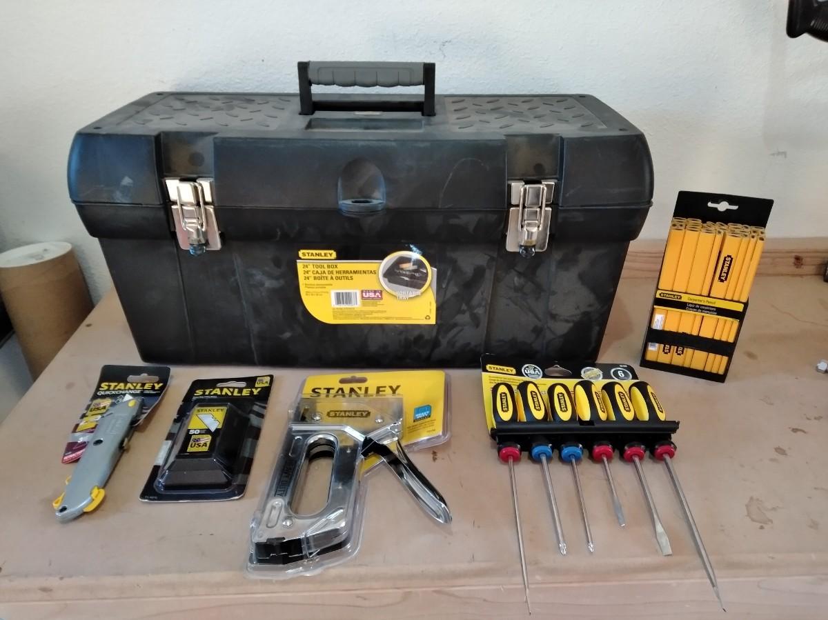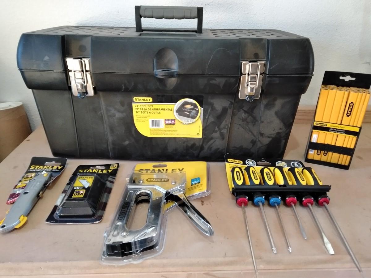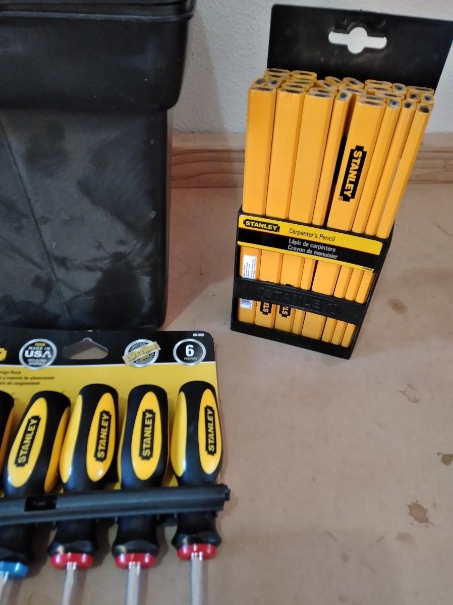 LARGE HEAVY PLASTIC STANLEY TOOLBOX WITH STANLEY SCREWDRIVER SET, STAPLER, UTILITY KNIFE, BLADES AND WOOD PENCILS.