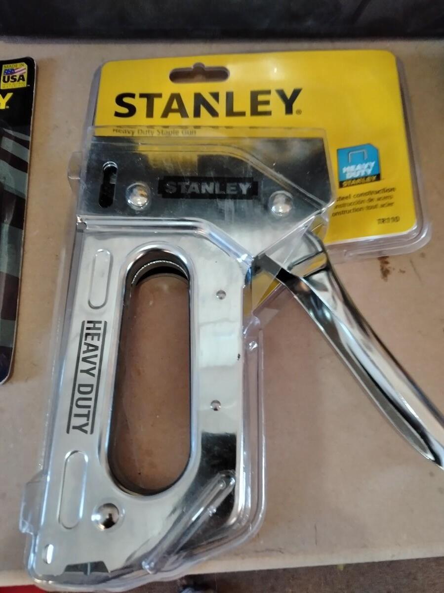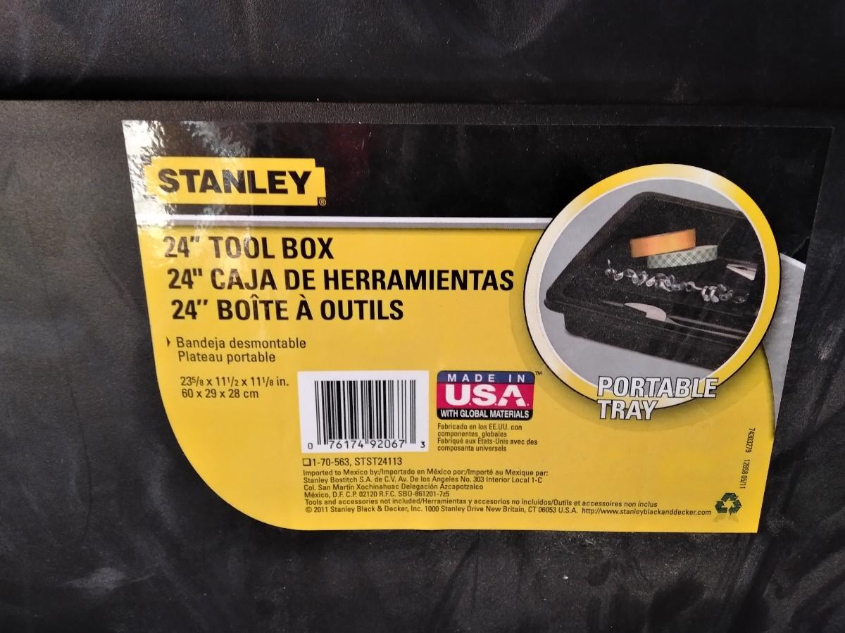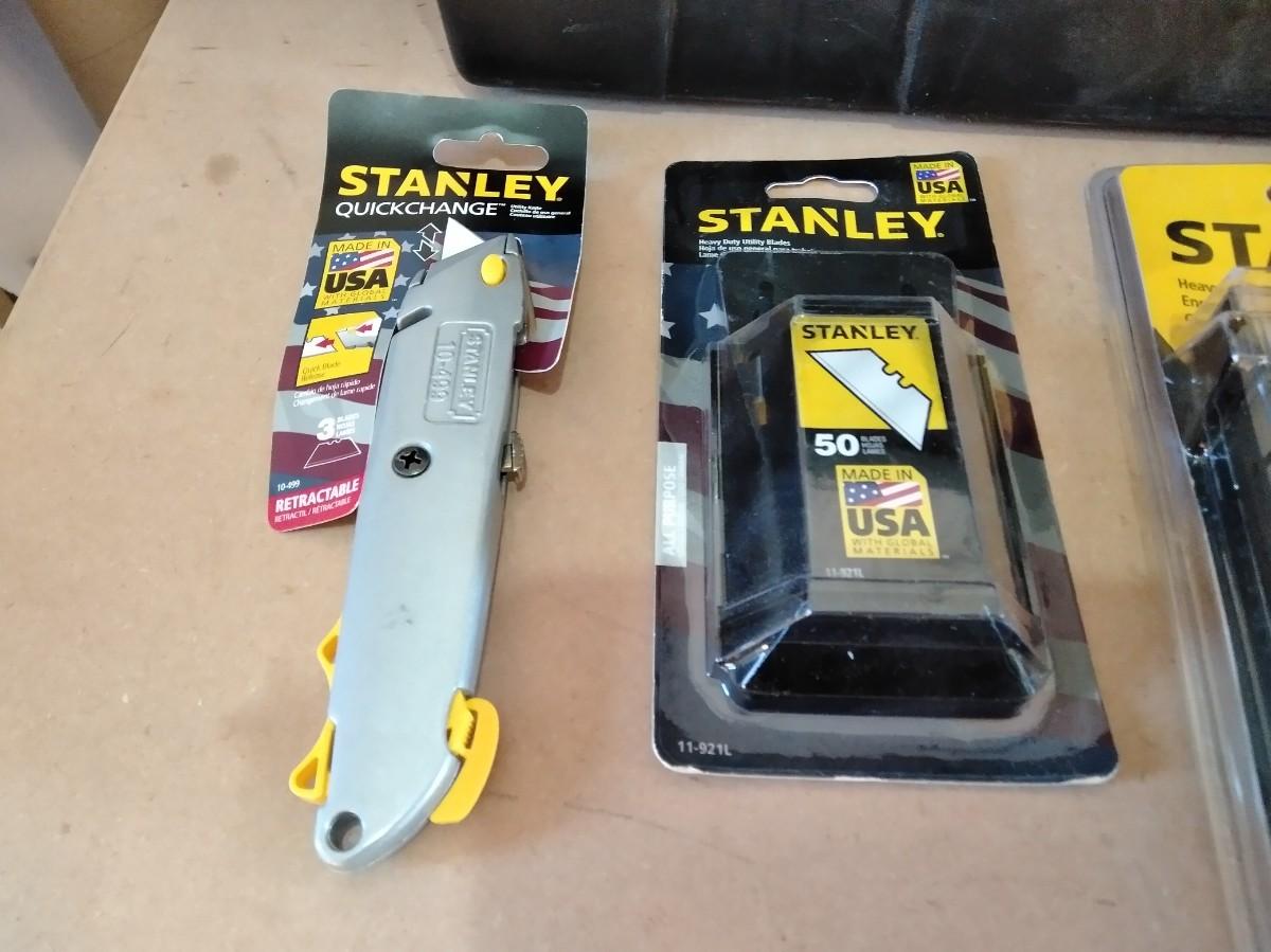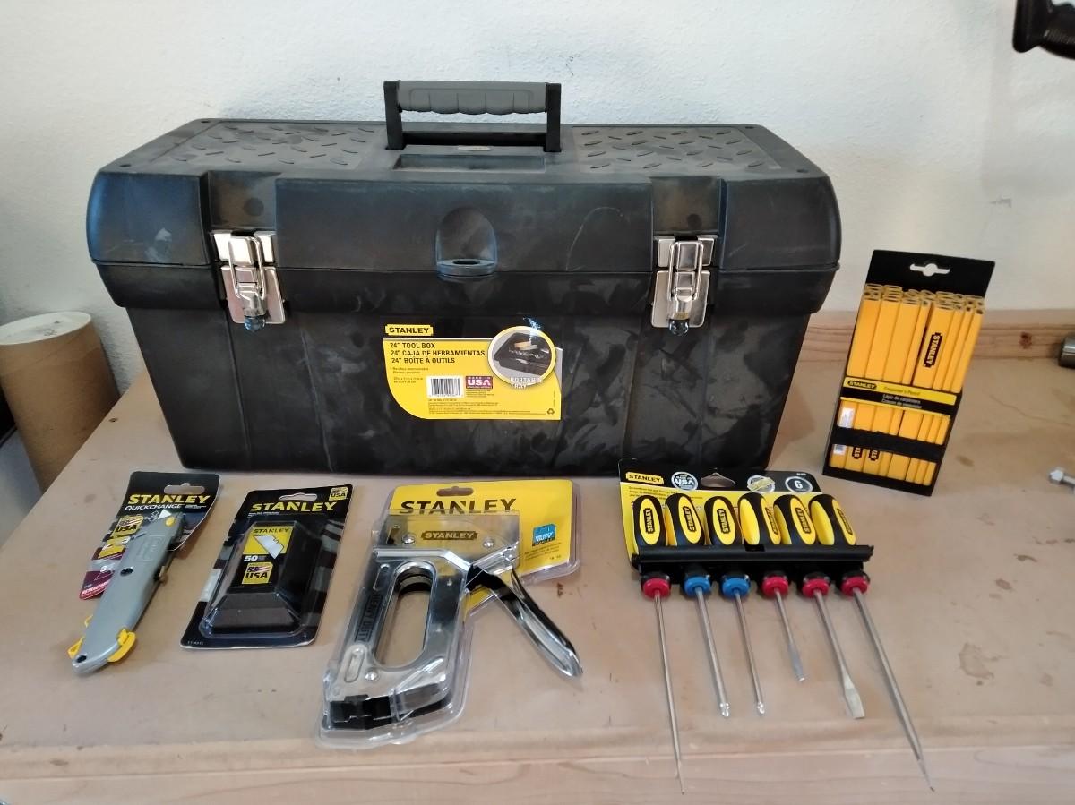 LARGE HEAVY PLASTIC STANLEY TOOLBOX WITH STANLEY SCREWDRIVER SET, STAPLER, UTILITY KNIFE, BLADES AND WOOD PENCILS.