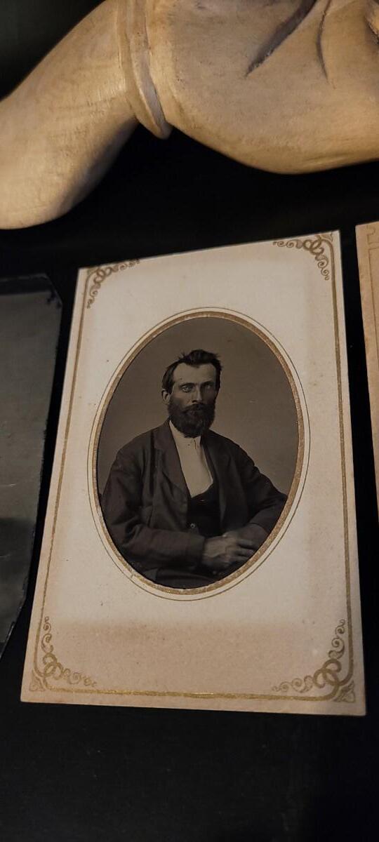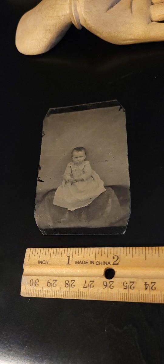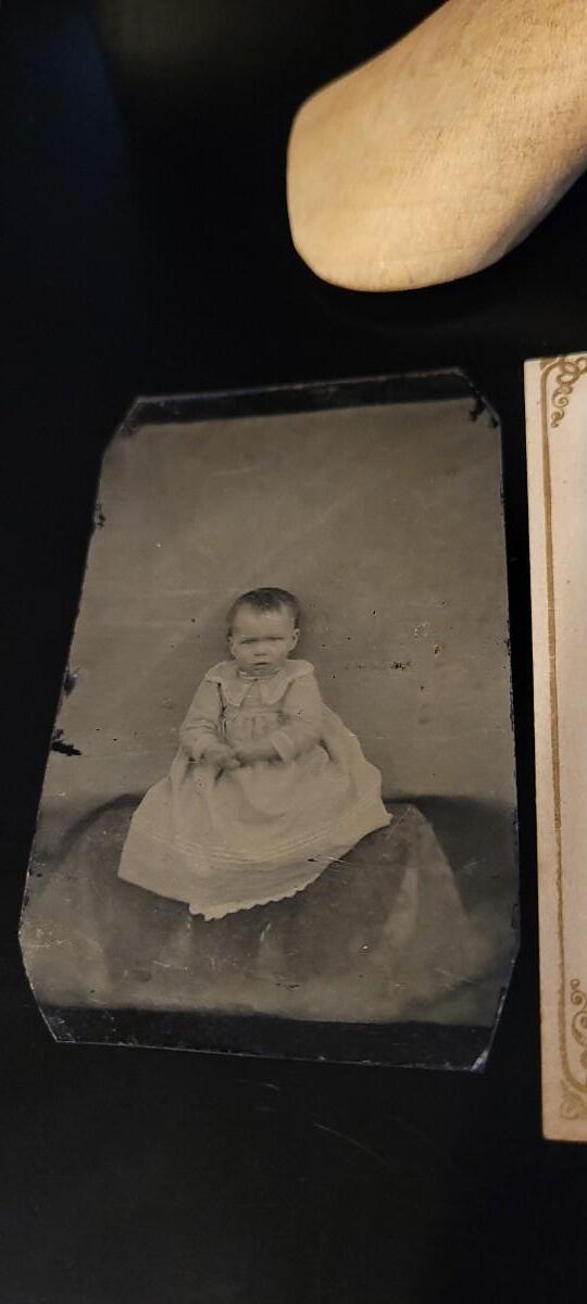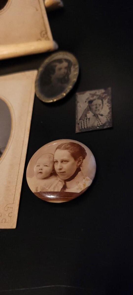 Very interesting group of Antique photo mementos. The cards with outer borders contain Tin Type Photos in addition to the Baby photo and the very small degraded image. The other two are in button presentation.