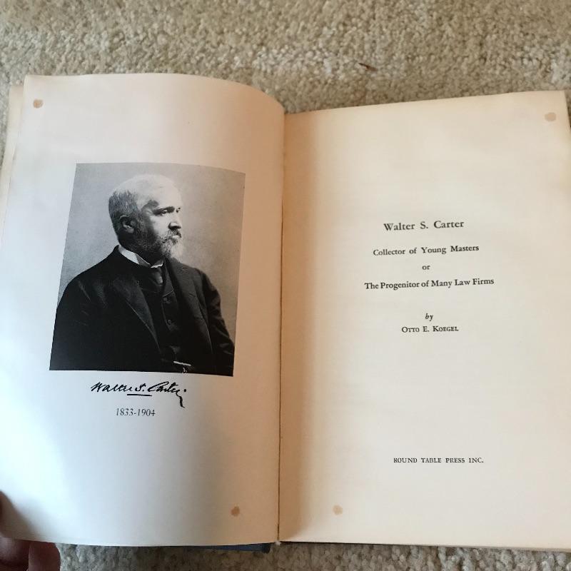 Walter S. Carter, Collector of Young Masters, or, The Progenitor of Many Law Firms by Otto E. Koegel. Copyright page states one year, 1953. Book shows some wear, see photos. Inscription appears to be addressed to Bernard Parker. Shipping available.