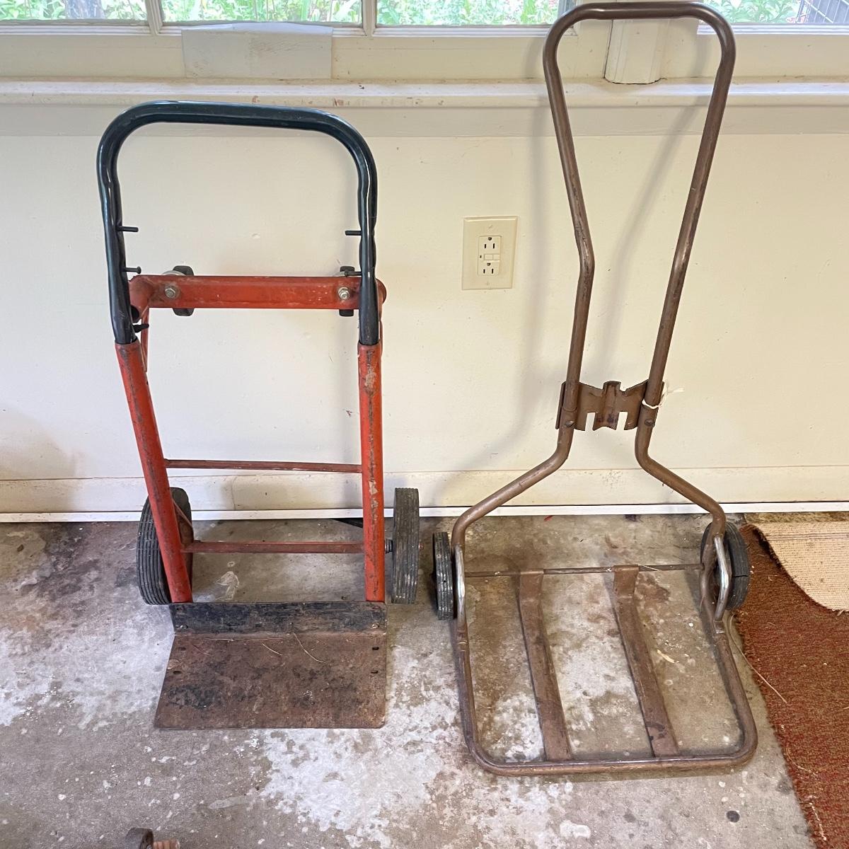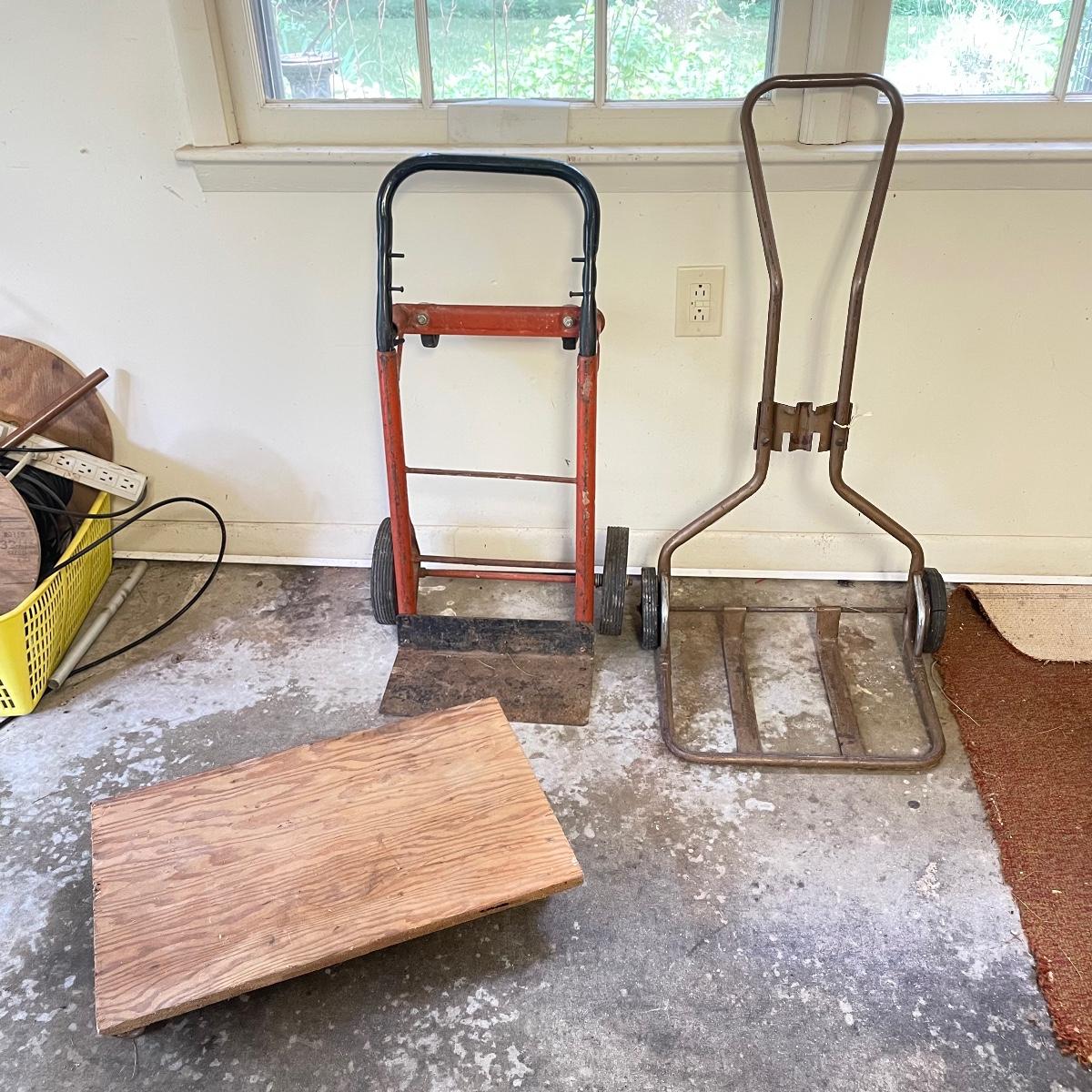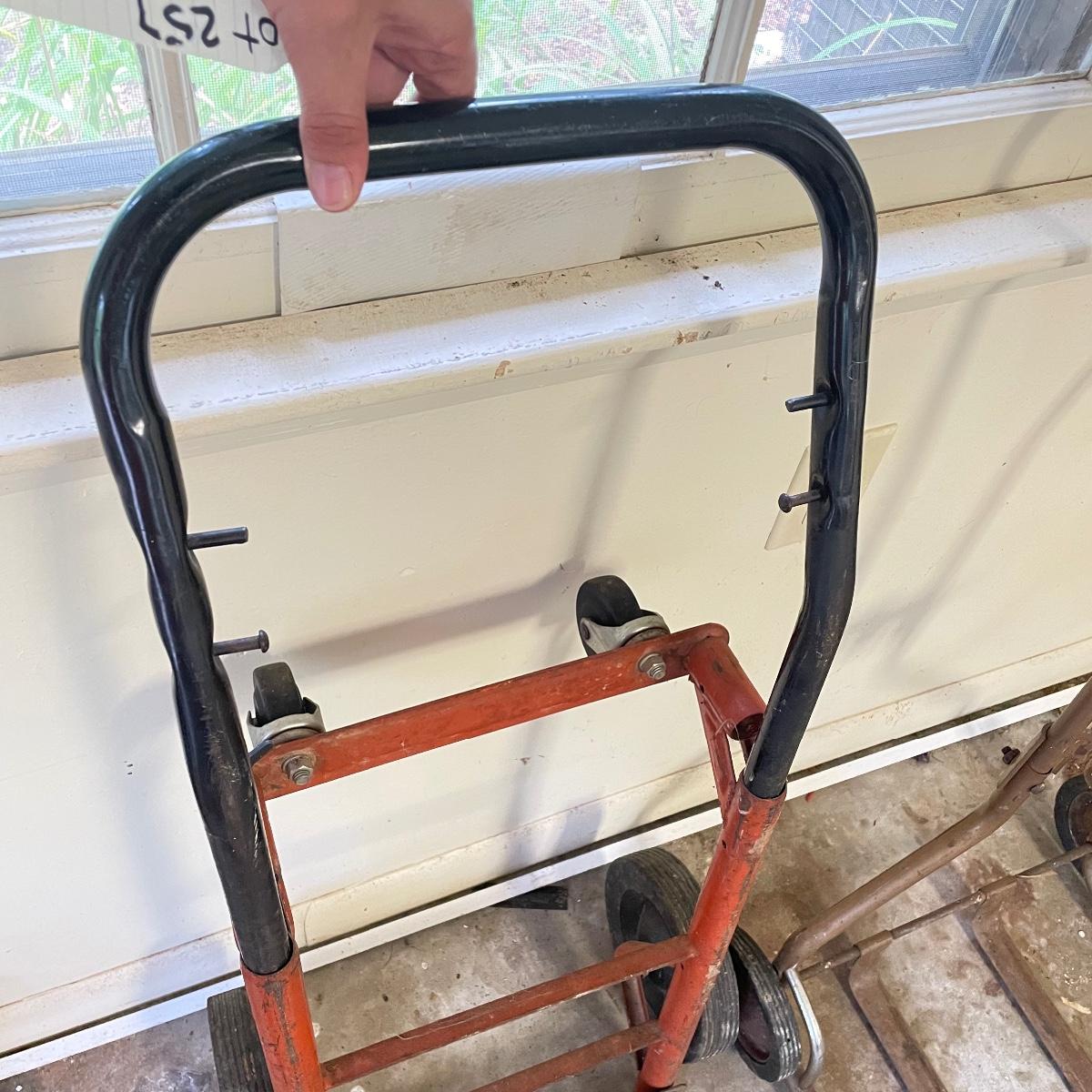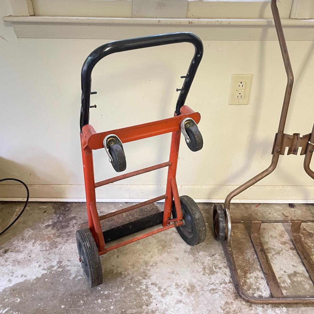 Two hand trucks and a wooden dolly for your larger moves. It’s always handy to have a few around. The orange hand truck has an adjustable handle, ranging from its current height at 32” to where the pin lock would be at 42”, wheel to wheel is 17” apart. This hand truck is missing a pin to lock it into the higher setting and the handle is currently loose. The second hand truck appears to be great for lighter objects, but we did not locate a weight capacity. This one is 36” tall with wheel to wheel measurements 20”. Lastly a sturdy 24” x 15” plywood dolly with metal wheels. See images. Local pick up only.