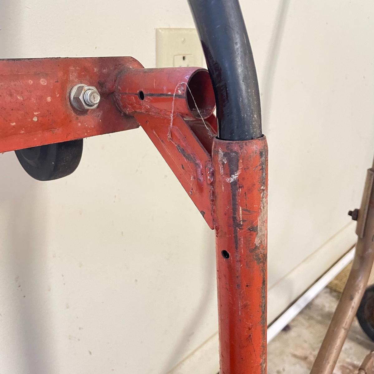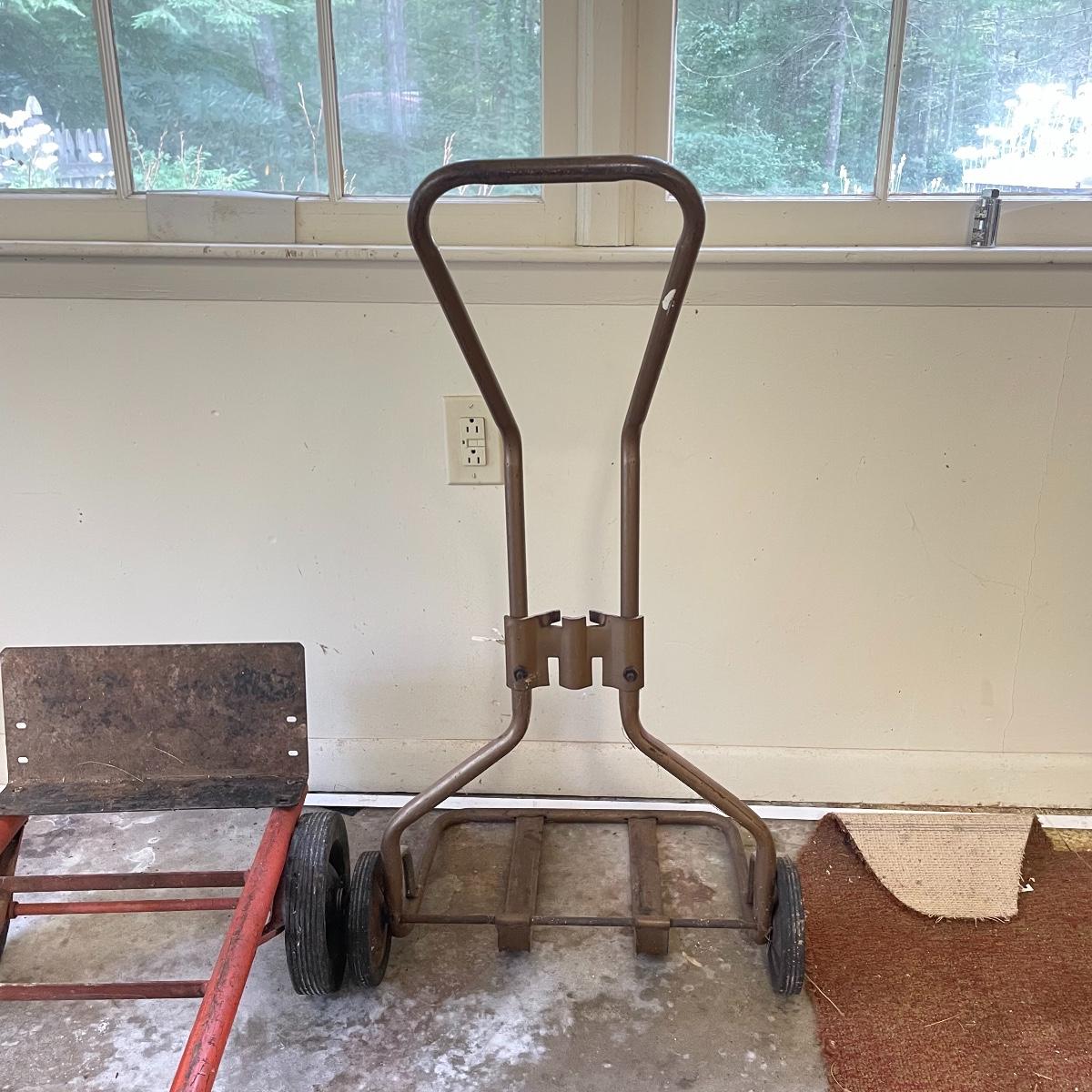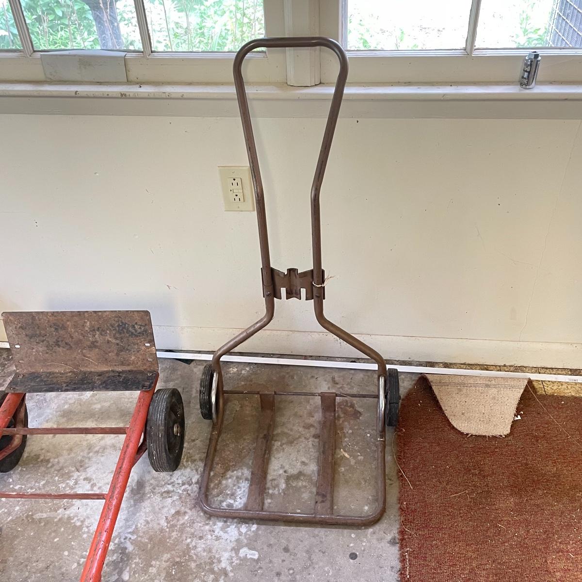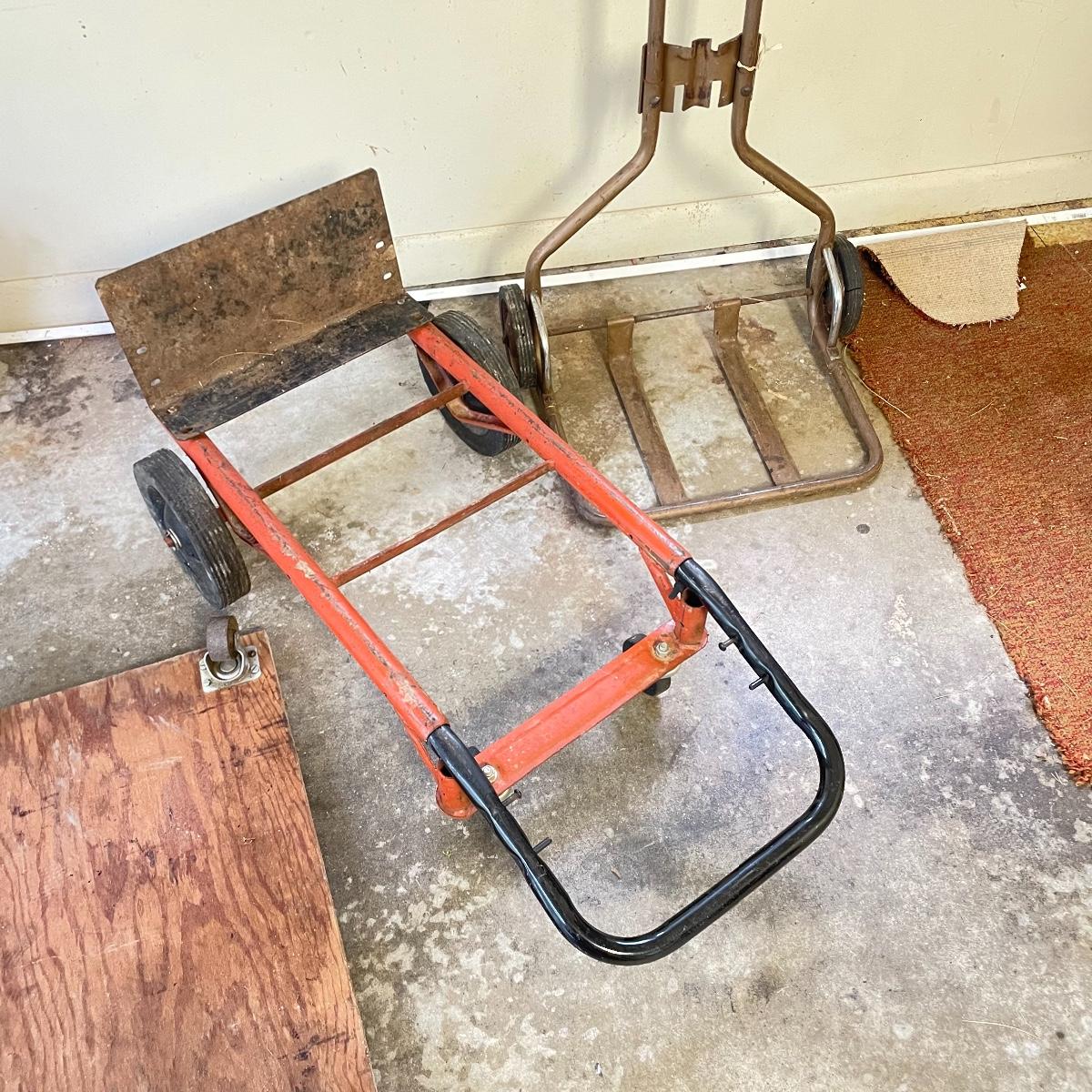 Two hand trucks and a wooden dolly for your larger moves. It’s always handy to have a few around. The orange hand truck has an adjustable handle, ranging from its current height at 32” to where the pin lock would be at 42”, wheel to wheel is 17” apart. This hand truck is missing a pin to lock it into the higher setting and the handle is currently loose. The second hand truck appears to be great for lighter objects, but we did not locate a weight capacity. This one is 36” tall with wheel to wheel measurements 20”. Lastly a sturdy 24” x 15” plywood dolly with metal wheels. See images. Local pick up only.