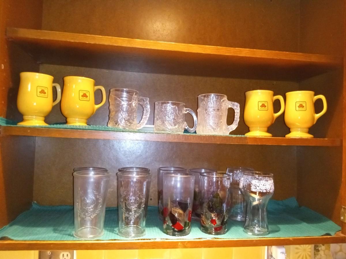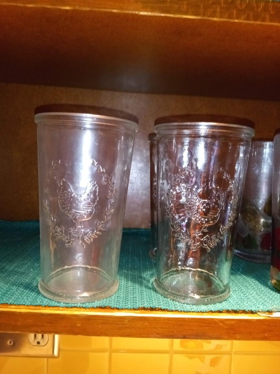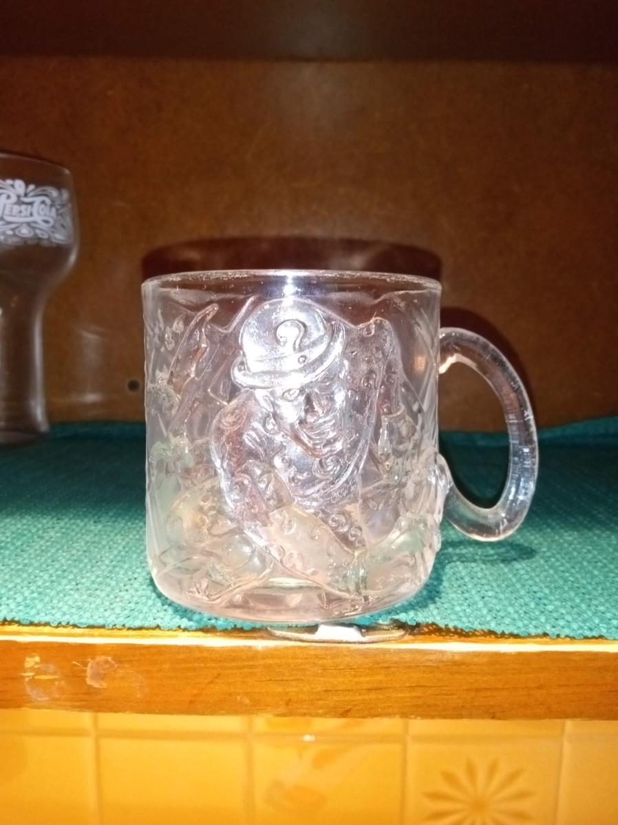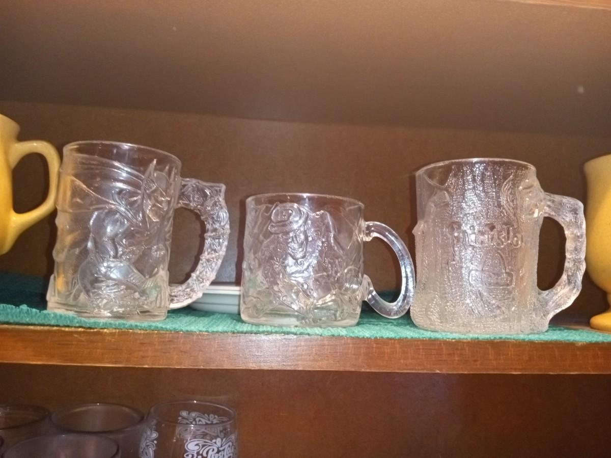 4 GLASSES WITH RAISED ROOSTERS, 4 MOSAIC-LIKE GLASSES, 2 PEPSI COLA, 4 STATE FARM COFFEE MUGS, 2 BATMAN FOREVER MCDONALD'S GLASS CUPS, 1 FLINTSTONES MCDONALD'S GLASS CUP