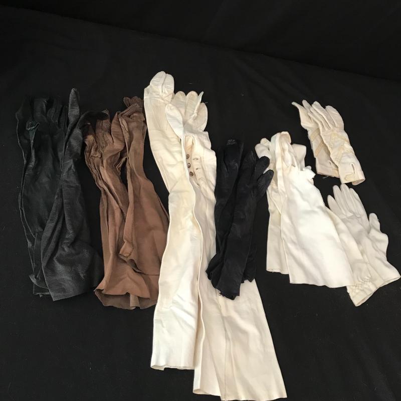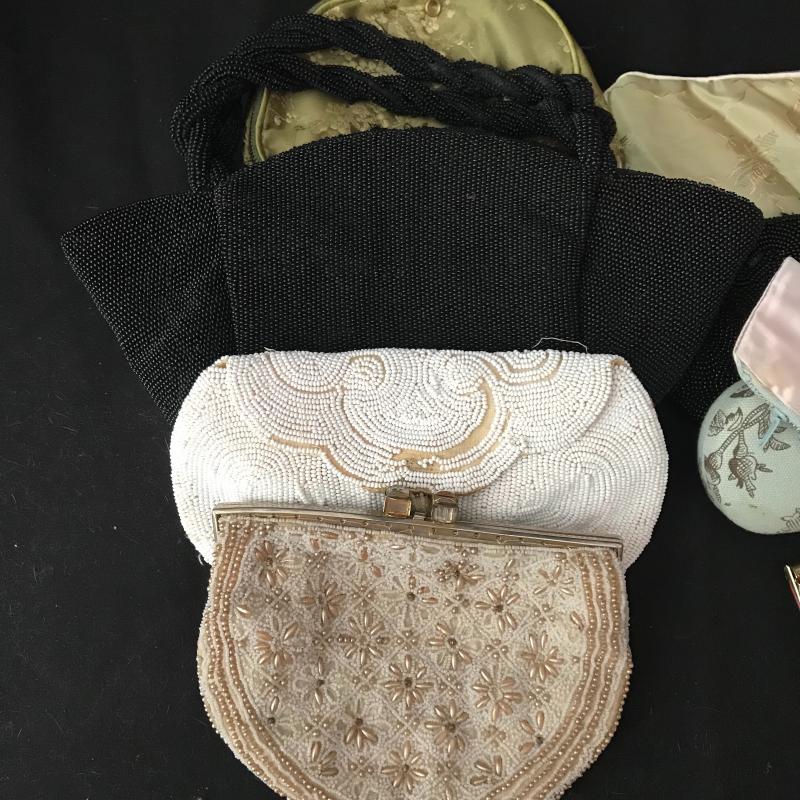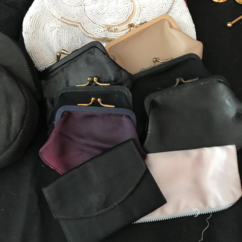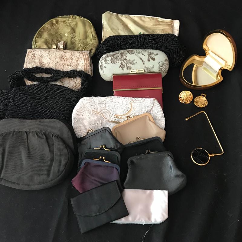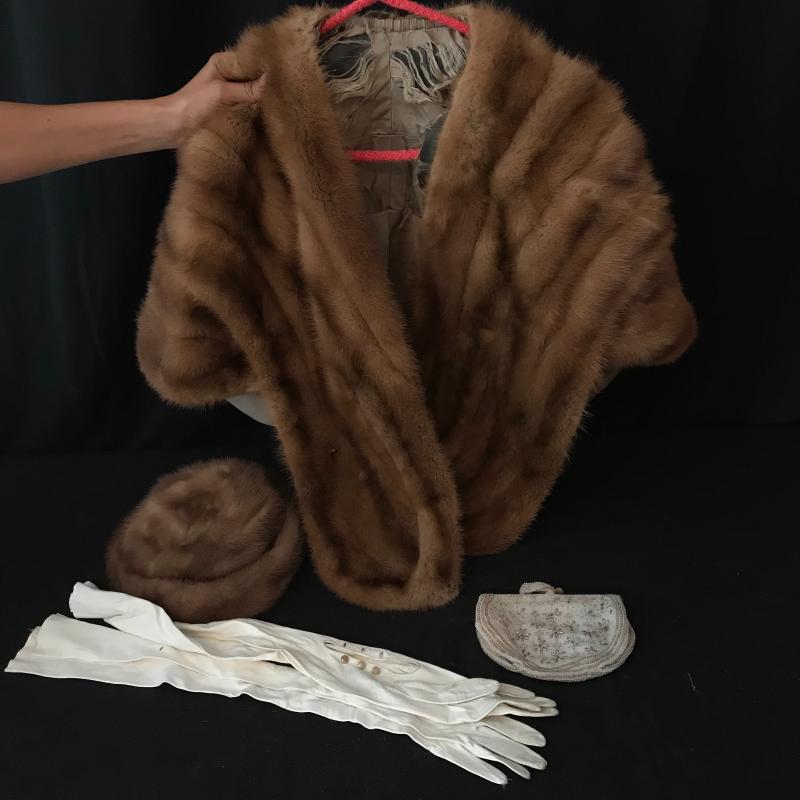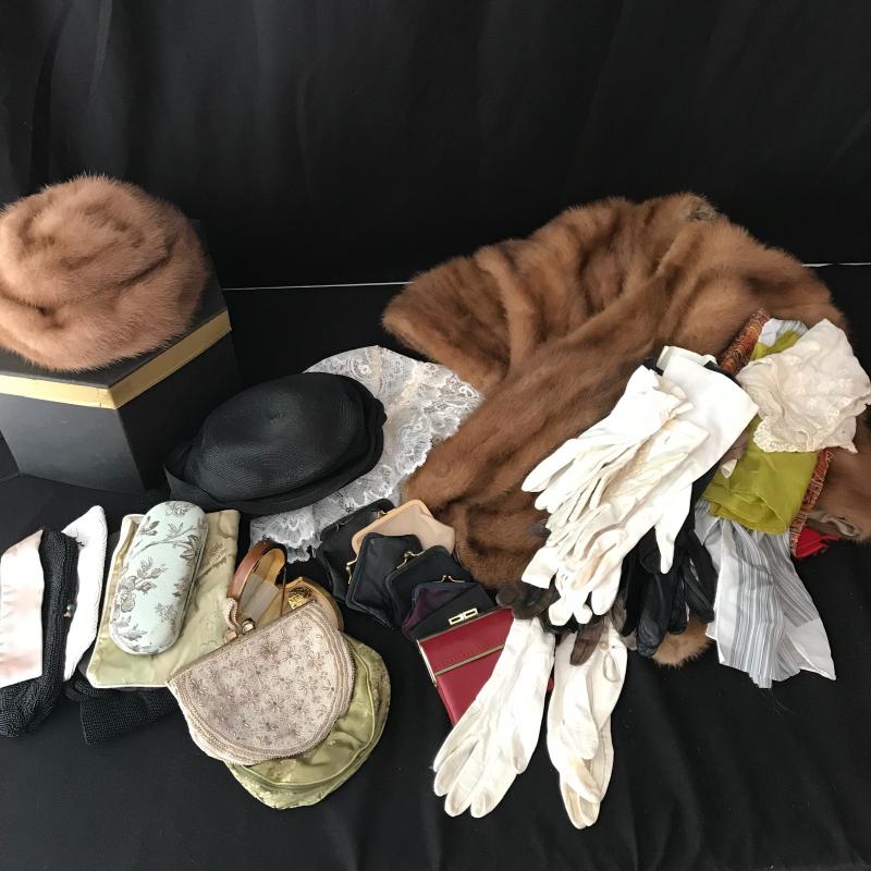 Stunning lot of accessories! Three vintage hats, one is fur (made in Asheville, hat box included!) Fur pullover has pockets and is need of new lining, see photos) Seven pairs of gloves: brown, navy, black, white and ivory. Beaded clutches, a plethora of coin purses to match any occasion, a few handkerchiefs, a purse hook, glasses case, and clamshell case to begin or beef up your vintage collection. See photos. Shipping available.