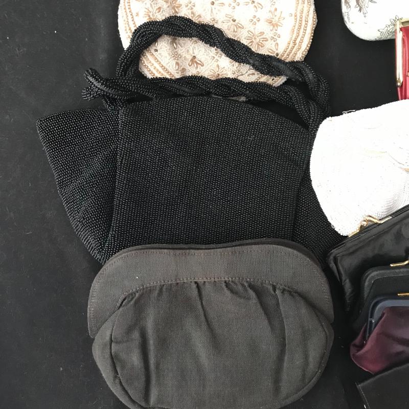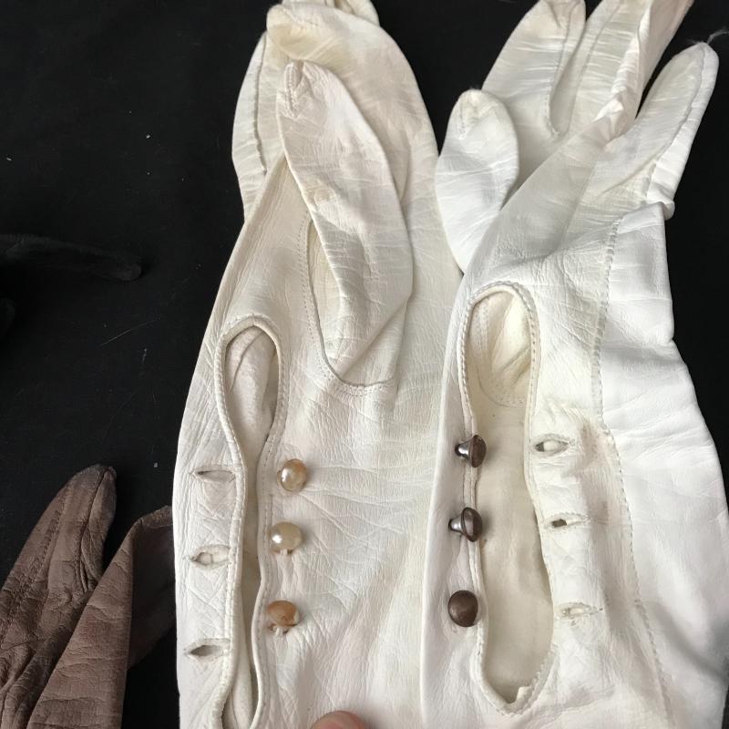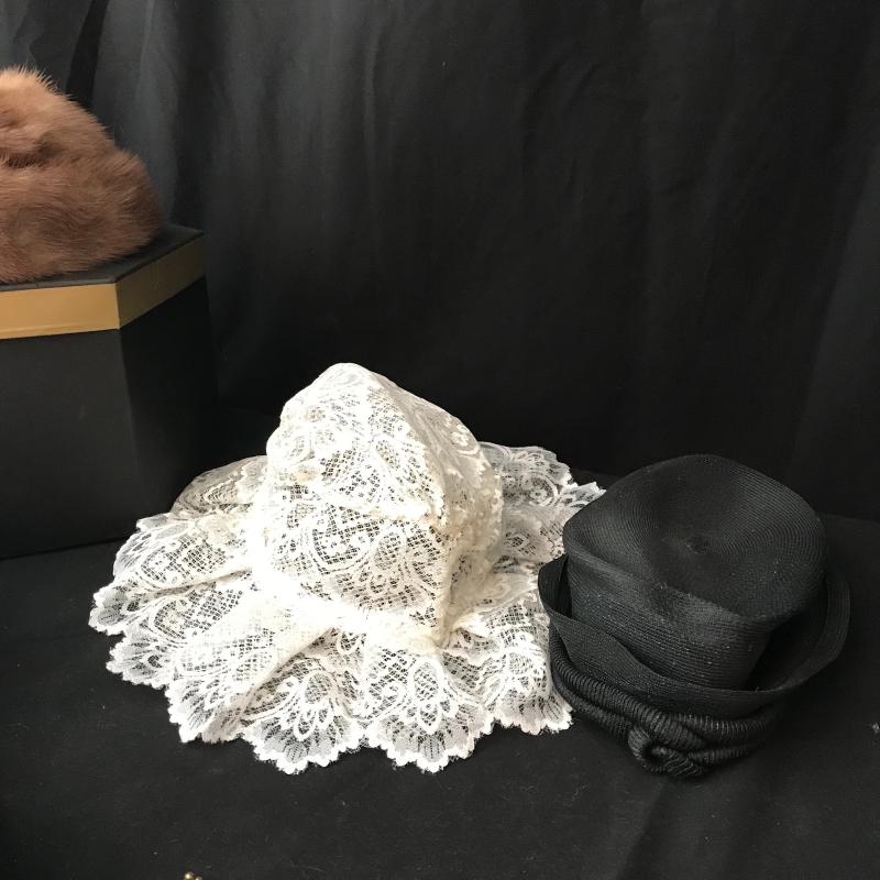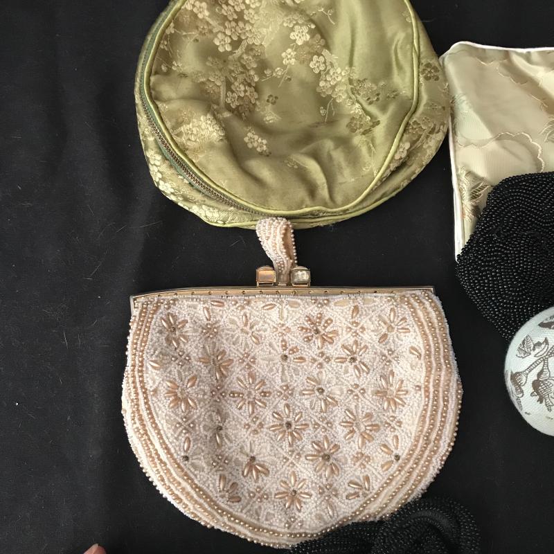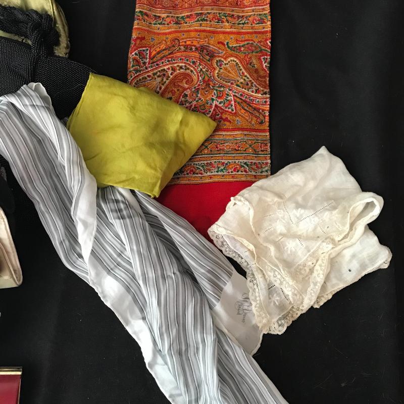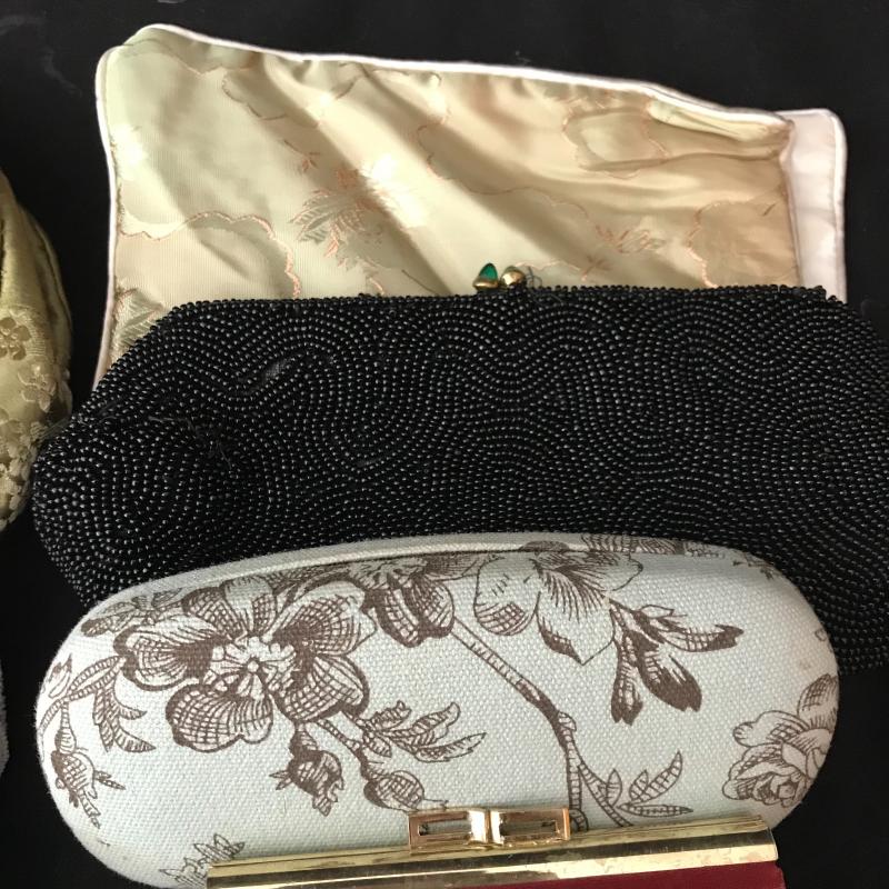 Stunning lot of accessories! Three vintage hats, one is fur (made in Asheville, hat box included!) Fur pullover has pockets and is need of new lining, see photos) Seven pairs of gloves: brown, navy, black, white and ivory. Beaded clutches, a plethora of coin purses to match any occasion, a few handkerchiefs, a purse hook, glasses case, and clamshell case to begin or beef up your vintage collection. See photos. Shipping available.