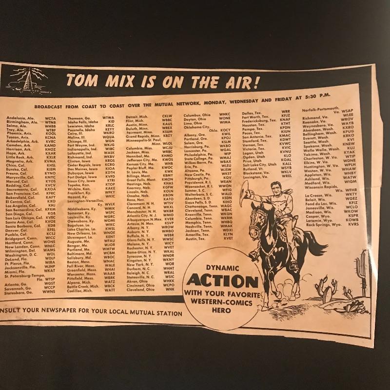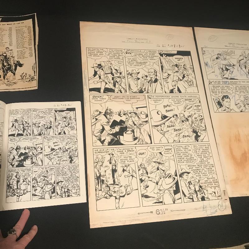 Lot contains two boards of what appears to be original art for Tom Mix Comics. One is a half page from issue #27 and one is a full page from issue #34. Also in lot is the catalog likely used to order these (see pix). Also listing of broadcast stations for Tom Mix which is the bottom of the half page art. Shipping available.