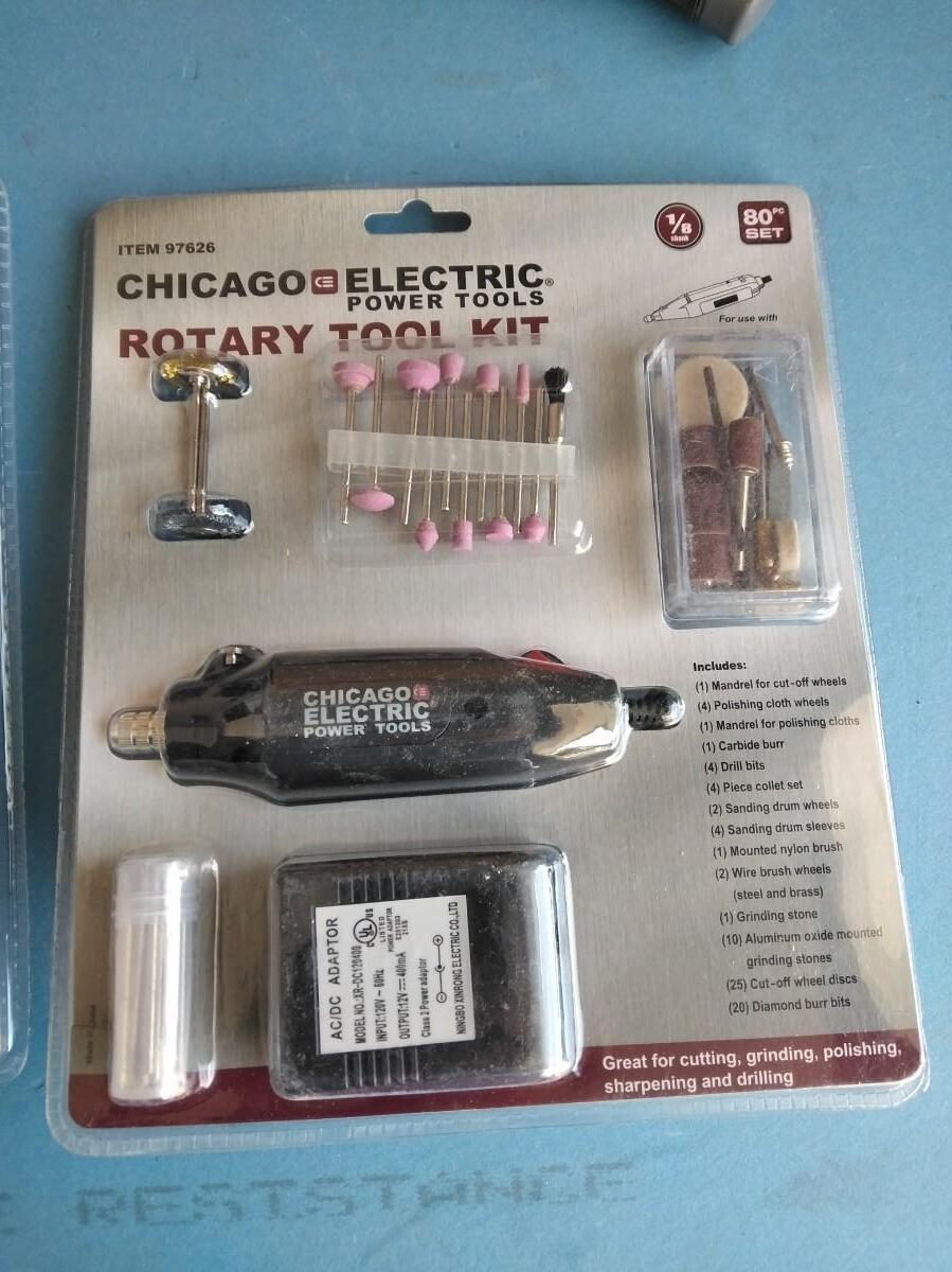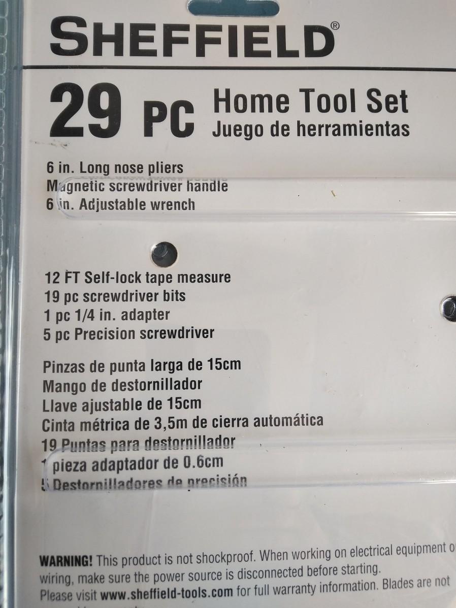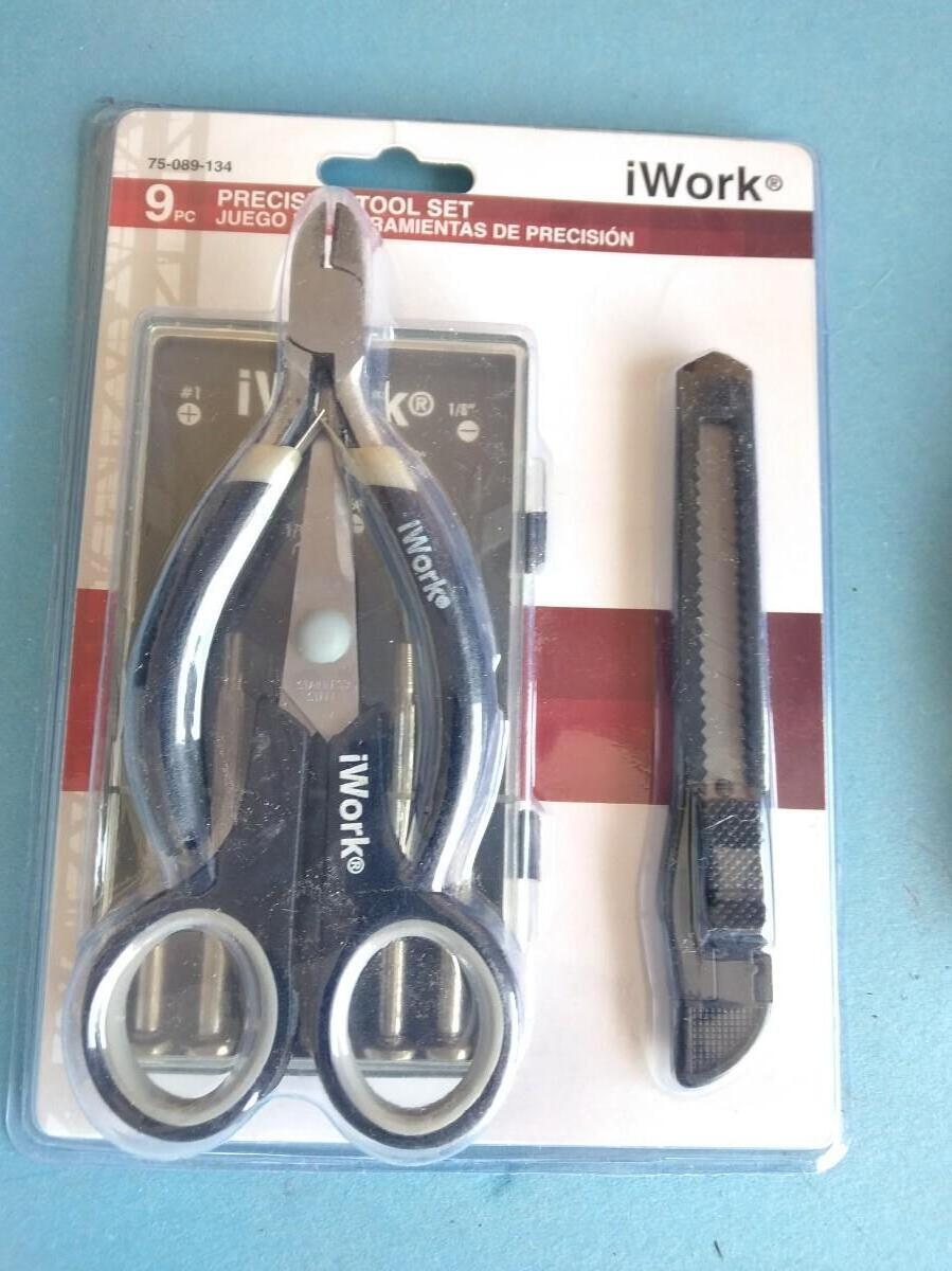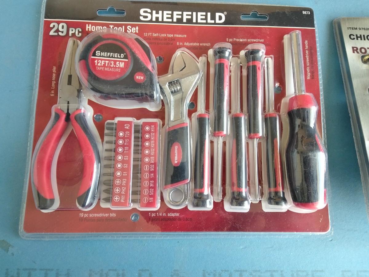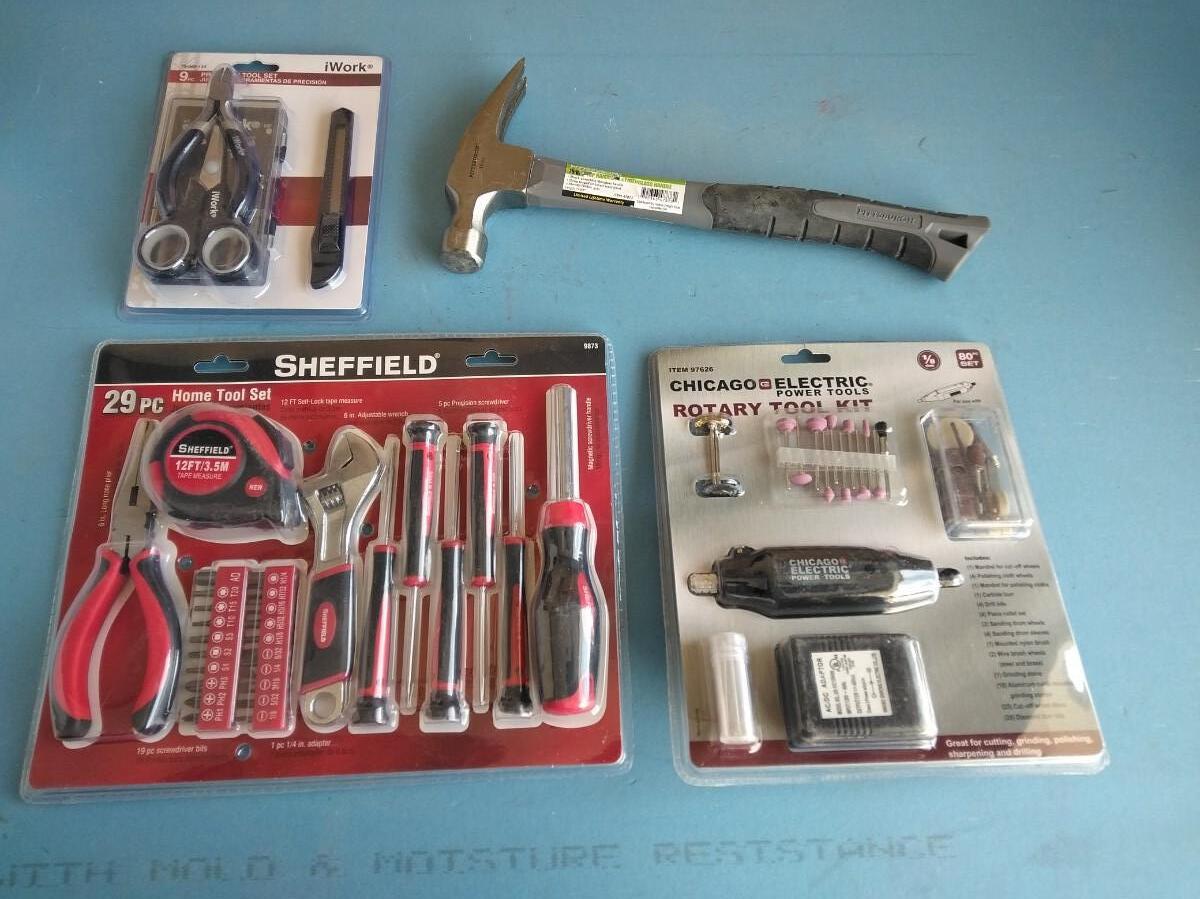 TWO HOME TOOL KITS, ONE SHEFFIELD 29 PIECE, ONE IWORK SMALL SCREWDRIVER, WIRE CUTTERS, SCISSORS AND UTILITY KNIFE SET, CHICAGO ELECTRIC ROTARY TOOL KIT, AND A NEW CLAW HAMMER.