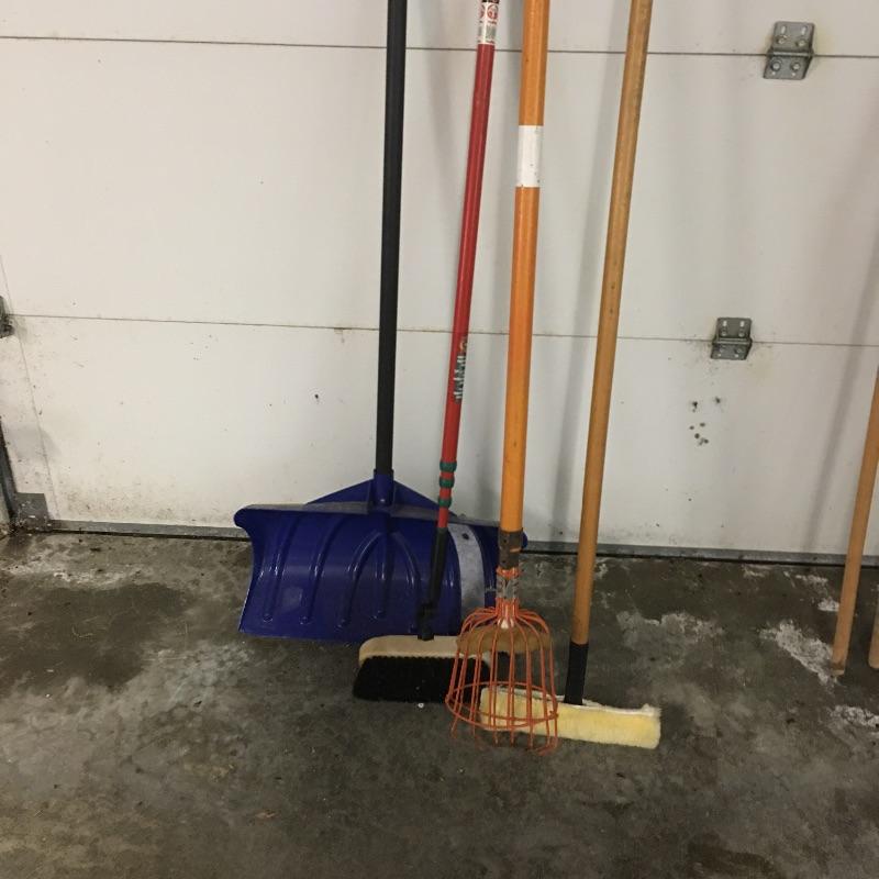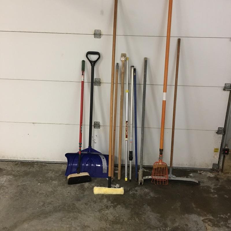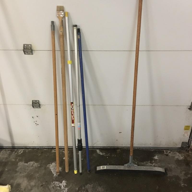 Outdoor tools. Lot includes snow shovel, apple picker, squeegee, extension poles and a pipe bender. You can never have too many tools.