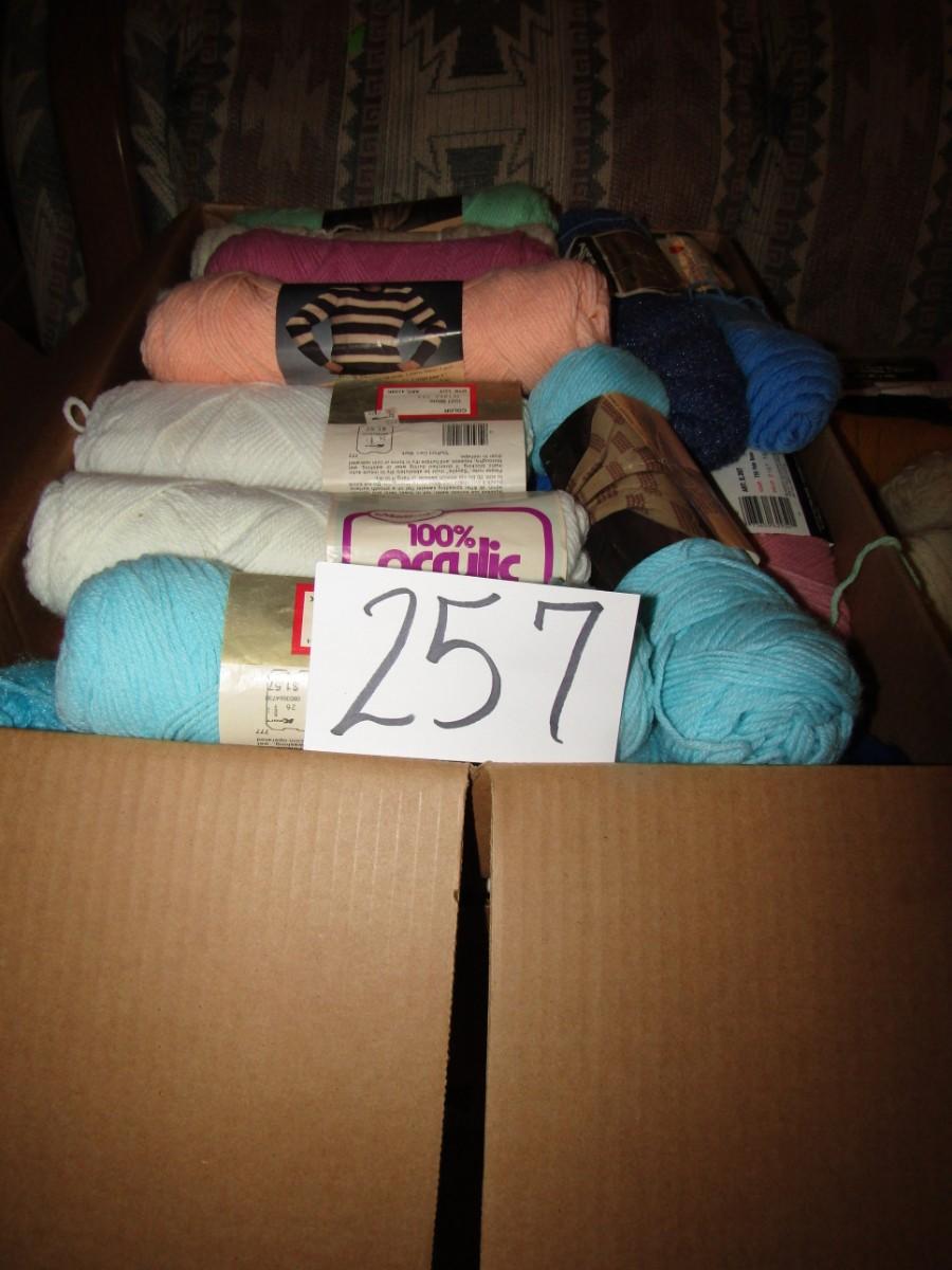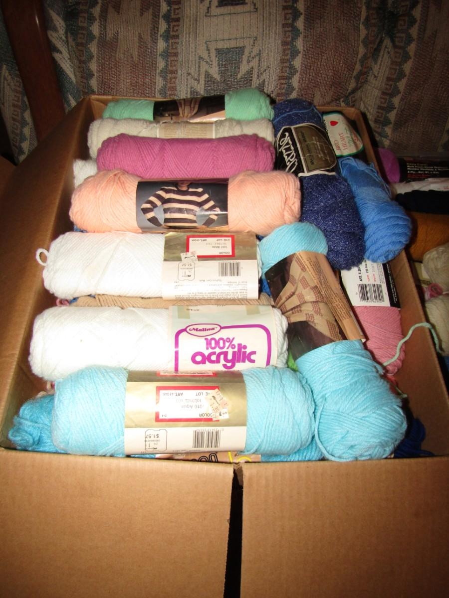 LARGE BOX OF SKEINS OF YARN. MANY COLORS
