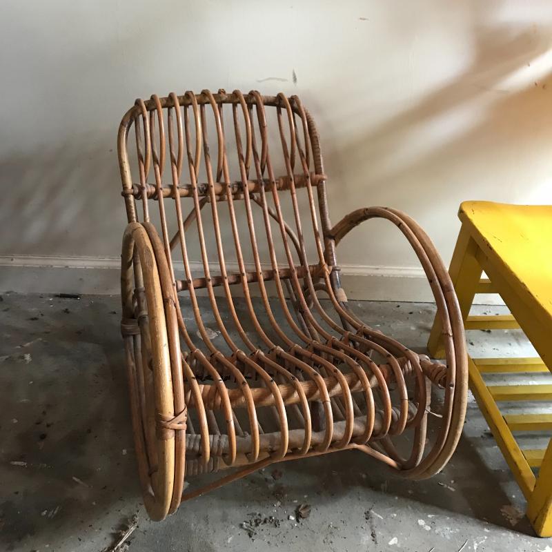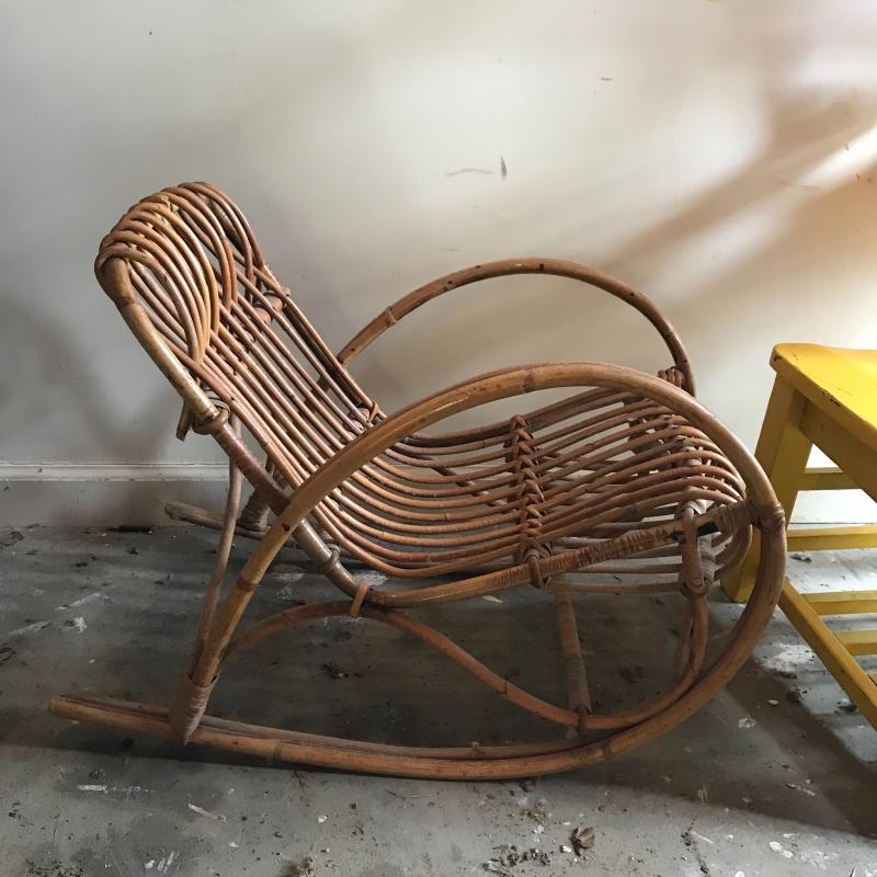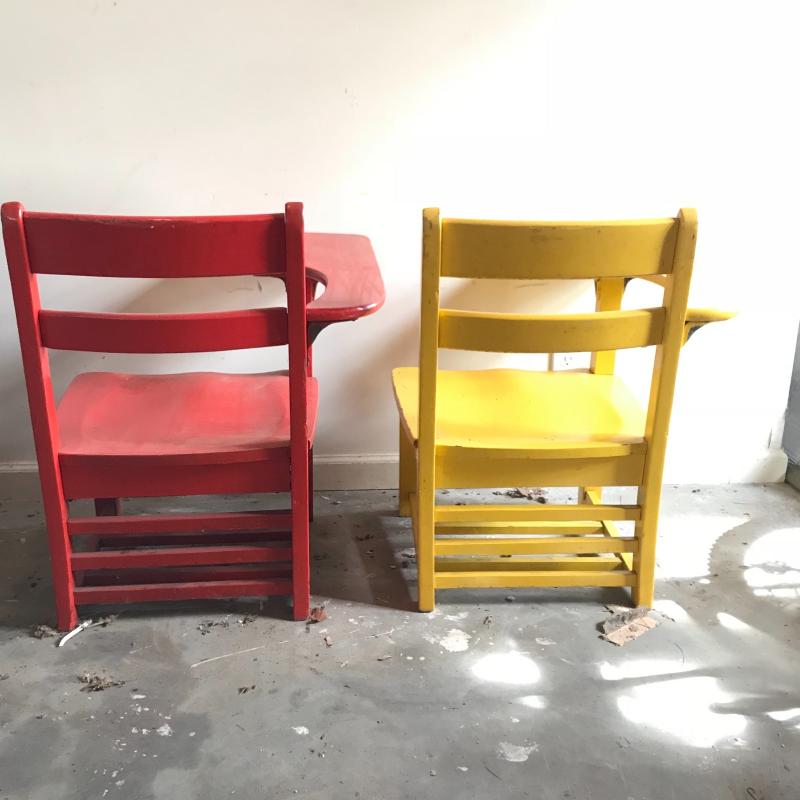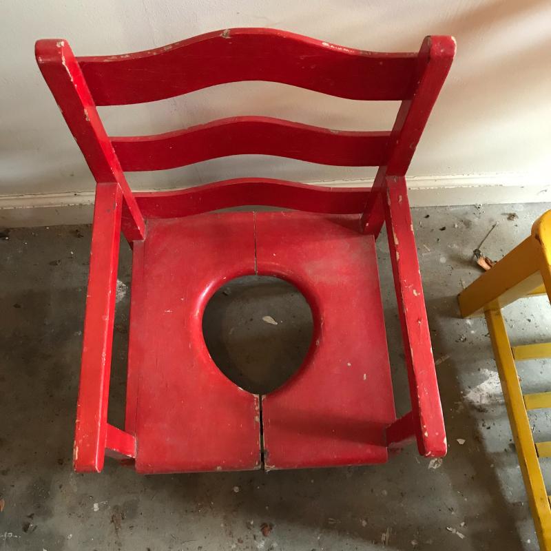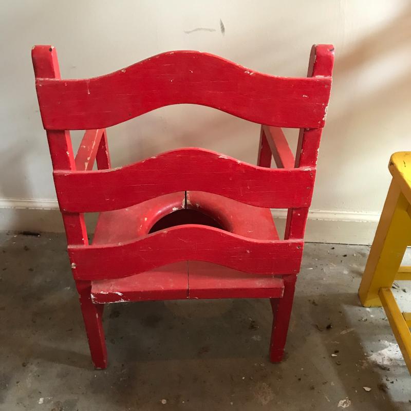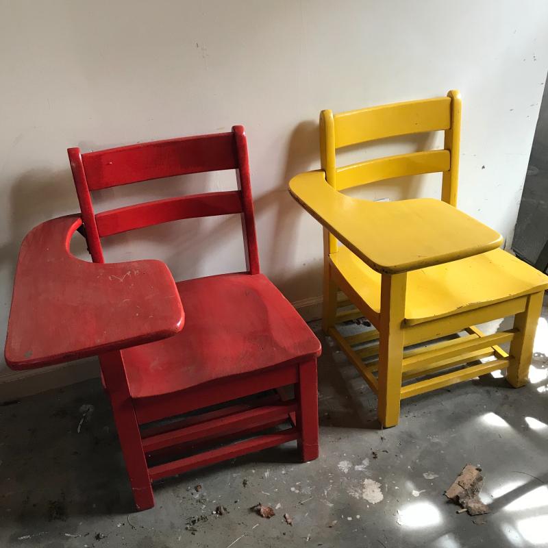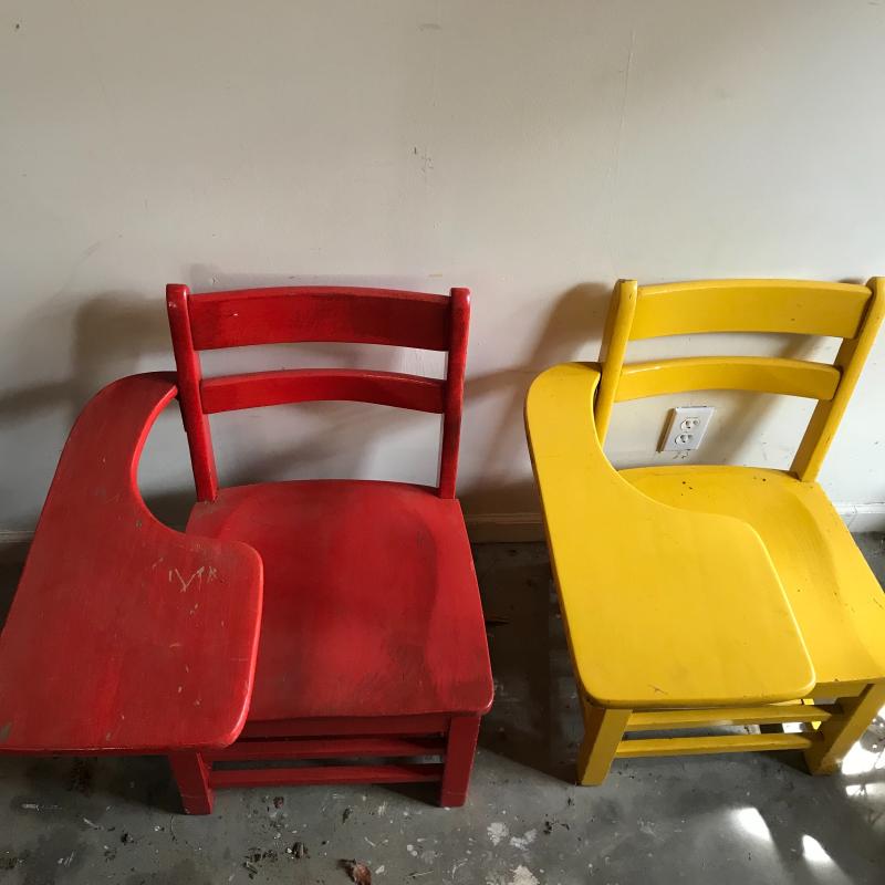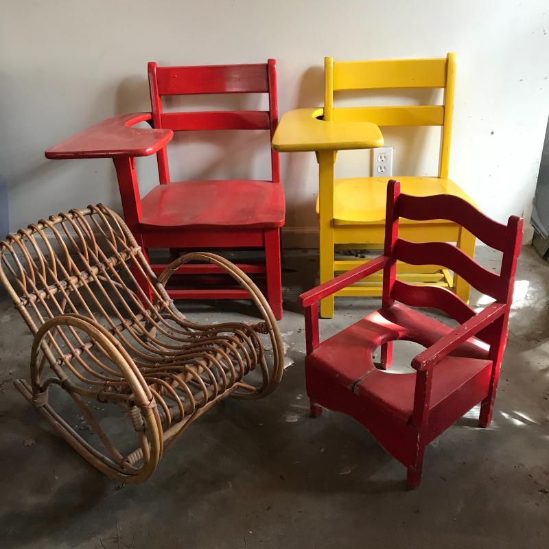 Look at these adorable vintage finds! Red and yellow school desks are probably solid wood and very sturdy. Desks have metal fixtures joining desk top to seat. Some paint needs touched up, but still in excellent shape. Desks are accompanied by a red toilet training seat and small rocker. All seats need a little cleaning and rocker needs some repairs/stabilization if used by a child. No shipping.
