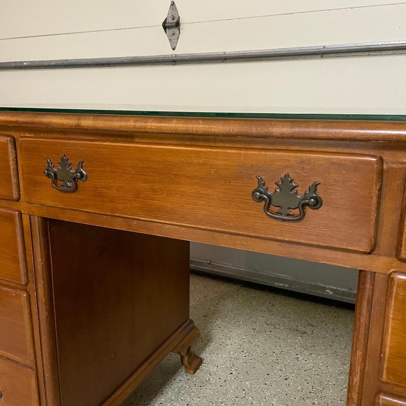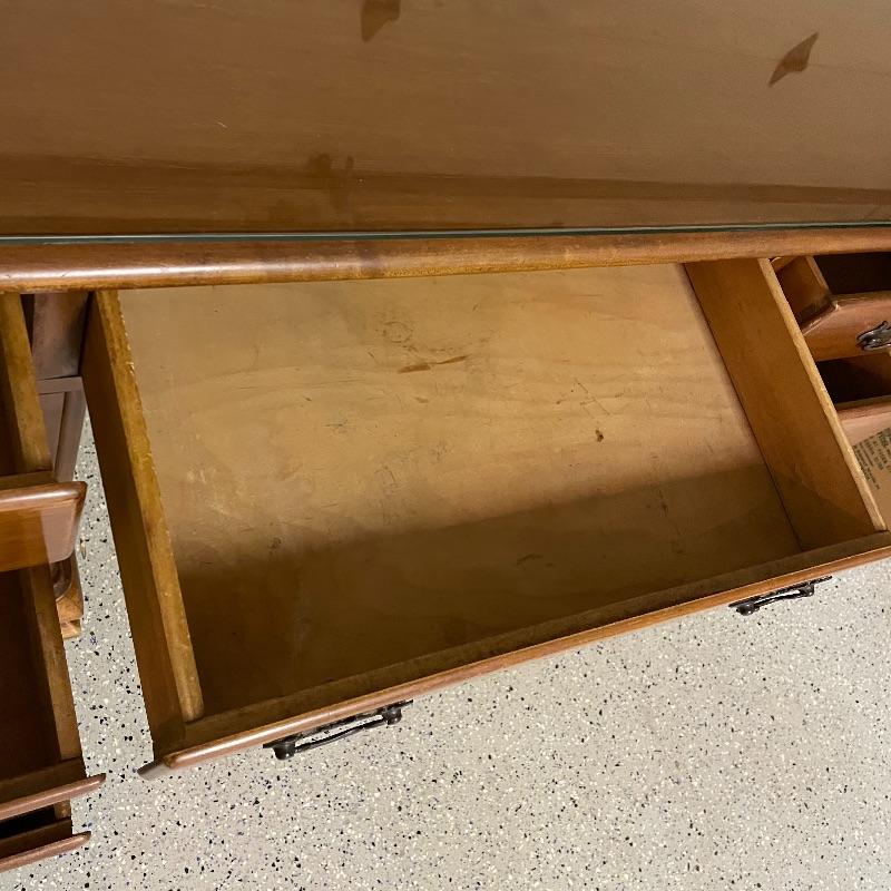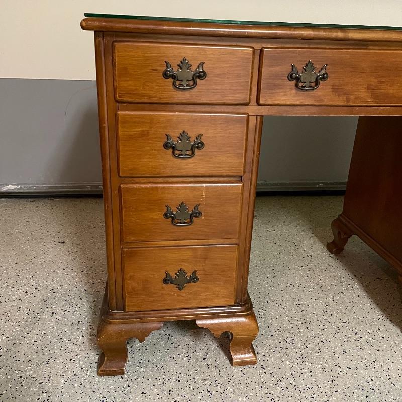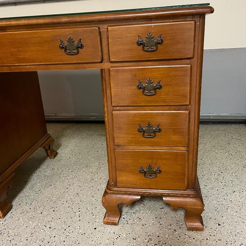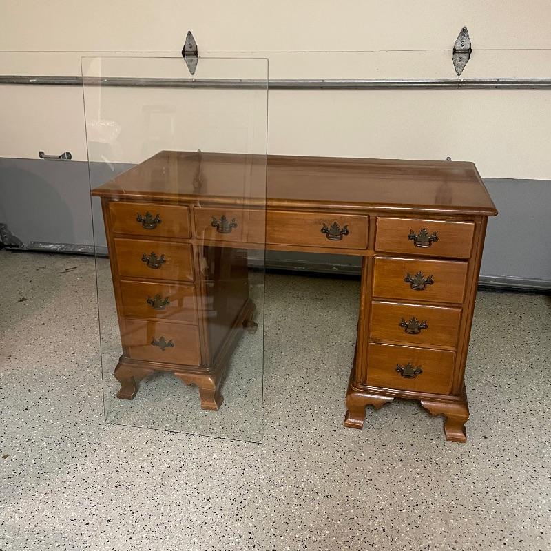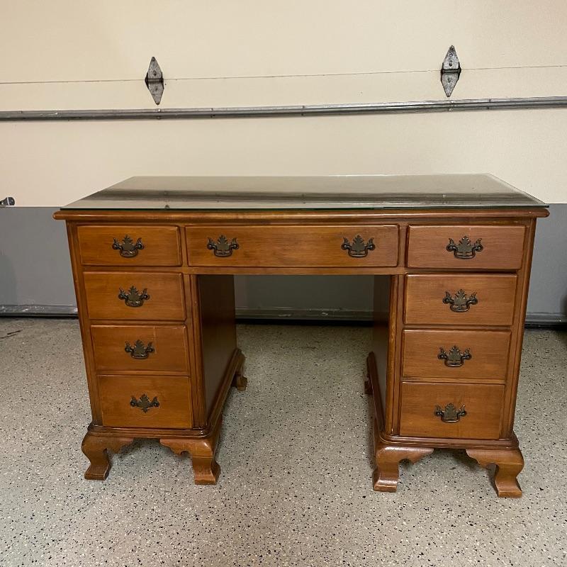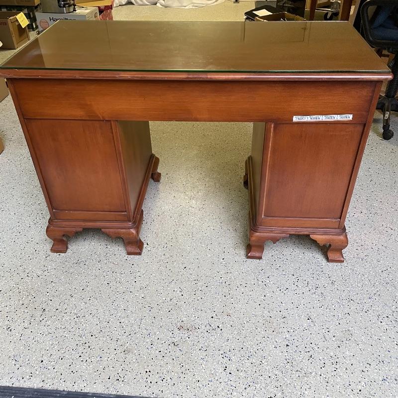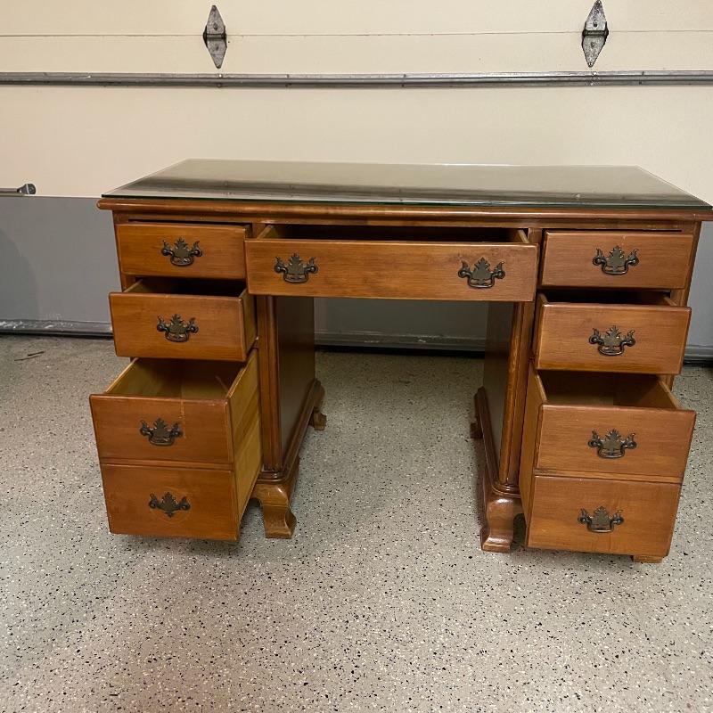 This is a great find for those in need of organization and a place to work. This medium brown desk appears to be mostly solid wood with plywood drawer bottoms. Finished on all the sides except the bottom, piece measures approximately 45.5” x 22” x 30.5”. This desk also has seven dovetail drawers for organizing, including filing drawers with faux double drawer handle, one is missing it’s metal pull, but doesn’t affect the drawer’s capability. The perfectly sized glass top has kept it in nice condition, but there are some minor blemishes noted in photos. Local pick up only. Please bring help to load. Desk is conveniently located in garage.