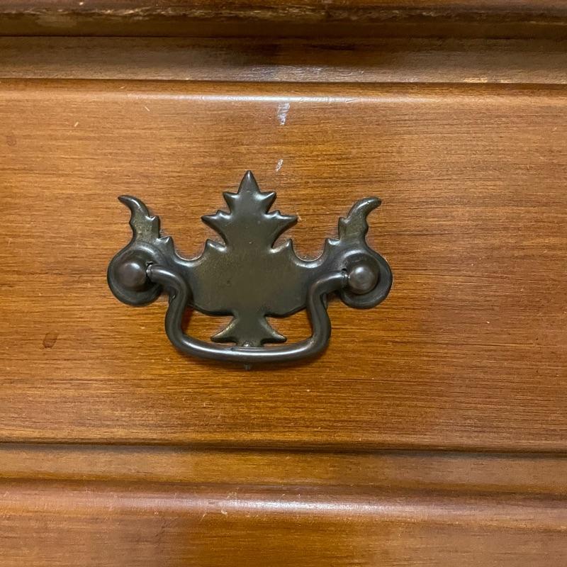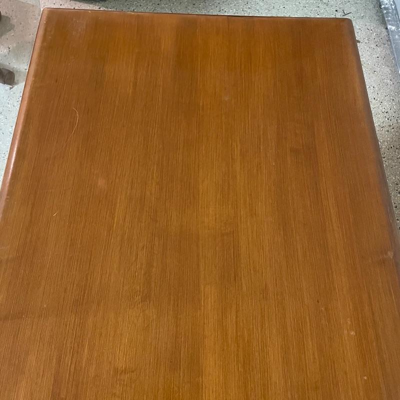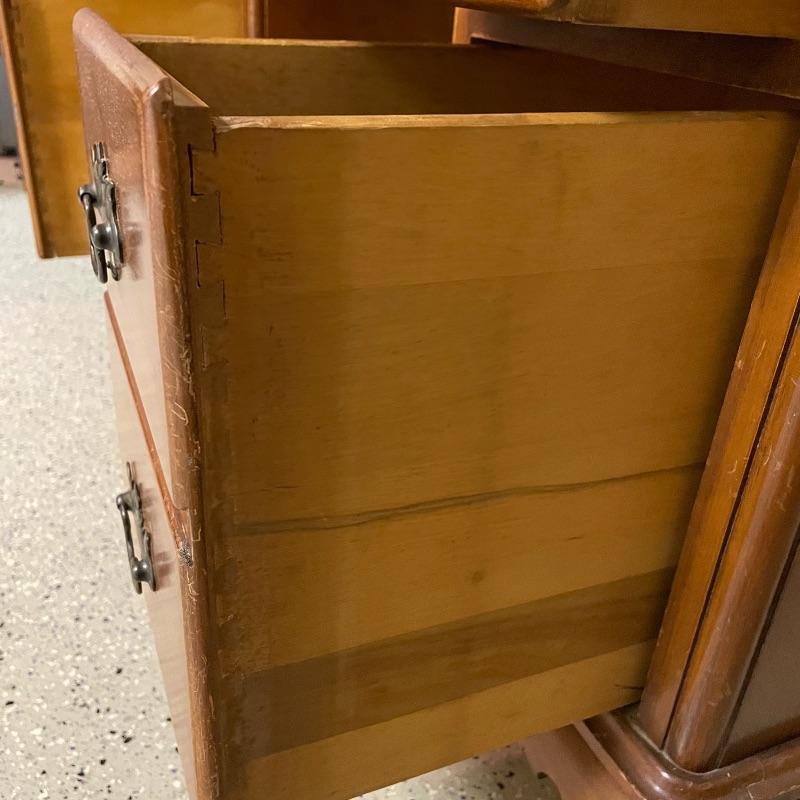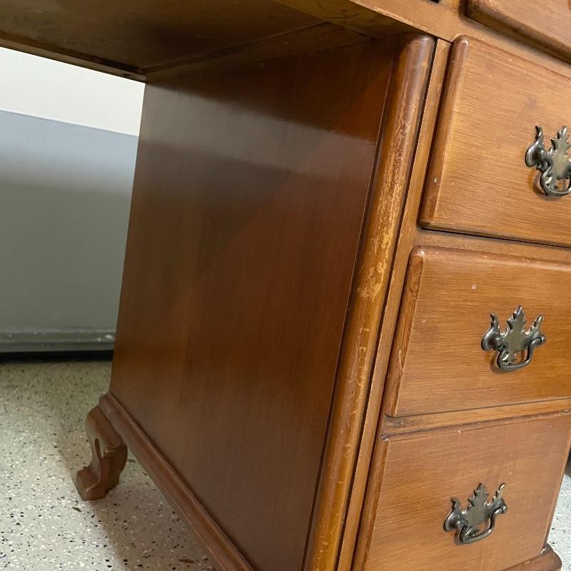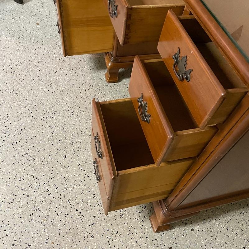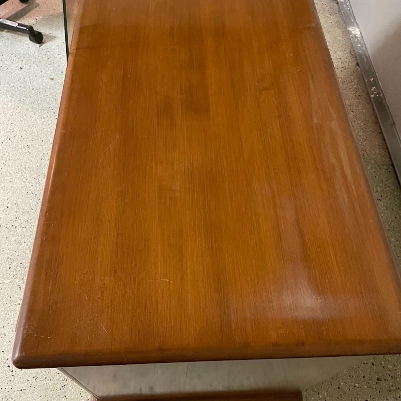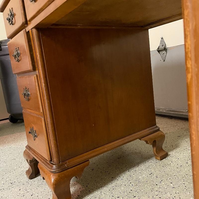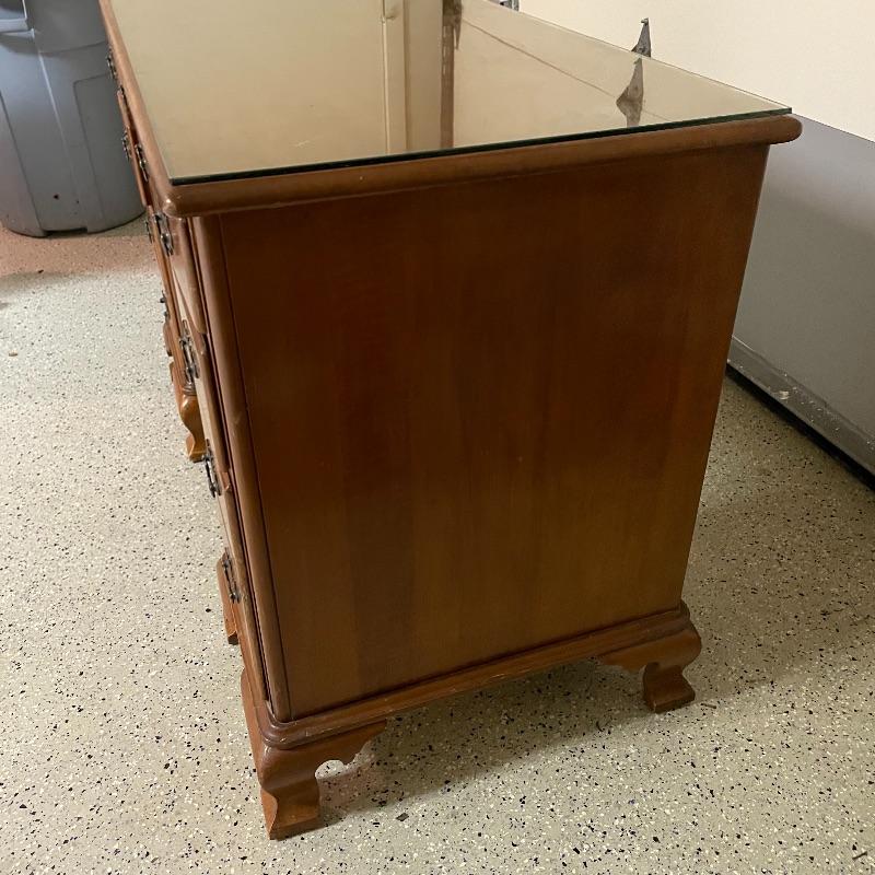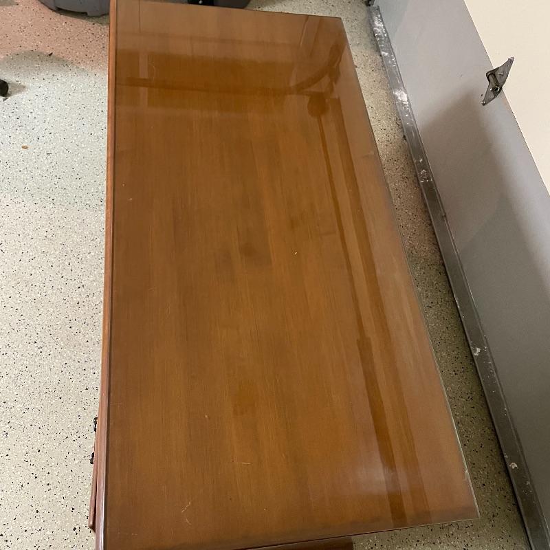 This is a great find for those in need of organization and a place to work. This medium brown desk appears to be mostly solid wood with plywood drawer bottoms. Finished on all the sides except the bottom, piece measures approximately 45.5” x 22” x 30.5”. This desk also has seven dovetail drawers for organizing, including filing drawers with faux double drawer handle, one is missing it’s metal pull, but doesn’t affect the drawer’s capability. The perfectly sized glass top has kept it in nice condition, but there are some minor blemishes noted in photos. Local pick up only. Please bring help to load. Desk is conveniently located in garage.