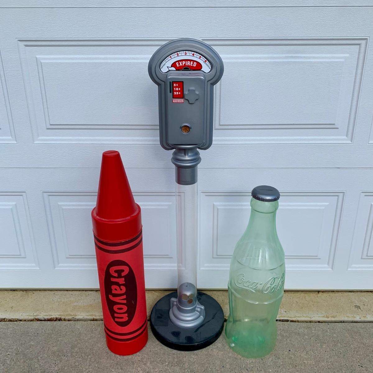 LOT 258 A: 1990's Plastic Coin Banks; Coca Cola Bottle, Red Crayola Crayon, & Parking Meter